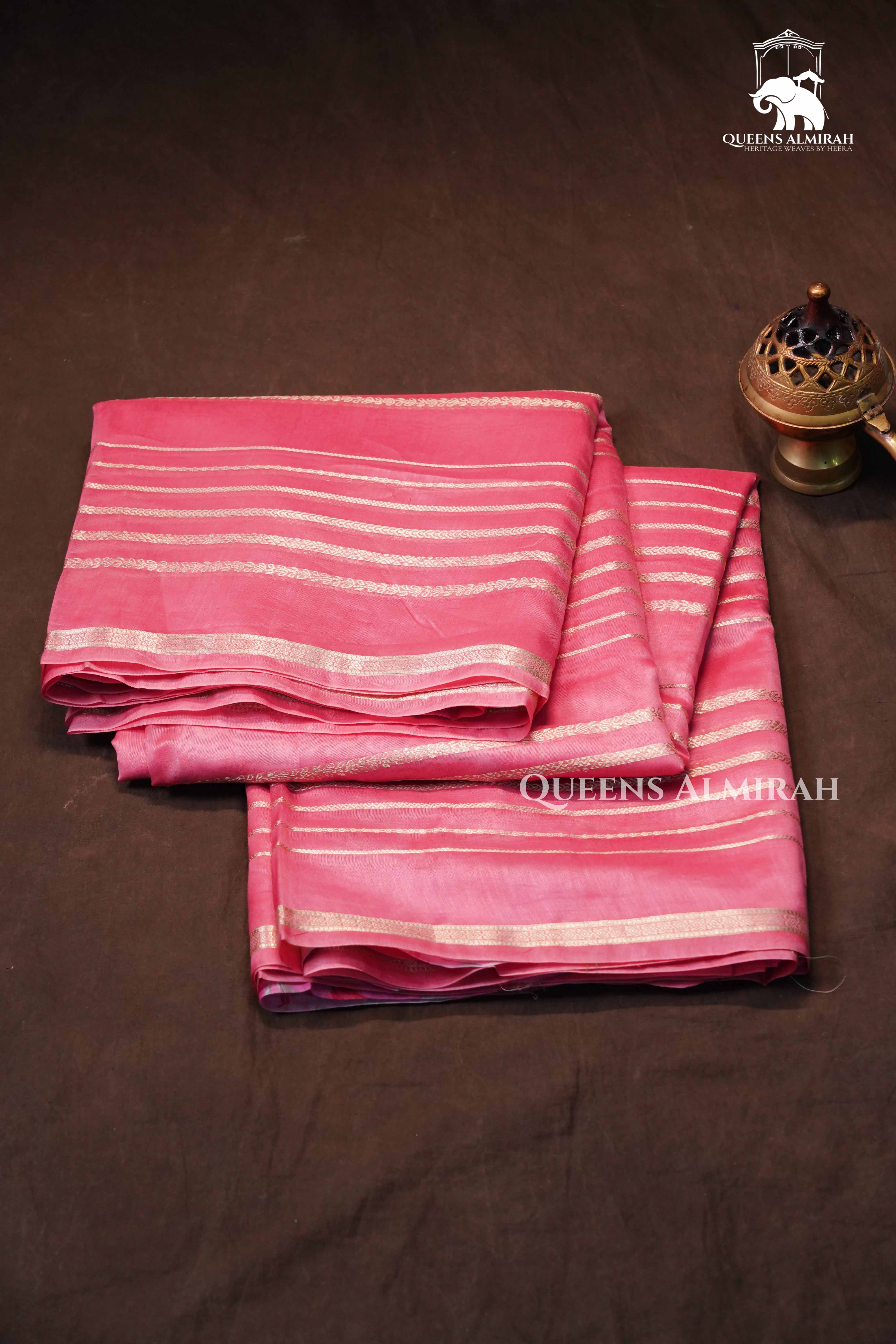 "An elegant pink Chanderi silk cotton saree, featuring delicate golden zari stripes across the body and a beautifully woven floral pattern on the blouse. Lightweight yet classy, this saree strikes the perfect balance between comfort and sophistication, making it ideal for festive gatherings, traditional occasions, and evening celebrations.