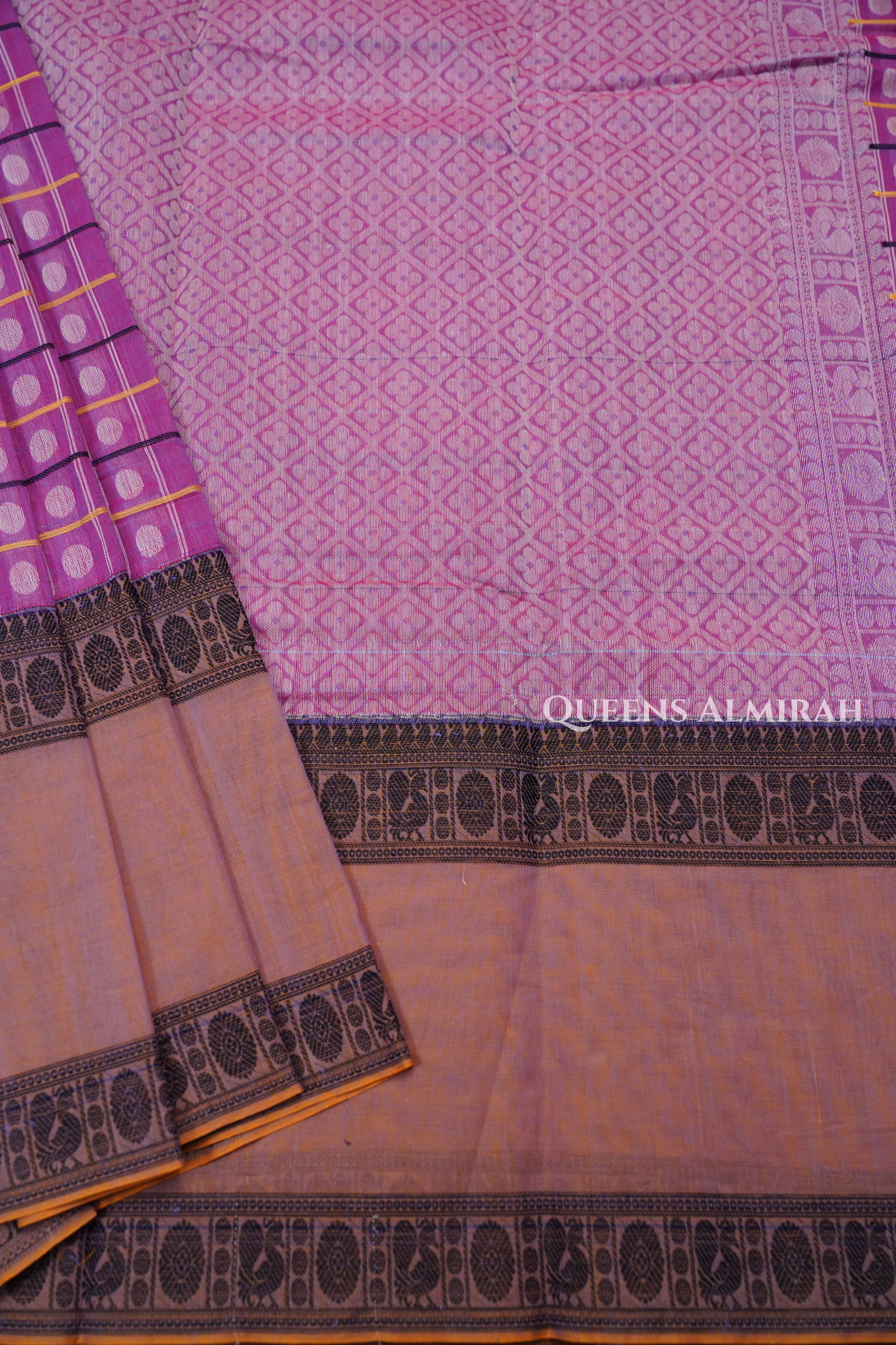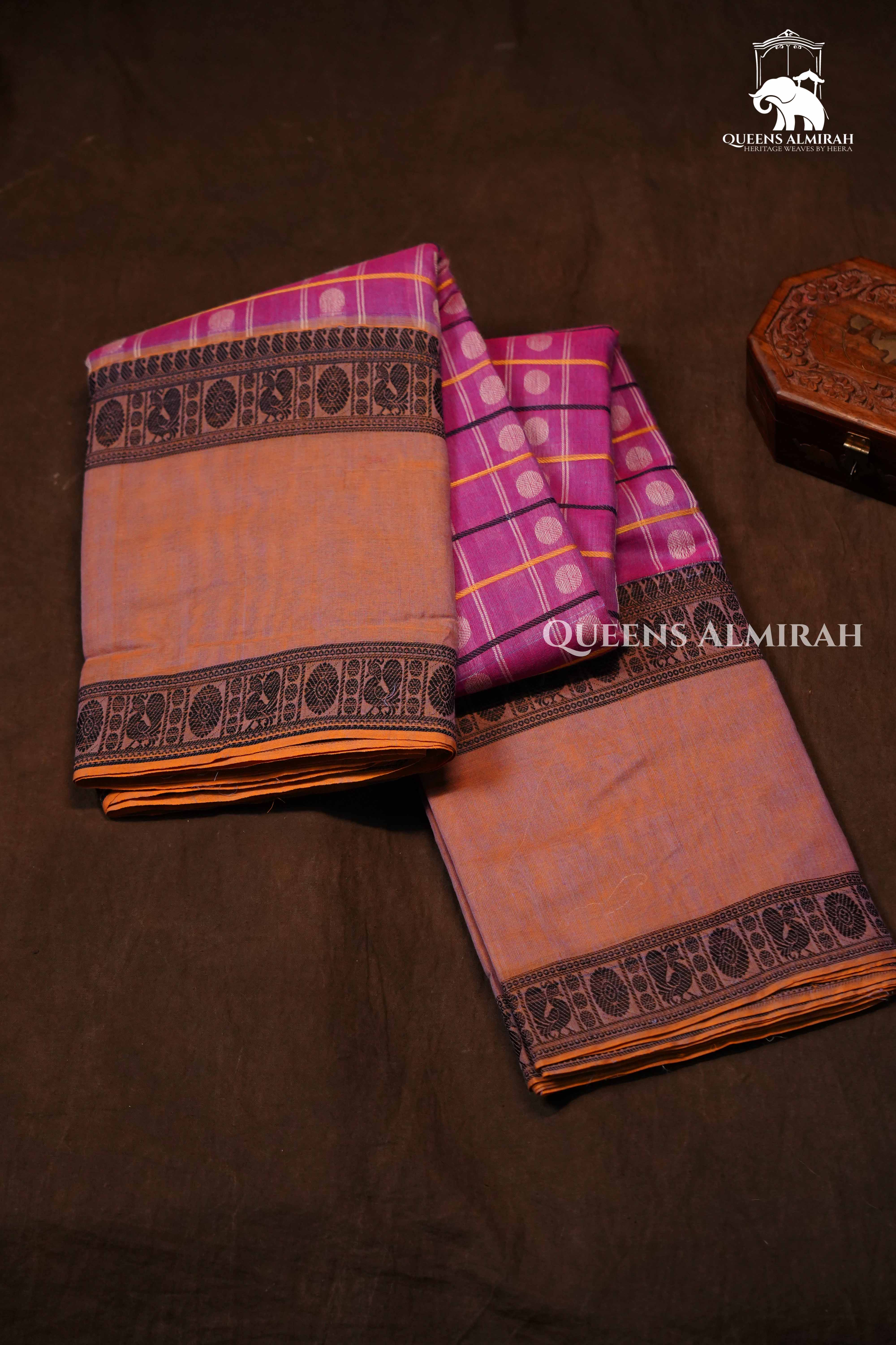 Drape yourself in the timeless charm of this handwoven Chettinad cotton saree, featuring a striking combination of Pink and Brown . The saree is adorned with bold checks in yellow and accents and highlighted by traditional motifs on the contrasting red border.