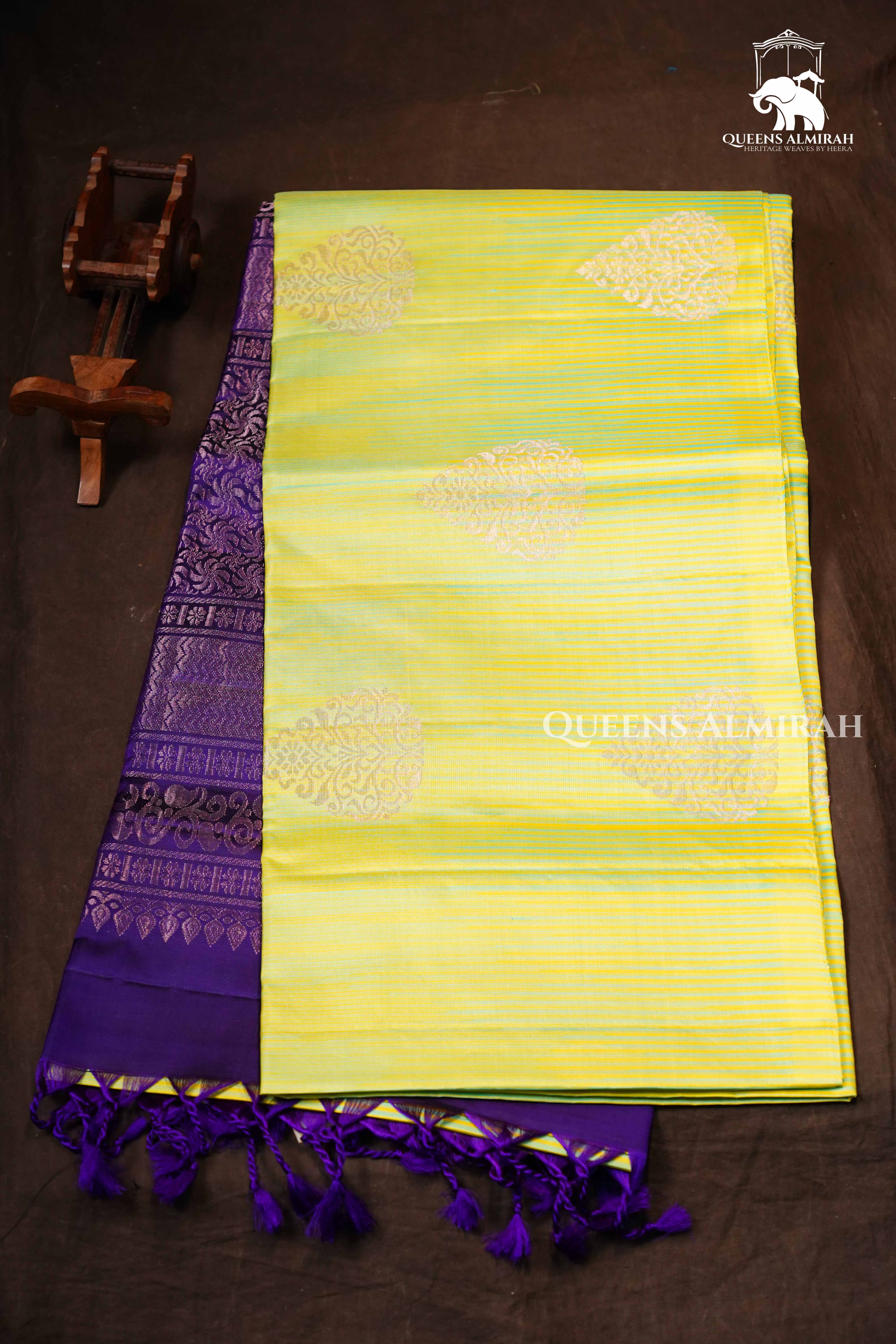 This vibrant soft silk saree features a refreshing Pista Green body adorned with delicate zari motifs, beautifully contrasted with a rich royal purple border and pallu. Lightweight, lustrous, and gracefully woven, it’s the perfect choice for Navaratri and festive occasions, adding a touch of tradition with a modern glow.