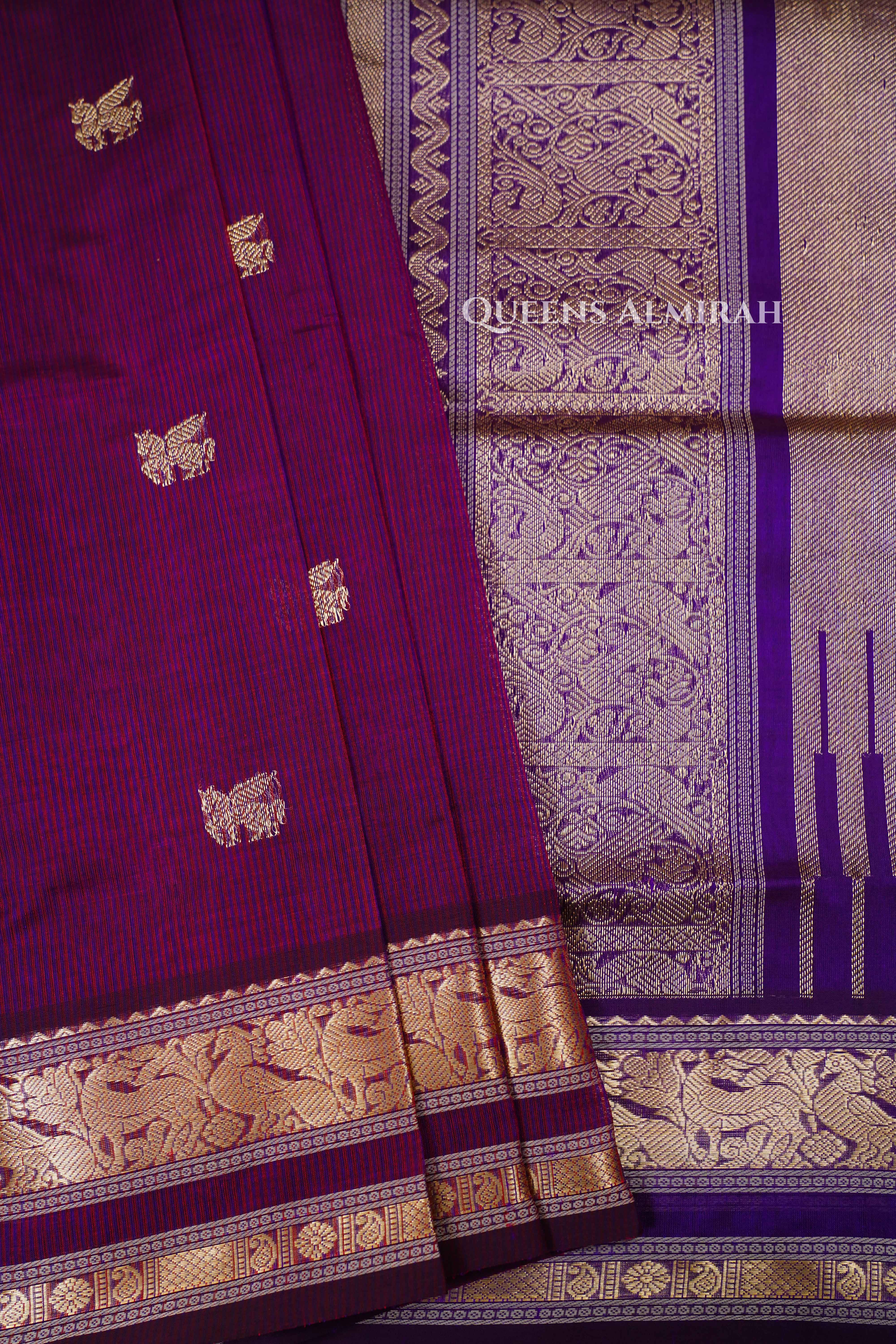 This isn’t your typical Kanchi silk cotton — it’s a rare Chettinadu masterpiece woven by traditional Karaikudi artisans and sourced directly from the weavers. The rich Plum Purple, antique gold threadwork, and glistening grid-textured body come together in a saree that feels like silk and radiates quiet opulence. A timeless piece perfect for heirloom-worthy moments and graceful celebrations.