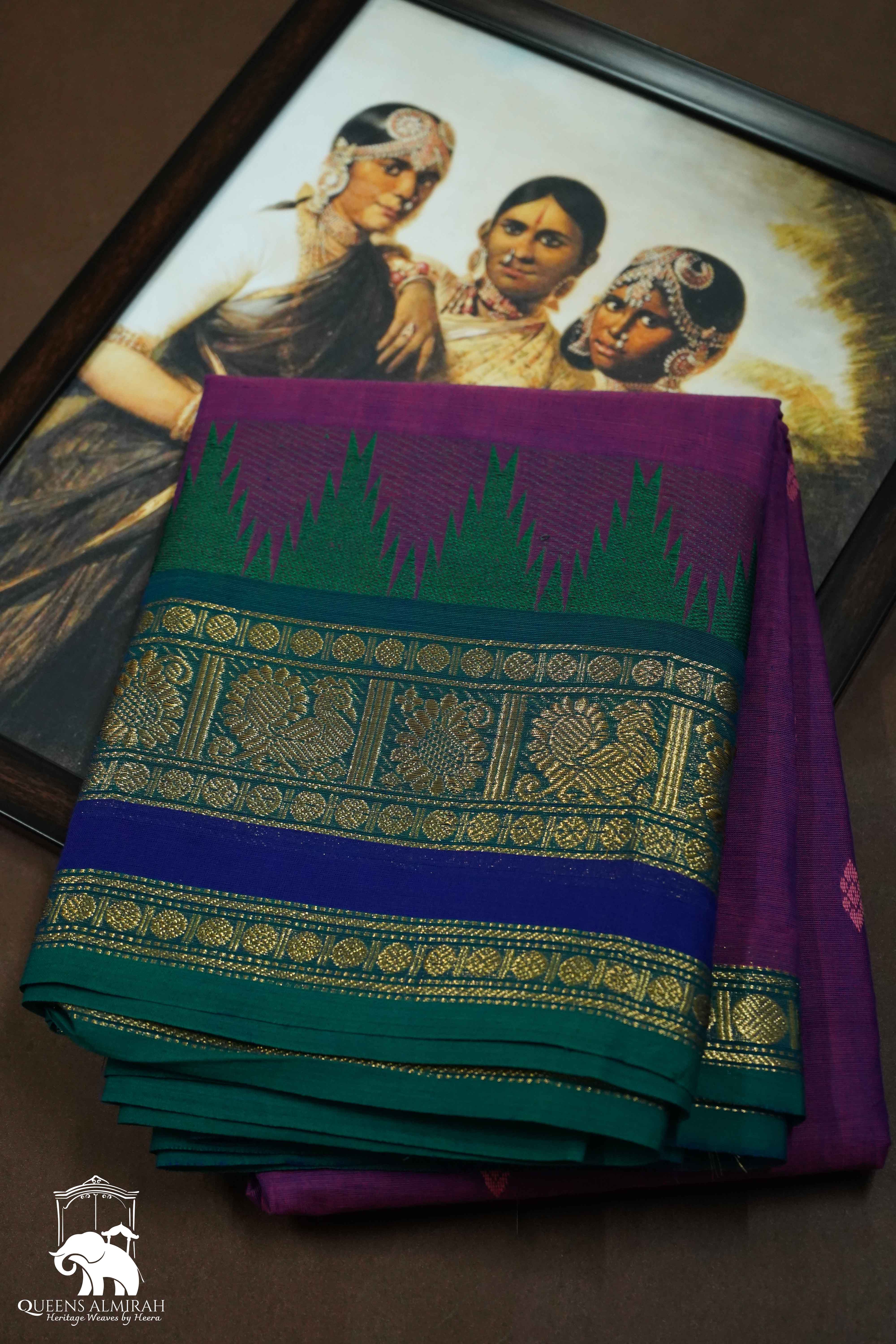 Elevate your saree game with our PLUM PURPLE WITH DARK TEAL KANCHI COTTON SAREE. This elegant saree features a rettapet border and a golden peacock design, intricately woven with temple korvai patterns. Made with high-quality kanchi cotton, this saree is perfect for any occasion.
