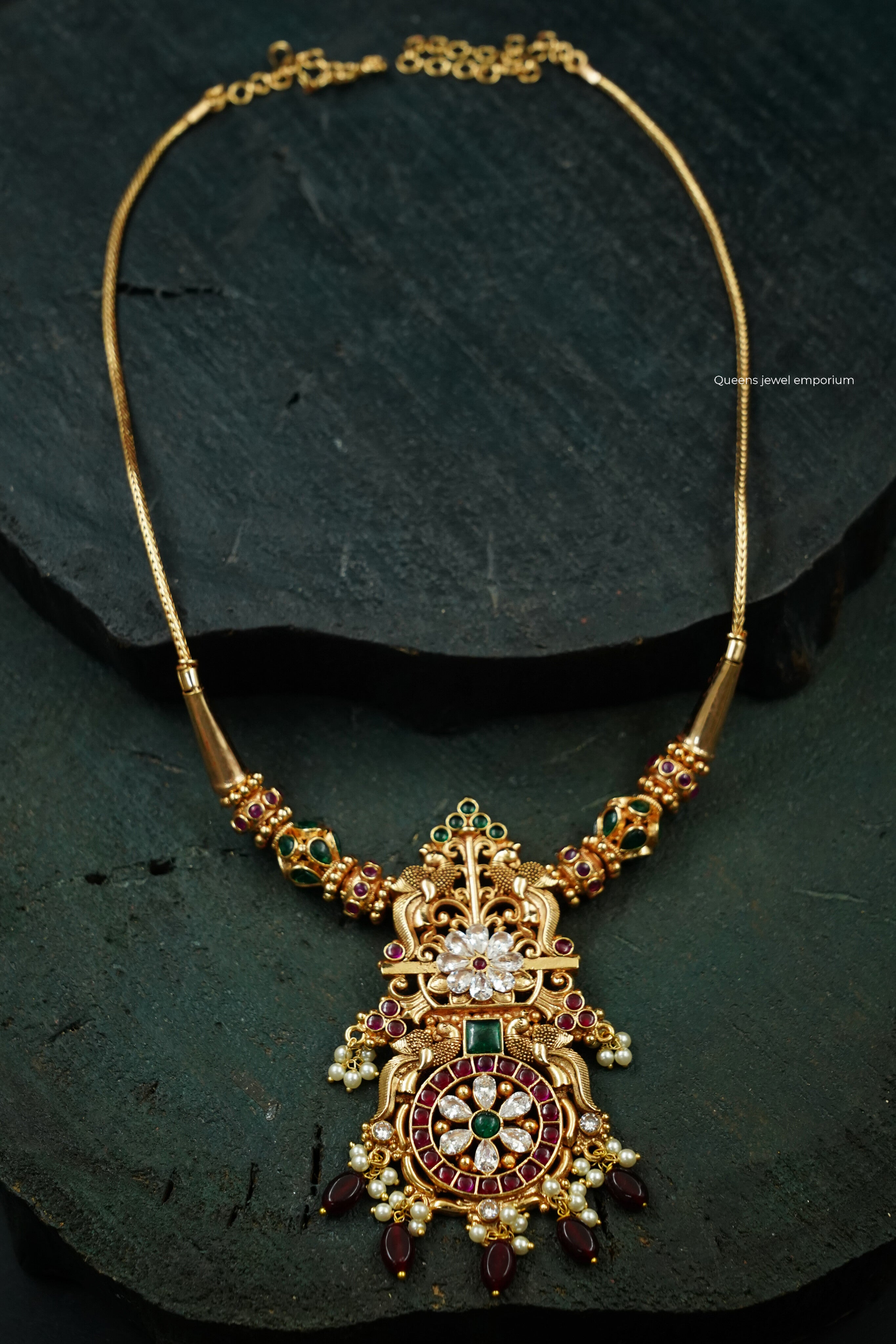 Grand ponnuthayi Kodi necklace in Karaikudi chettinad style featuring four nagas kizhi accents, sakra center in floral design with red kemp and zircon stones, and red beads with baby pearl hangings for a rich heritage look.Ideal for bridal and festive wear, this piece reflects Queens Jewel Emporium’s signature craftsmanship and refined lasting elegance.