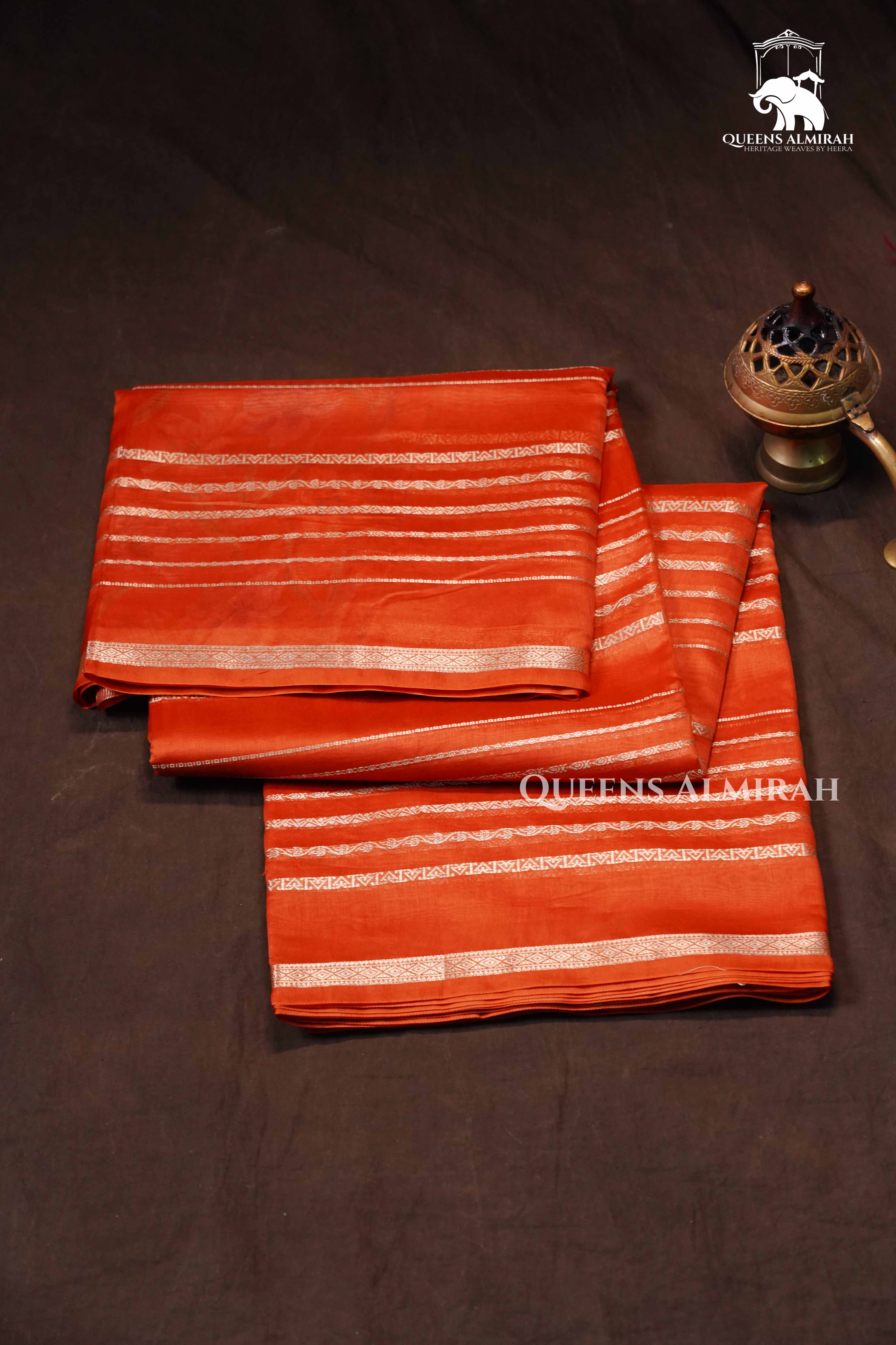 An elegant pink Chanderi silk cotton saree, featuring delicate golden zari stripes across the body and a beautifully woven floral pattern on the blouse. Lightweight yet classy, this saree strikes the perfect balance between comfort and sophistication, making it ideal for festive gatherings, traditional occasions, and evening celebrations.