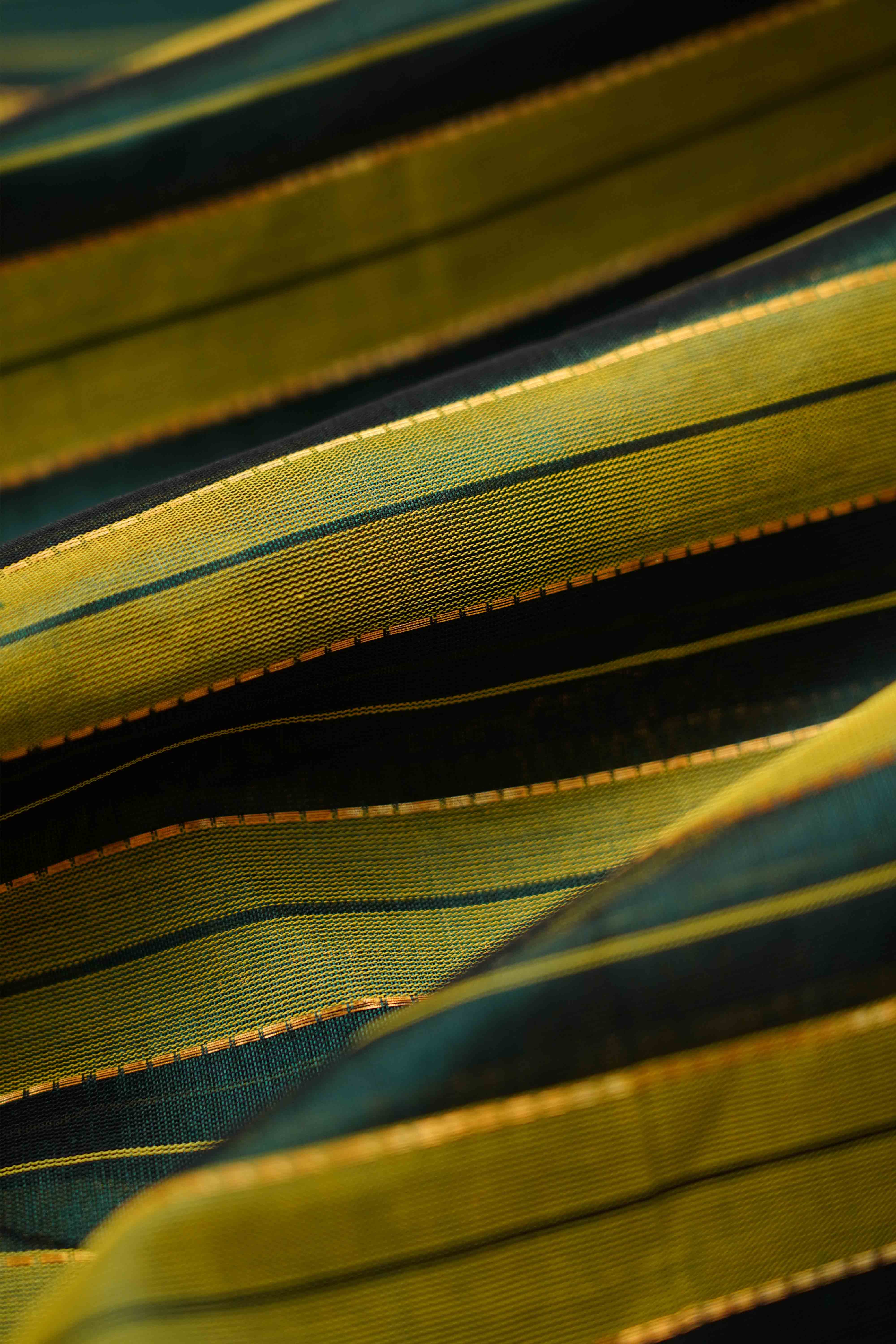 Experience the luxurious blend of pure Kanchi silk and cotton with our BOTTLE GREEN saree, featuring a vibrant OLIVE YELLOW border. The golden zari design in green and grey tones adds richness to the fabric. Elevate your traditional attire and stand out at any festive occasion with this elegant and comfortable saree.