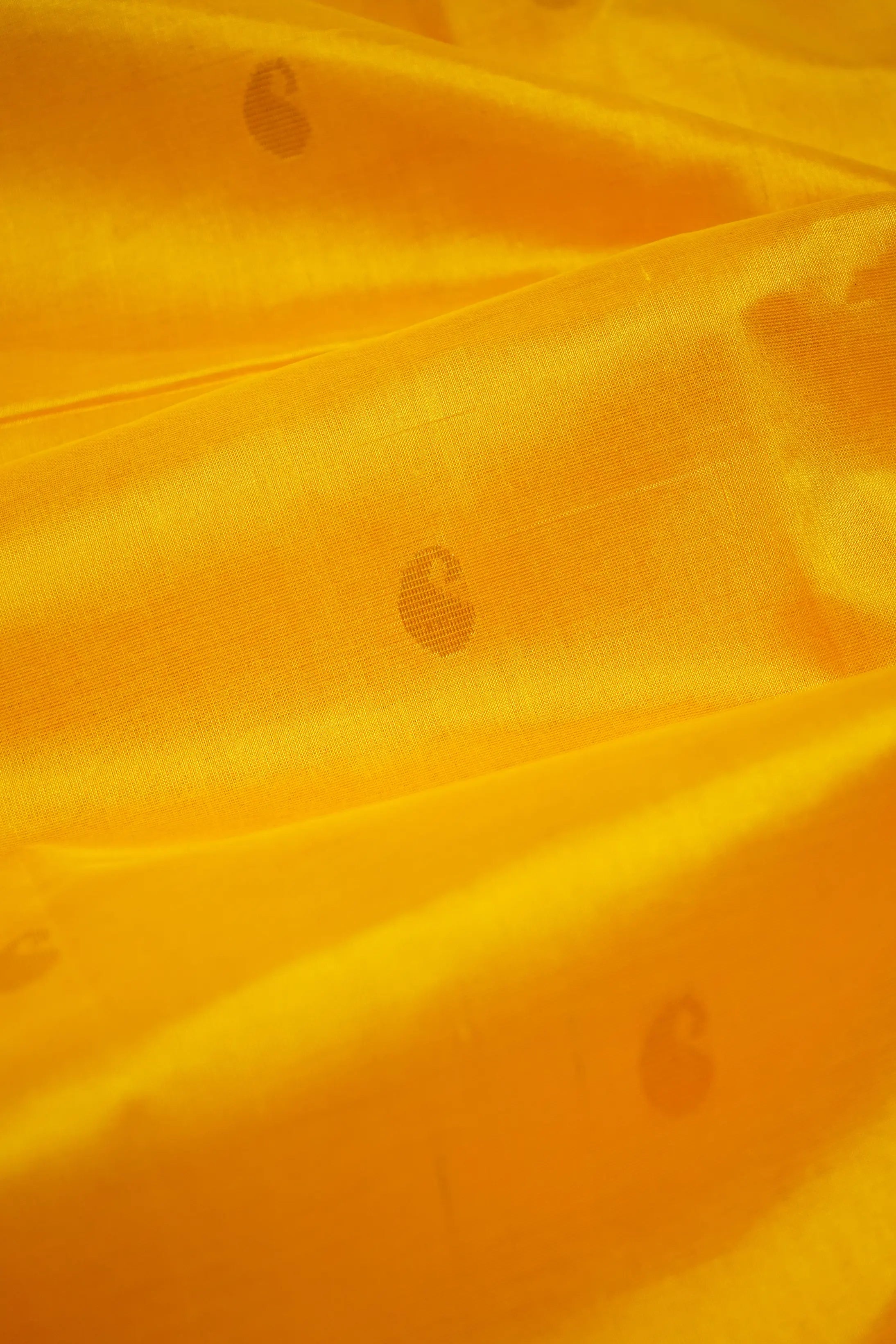 This pure Kanchi silk cotton saree features a striking burnt yellow and dark navy blue color combination, with a traditional mango design and retta betta border. The temple korvai design and attached blouse add to its elegance. Expertly crafted for a luxurious look and feel.
