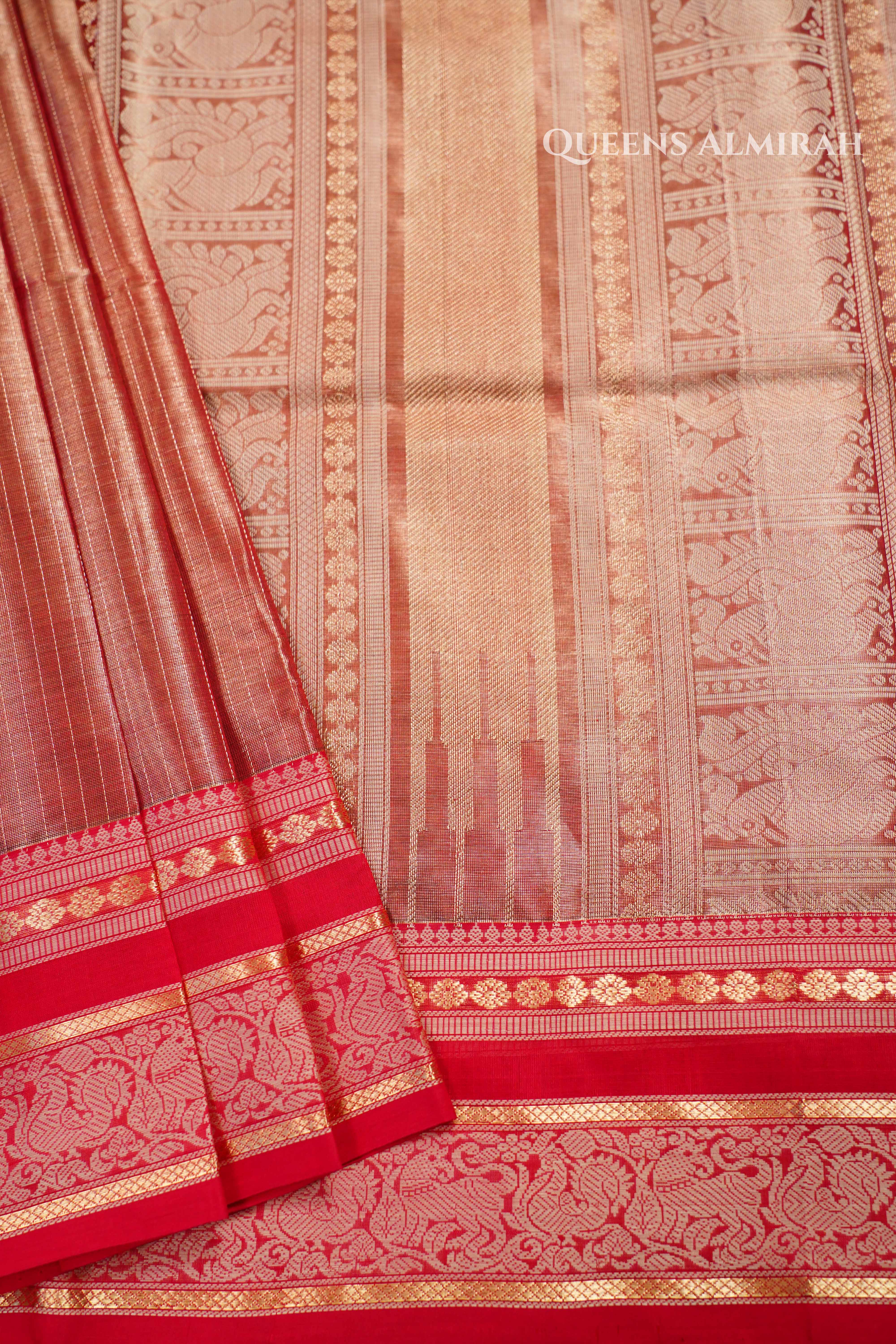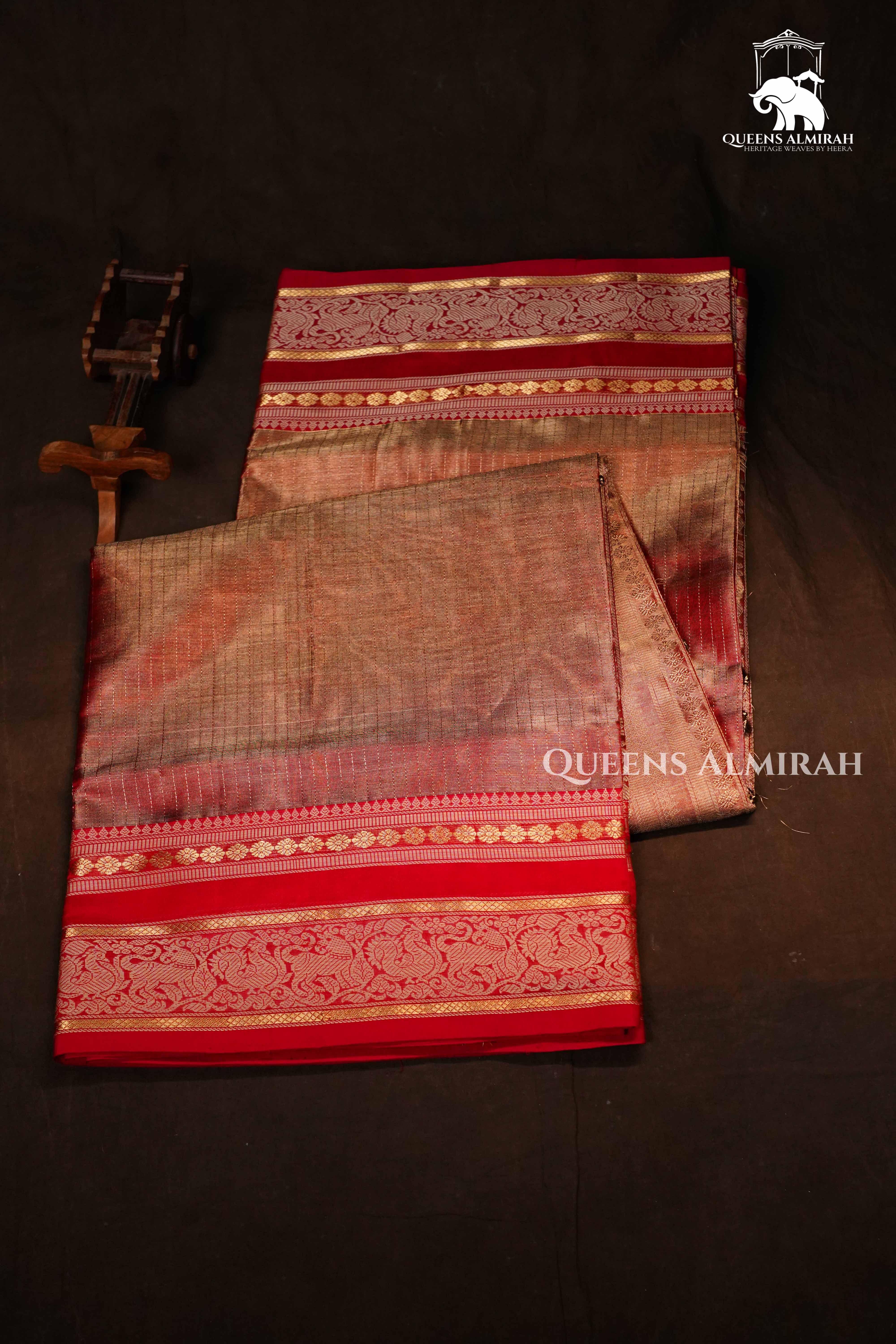 This isn’t your typical Kanchi silk cotton — it’s a rare Chettinadu masterpiece woven by traditional Karaikudi artisans and sourced directly from the weavers. The rich Dual Shade Of Golden Red tone, antique gold zari work, and glistening grid-textured body come together in a saree that feels like silk and radiates quiet opulence. A timeless piece perfect for heirloom-worthy moments and graceful celebrations.