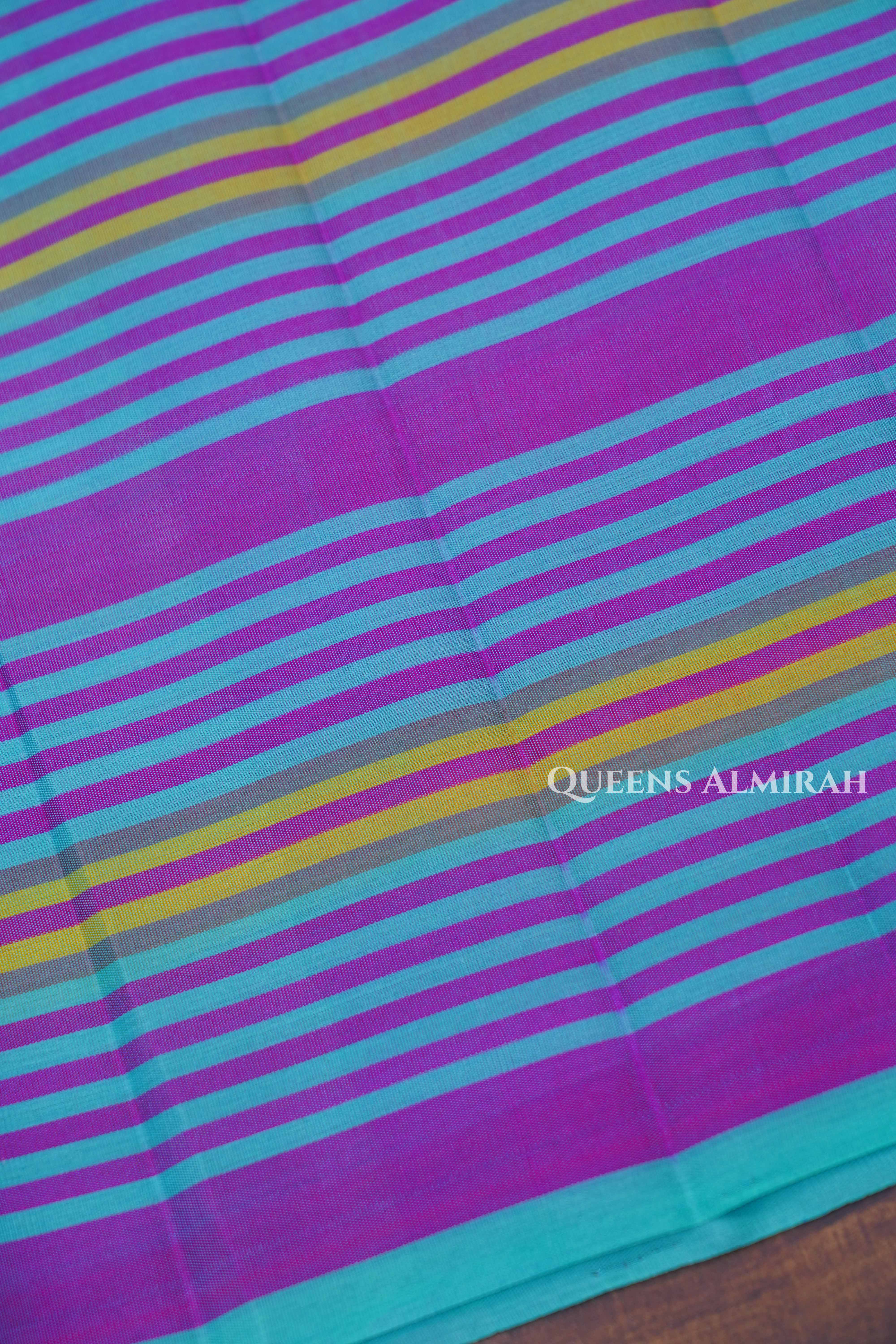 Embrace elegance with this soft silk saree featuring a soothing Turquoise Blue base and vibrant multicoloured stripes in shades of pink, yellow, and turquoise. The playful yet sophisticated stripe pattern adds a contemporary touch, making it perfect for festive occasions, casual gatherings, or semi-formal events. Lightweight and comfortable, this saree drapes effortlessly, ensuring you feel graceful and stylish all day long.