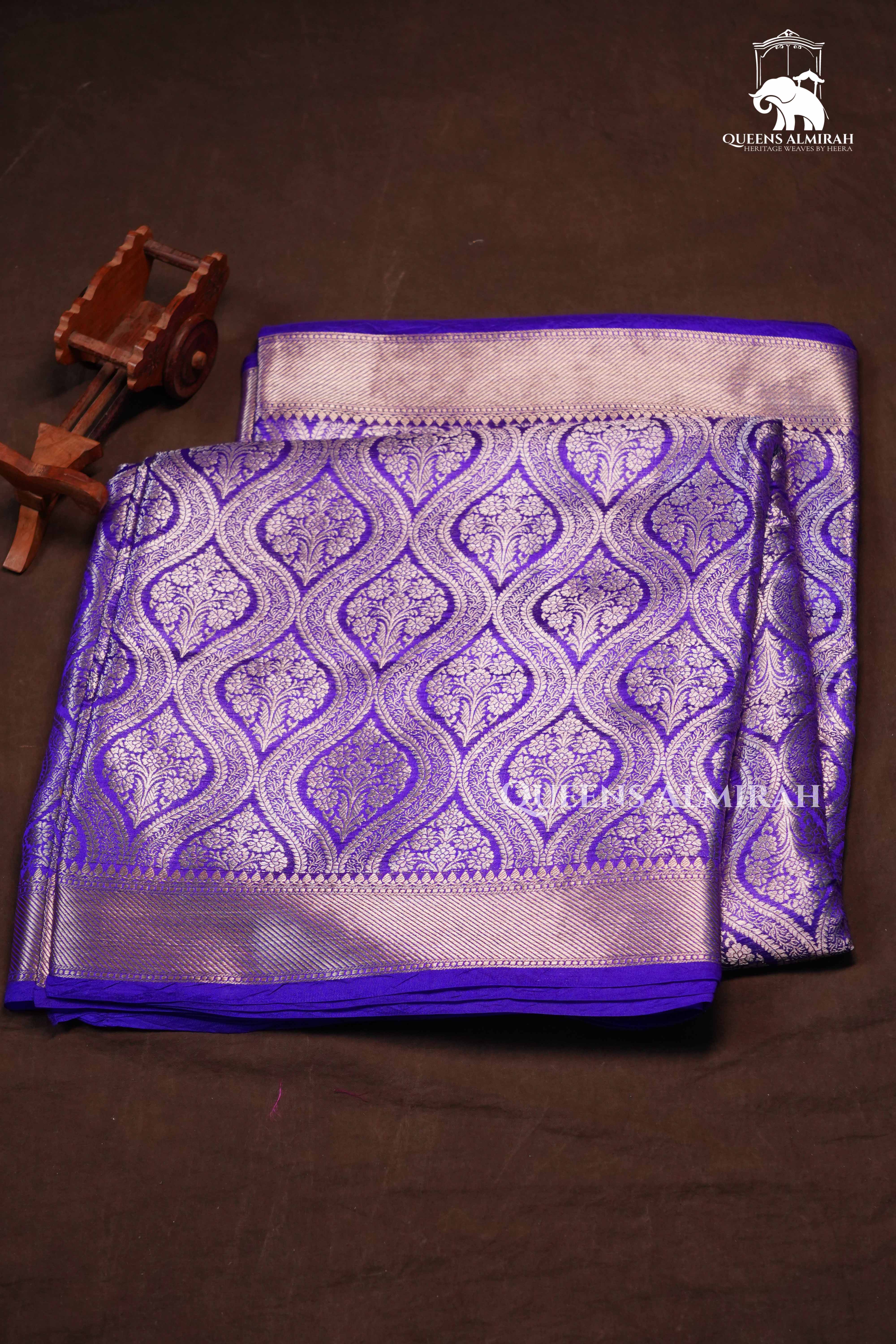 A vision of grandeur, this exquisite Banarasi silk saree features a rich royal purple base adorned with intricate silver zari floral motifs arranged in classic diamond patterns. The lustrous sheen of the silk paired with a beautifully woven silver border adds timeless sophistication. Perfect for weddings, festive occasions, and grand celebrations — this saree blends traditional craftsmanship with regal charm.