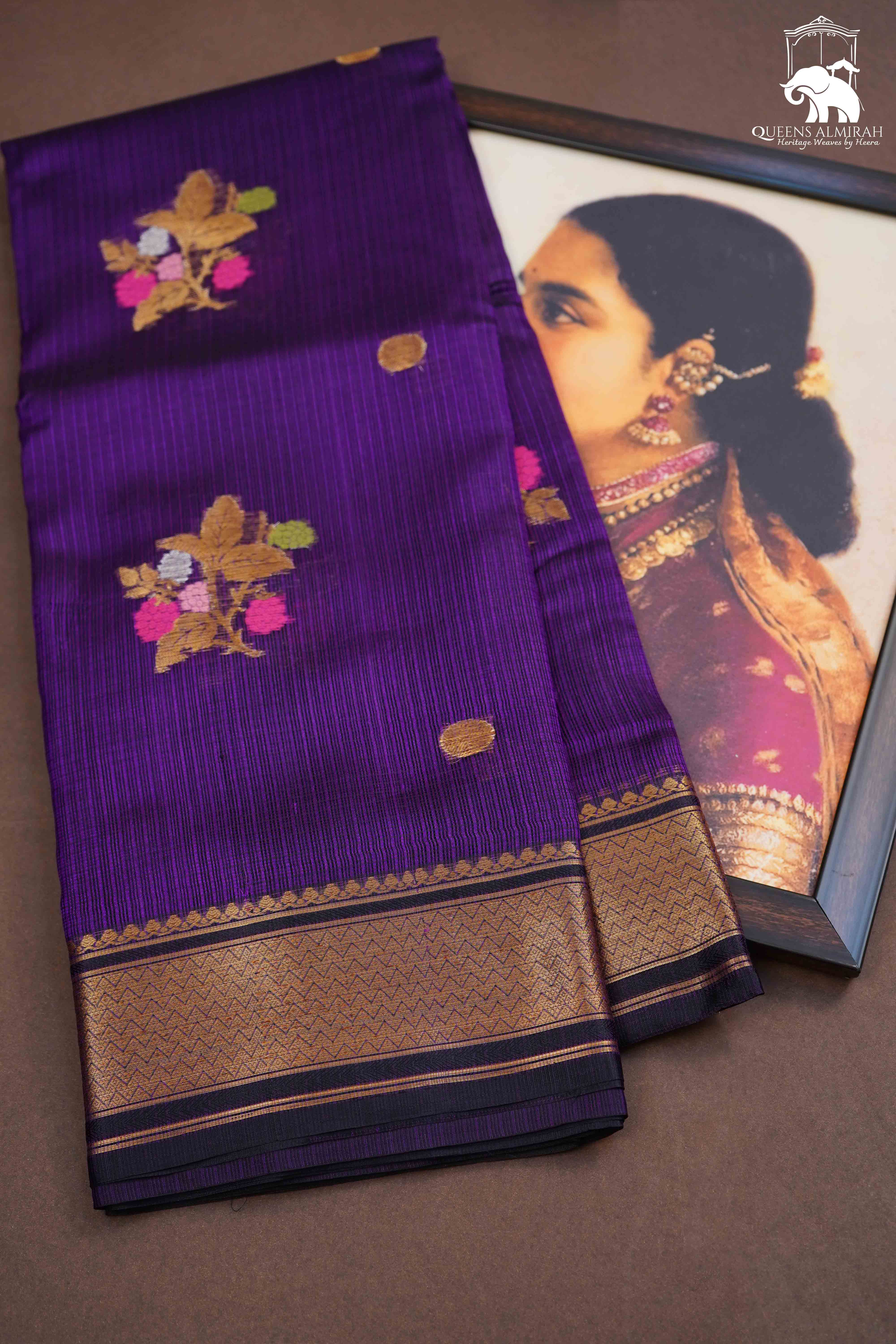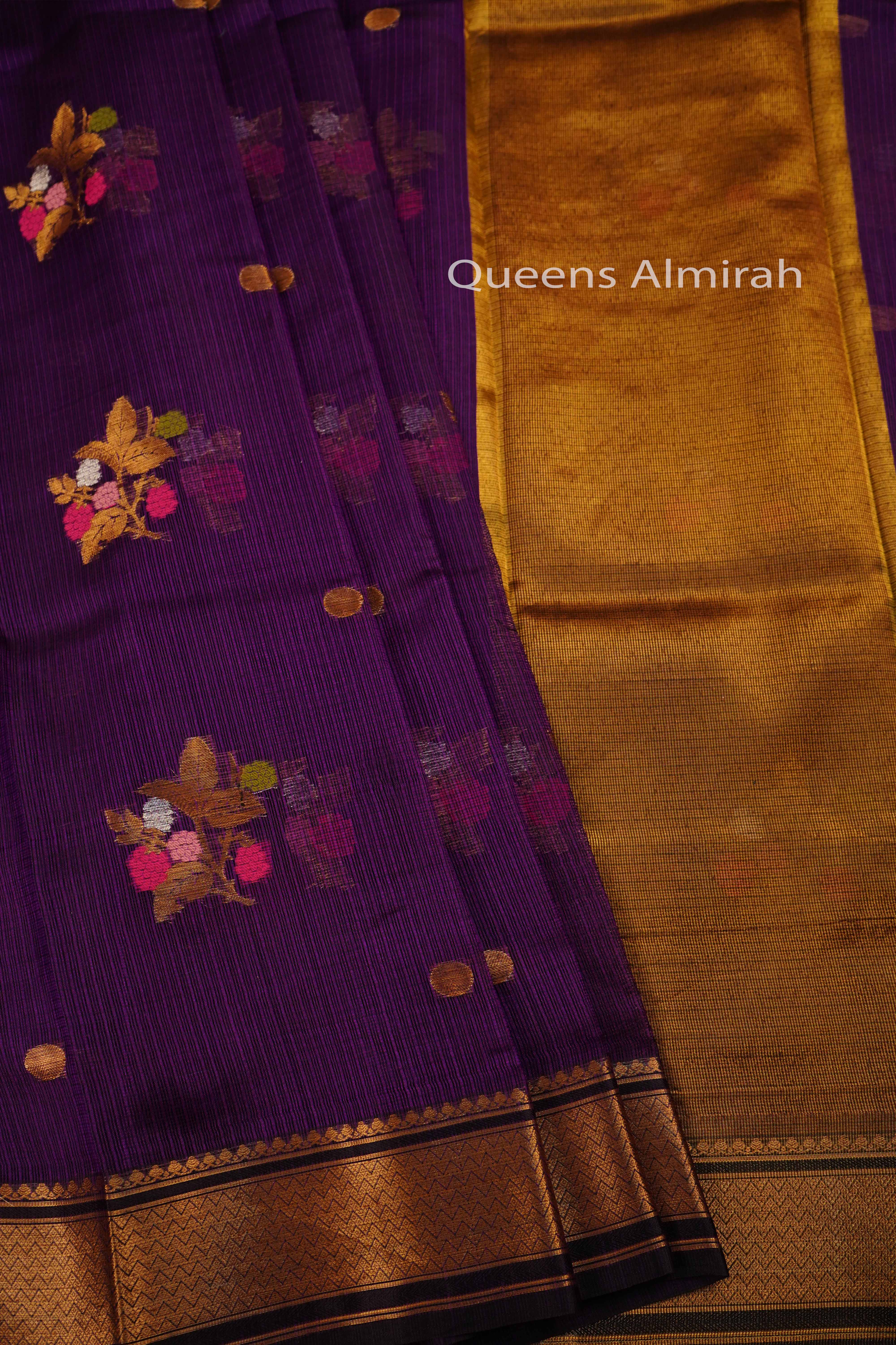 Upgrade your wardrobe with our Purple Pure Kota Silk Saree Made from pure kota silk, it offers both elegance and comfort for any occasion. With a golden border and intricate flower meenakari butta design, this saree is sure to make you stand out. Elevate your style today.