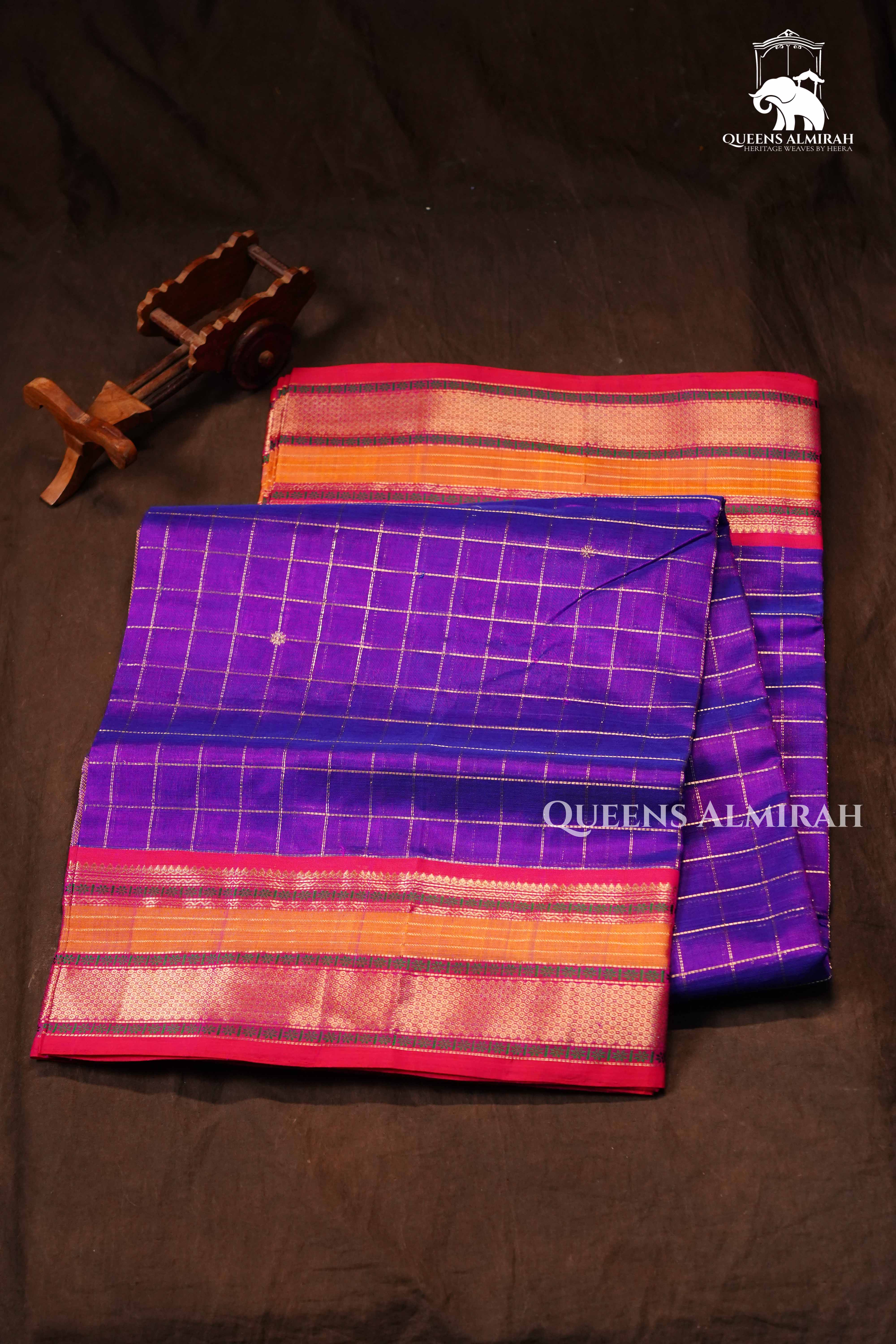 Add a royal charm to your wardrobe with these premium Kanchipuram silk cotton sarees featuring fine silver zari checks and vibrant contrasting borders. Majestic royal blue with silver checks, highlighted with a rich pink zari border for a timeless traditional appeal.