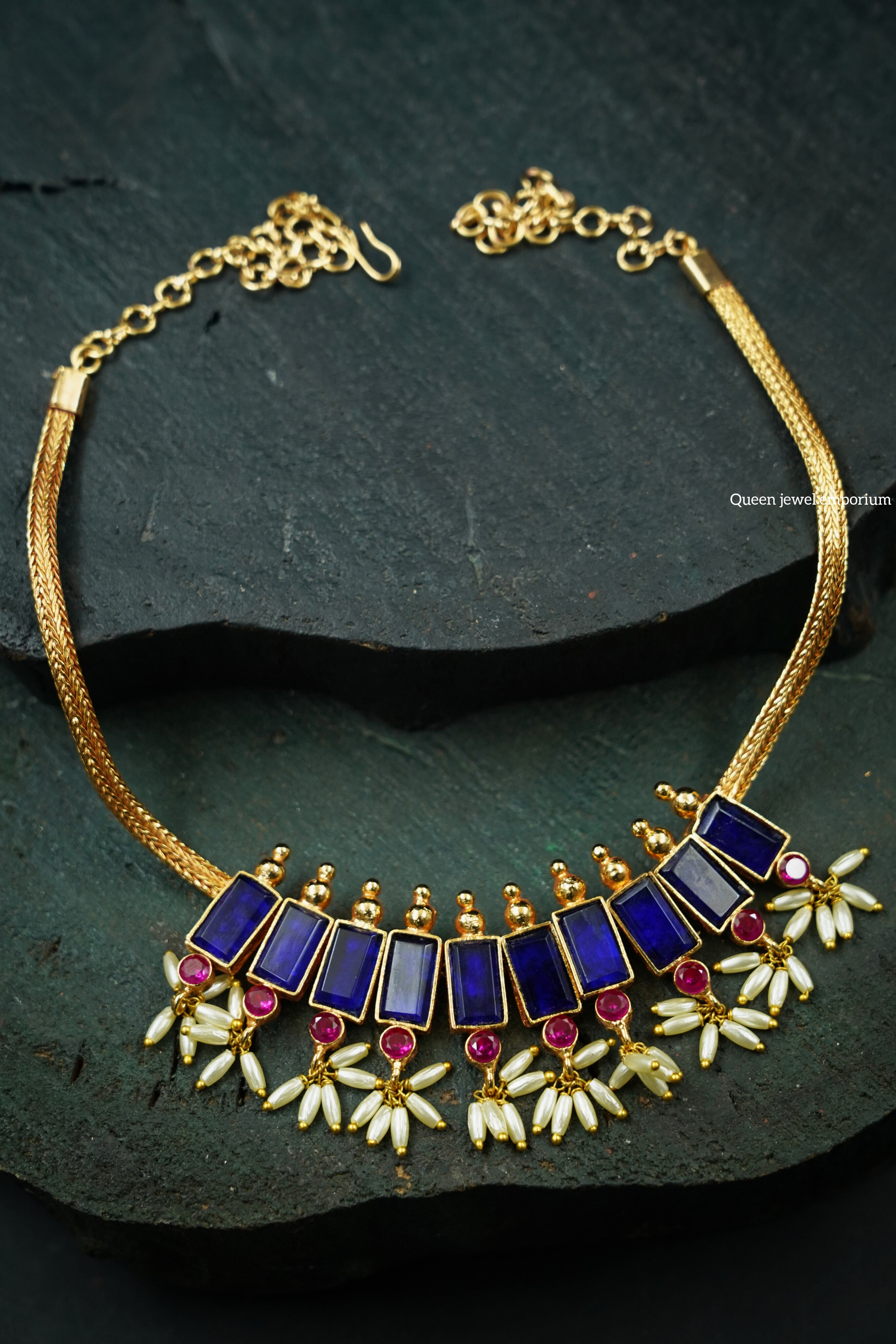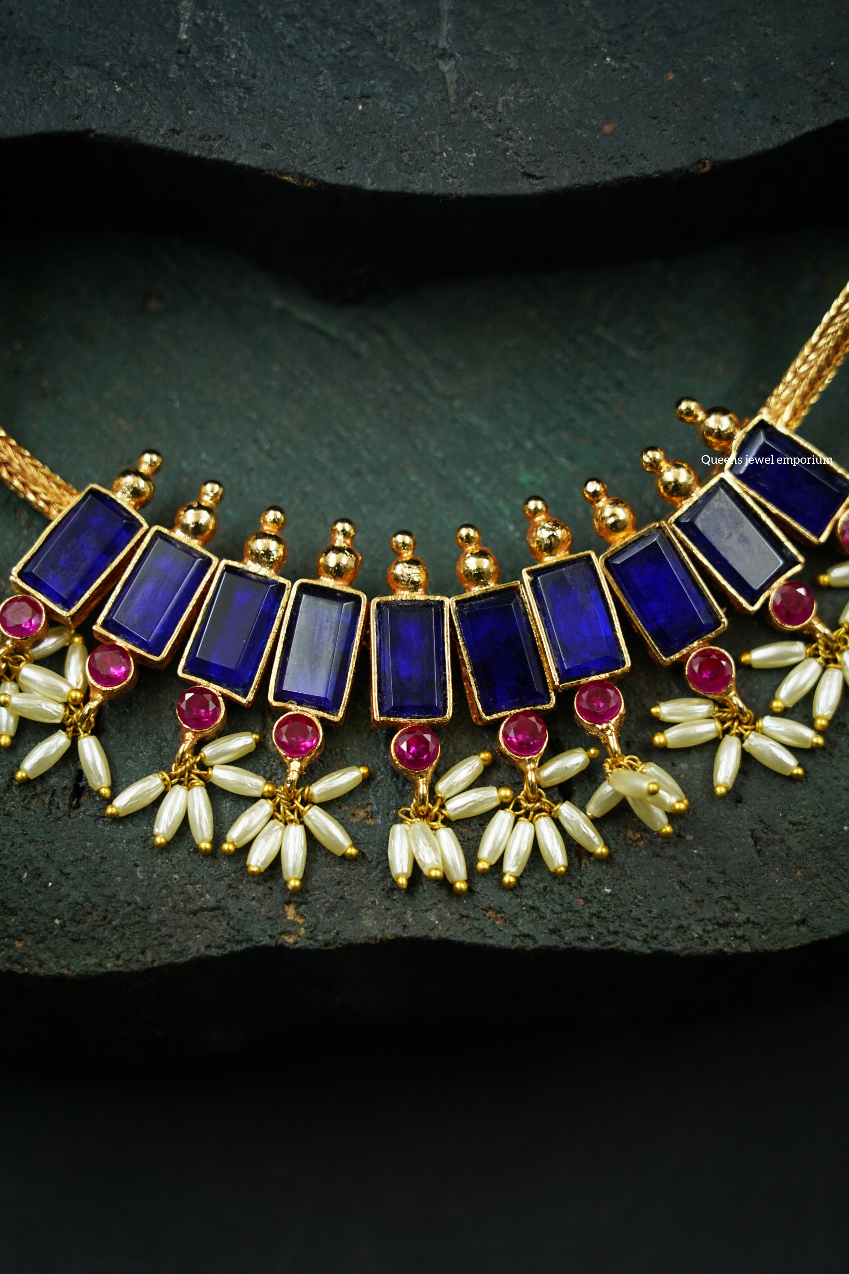 This elegant necklace showcases a square-shaped ink blue stone at its center, finished with graceful bunches of rice pearl hangings for classic traditional charm. A simple yet striking design that elevates any ethnic look.Sophisticated tradition in every detail—handcrafted by our expert artisans. Special occasion for onam.