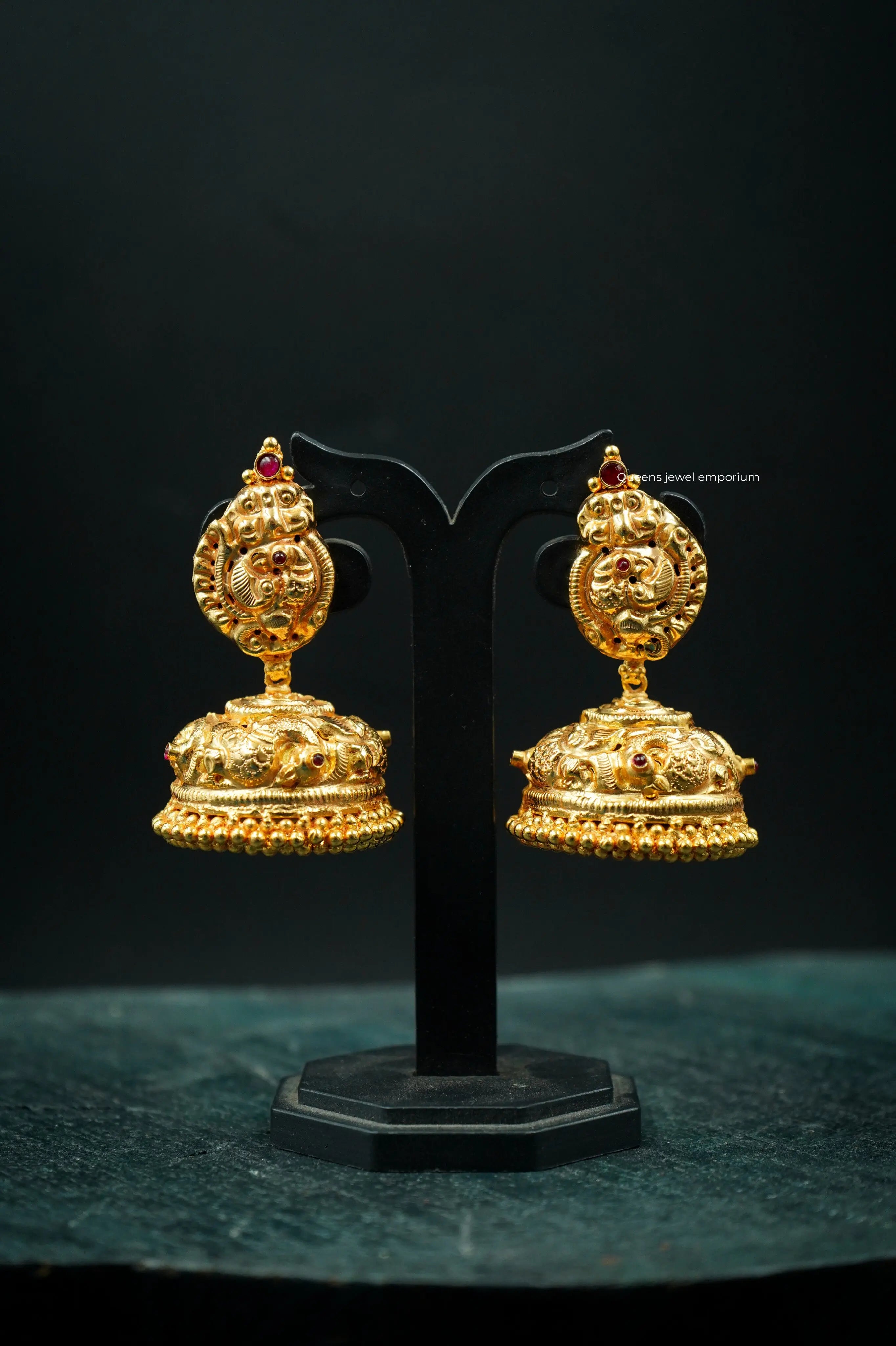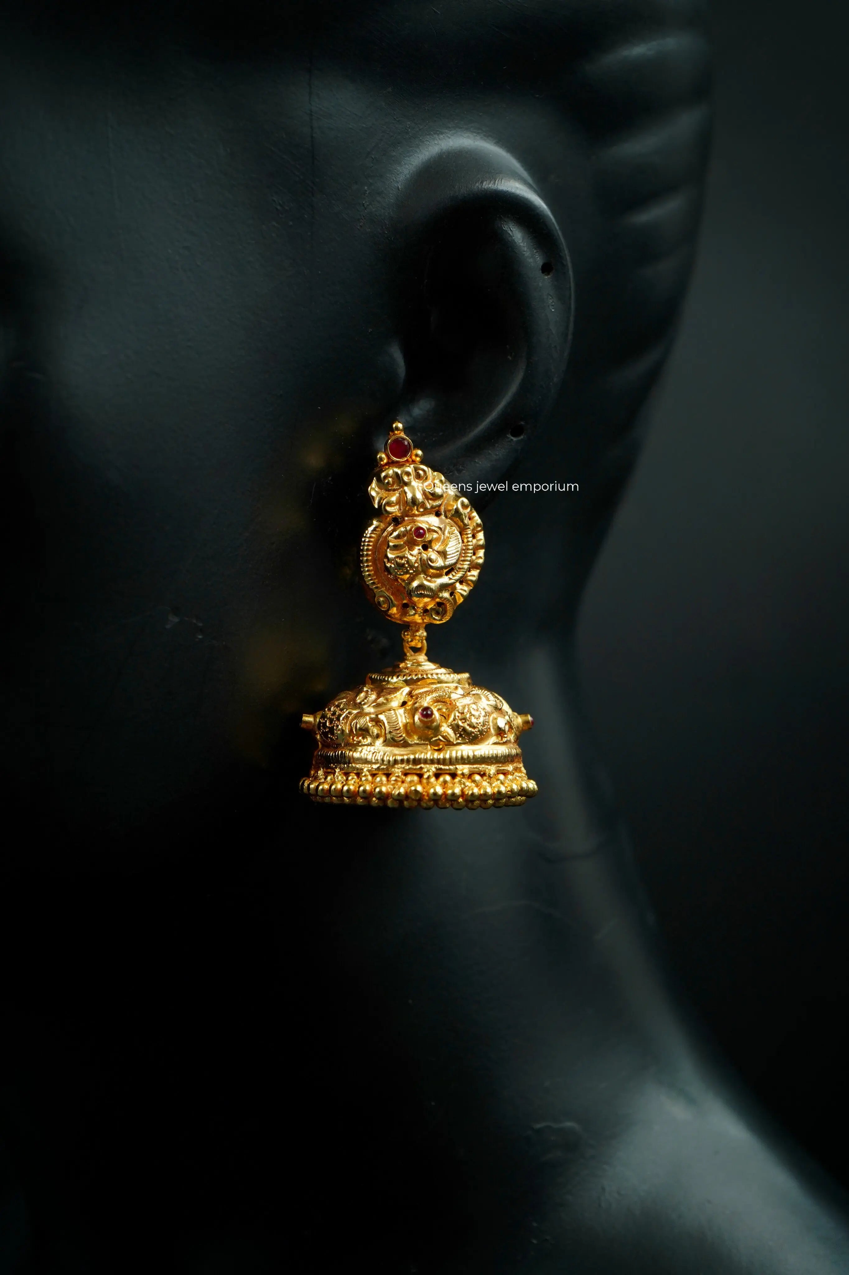 Discover elegance with the RADHIKA NAGAS JHUMKA earrings. Inspired by South Indian temple jewelry, these stunning peacock-inspired pieces effortlessly fuse tradition and grace. Elevate any look with the regal touch of these exquisite earrings.