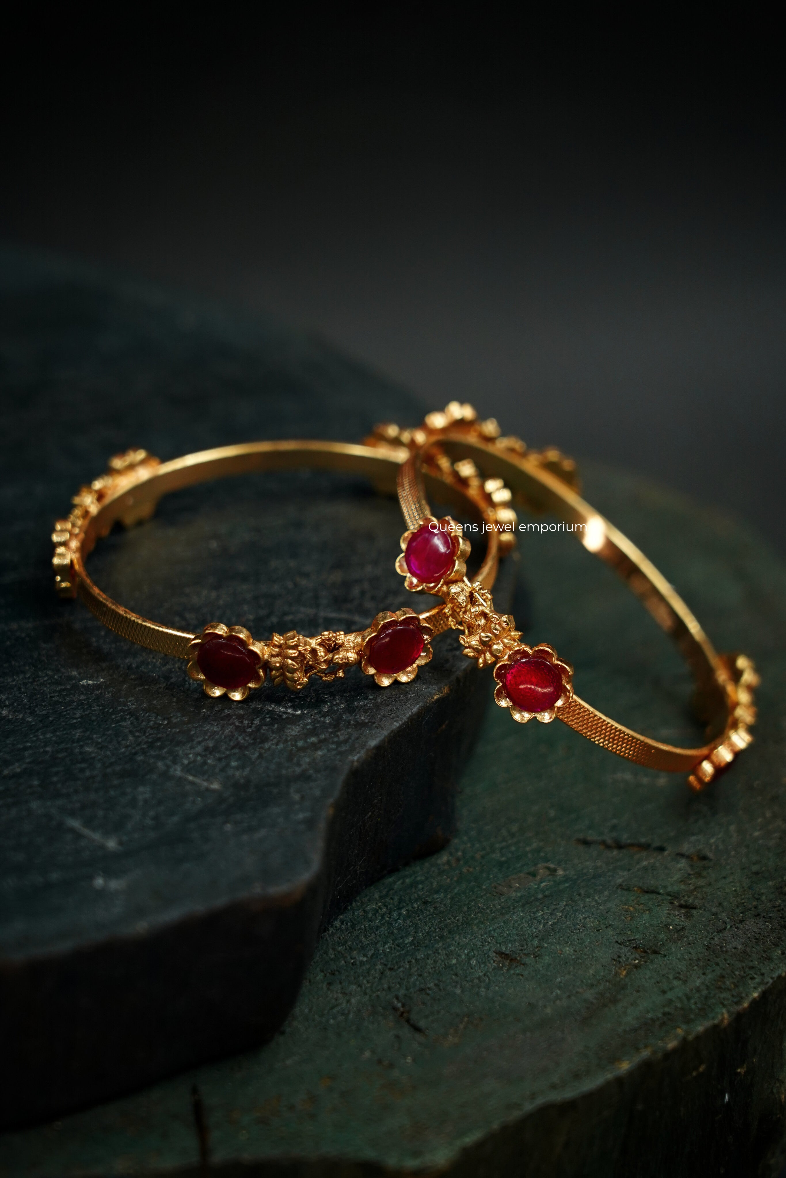 Grand Lakshmi bangle featuring intricate nagas motifs with Lakshmi seated on lotus at the center, highlighted by red kemp floral stones on the top and bottom for a rich divine look.Ideal for bridal and festive wear, this piece reflects Queens Jewel Emporium’s signature craftsmanship and refined lasting elegance.