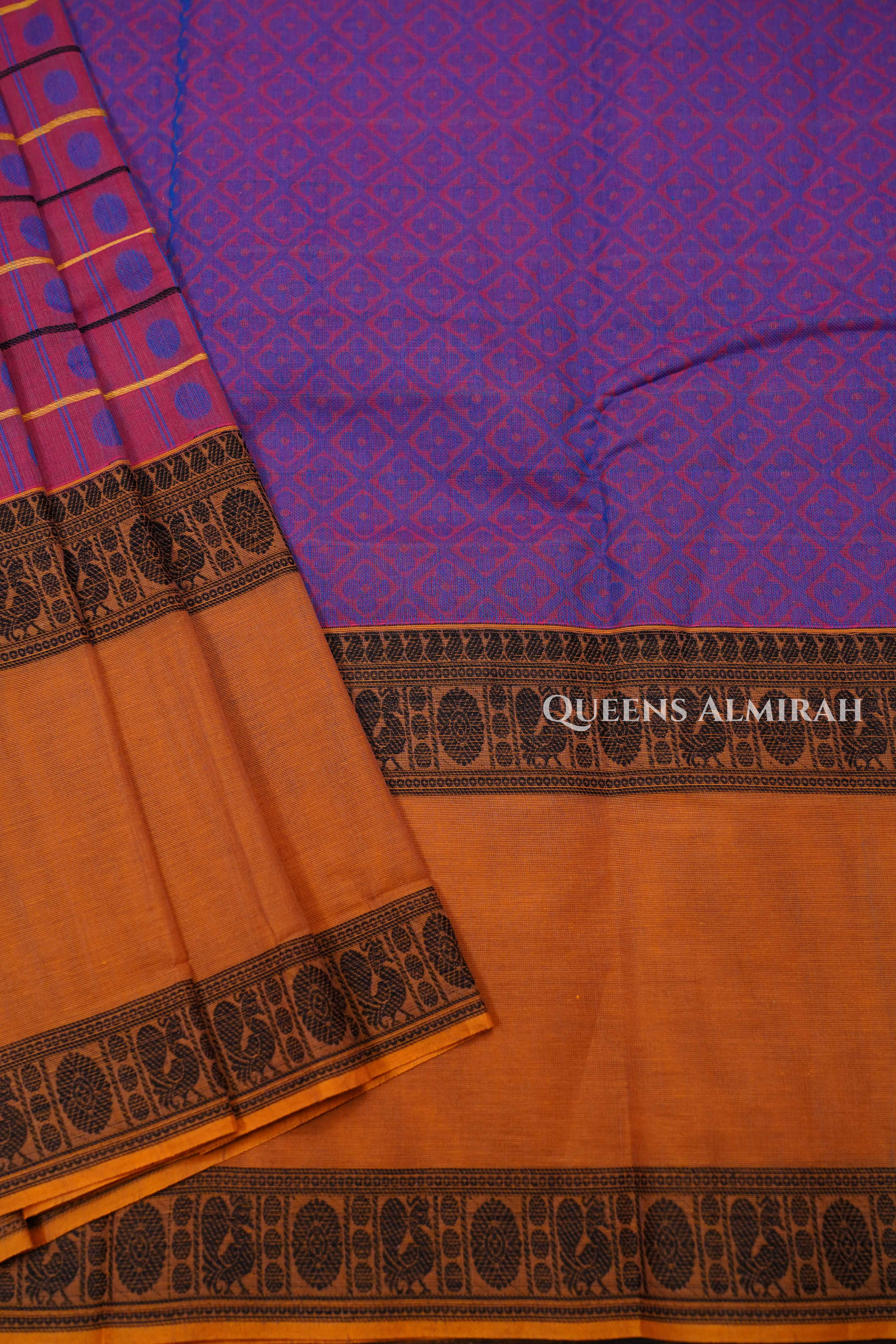 Embrace classic elegance with this handwoven Chettinad cotton saree, featuring a rich Raspberry Pink body complemented by a bold orange border. The contrast of colors is enhanced with traditional temple motifs and intricate weaving patterns, showcasing the authentic charm of South Indian craftsmanship.