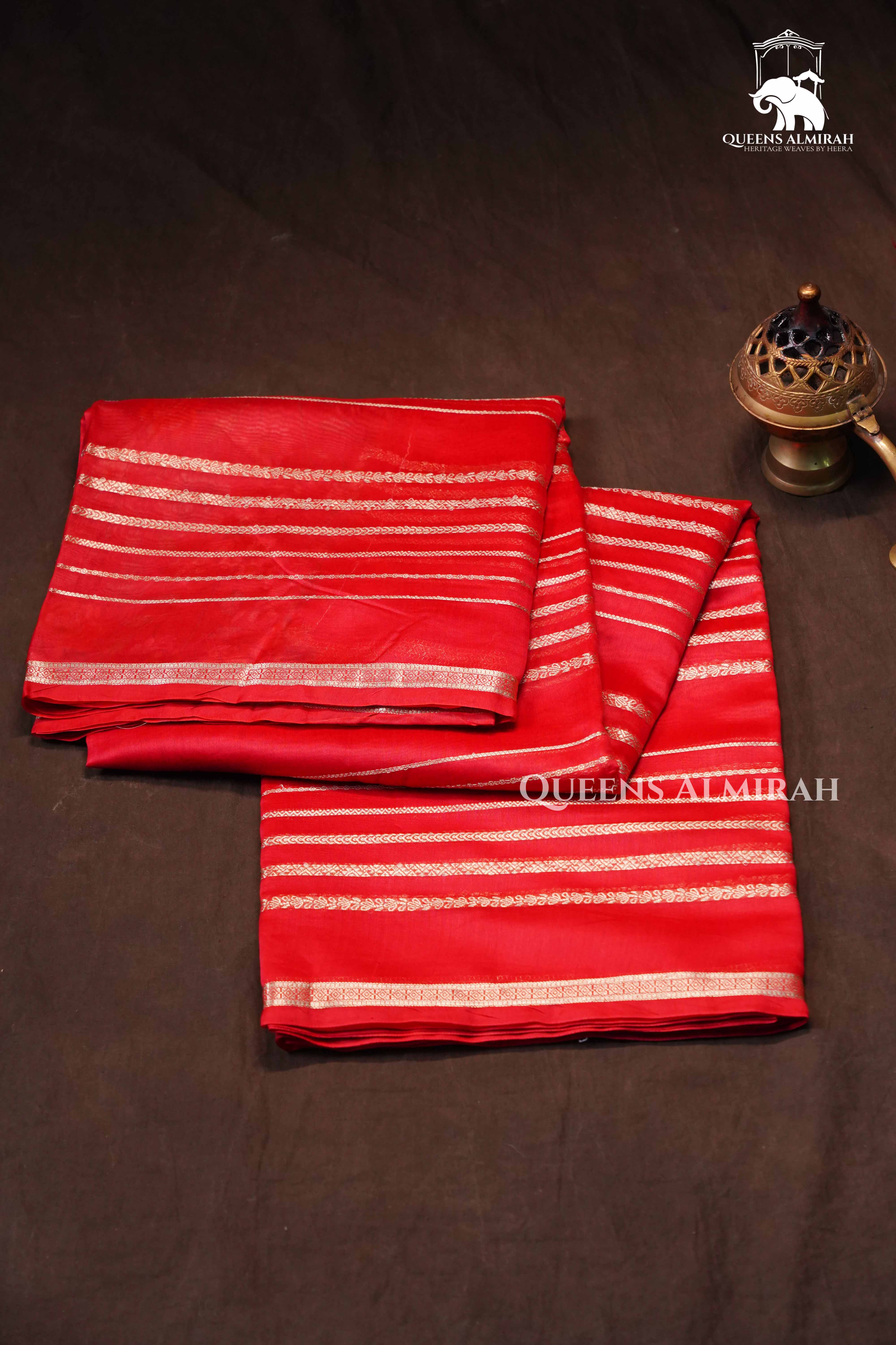 An elegant Cherry Red Chanderi silk cotton saree, featuring delicate golden zari stripes across the body and a beautifully woven floral pattern on the blouse. Lightweight yet classy, this saree strikes the perfect balance between comfort and sophistication, making it ideal for festive gatherings, traditional occasions, and evening celebrations.
