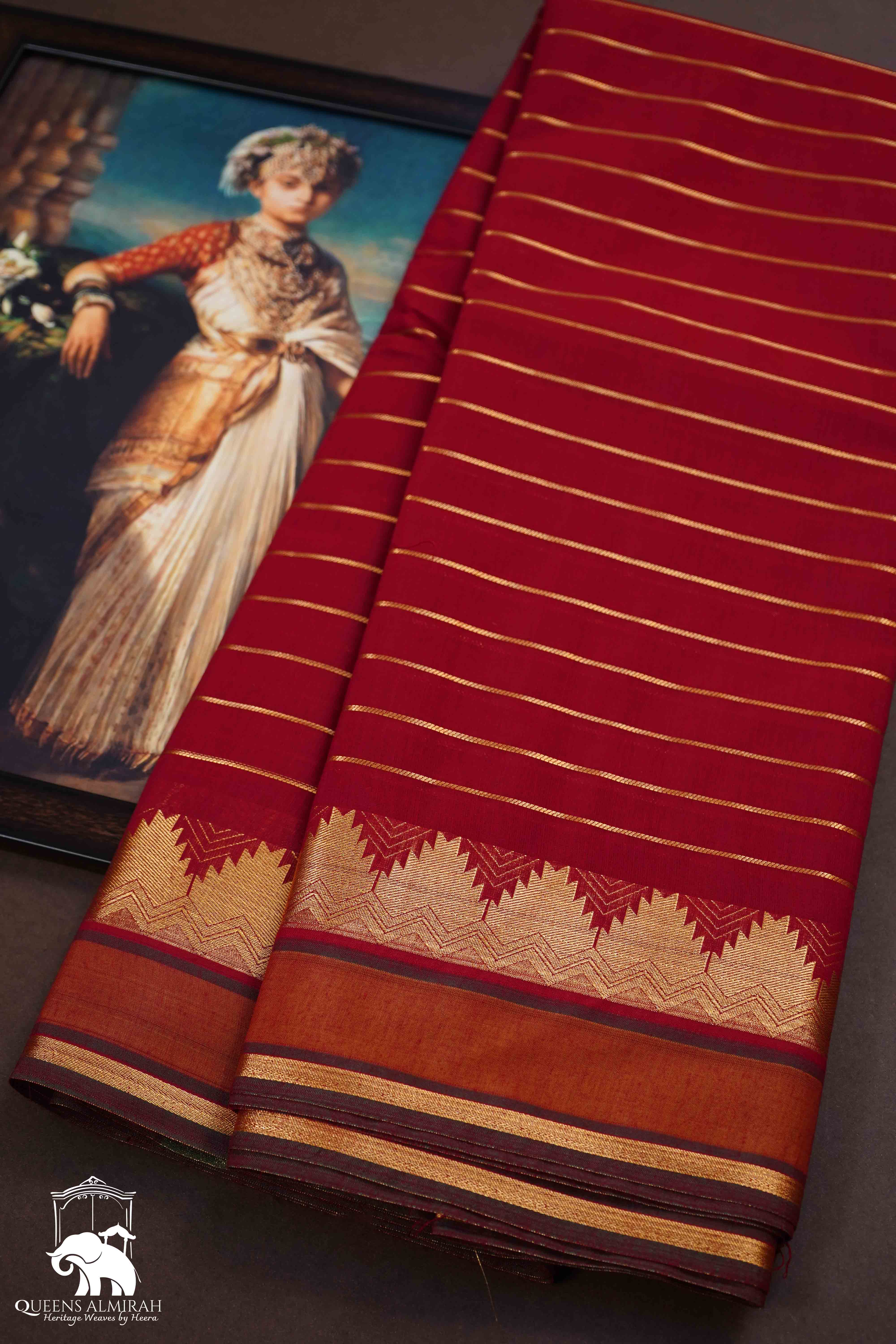 Transform into a vision of grace with the RED MAROON PURE SILK COTTON SAREE. This exquisite saree features a stunning golden border, intricate temple korvai, and elegant horizontal pattern. Crafted from a luxurious blend of silk and cotton, it offers both opulence and comfort. Ideal for any occasion, this saree is a must-have in every wardrobe.
