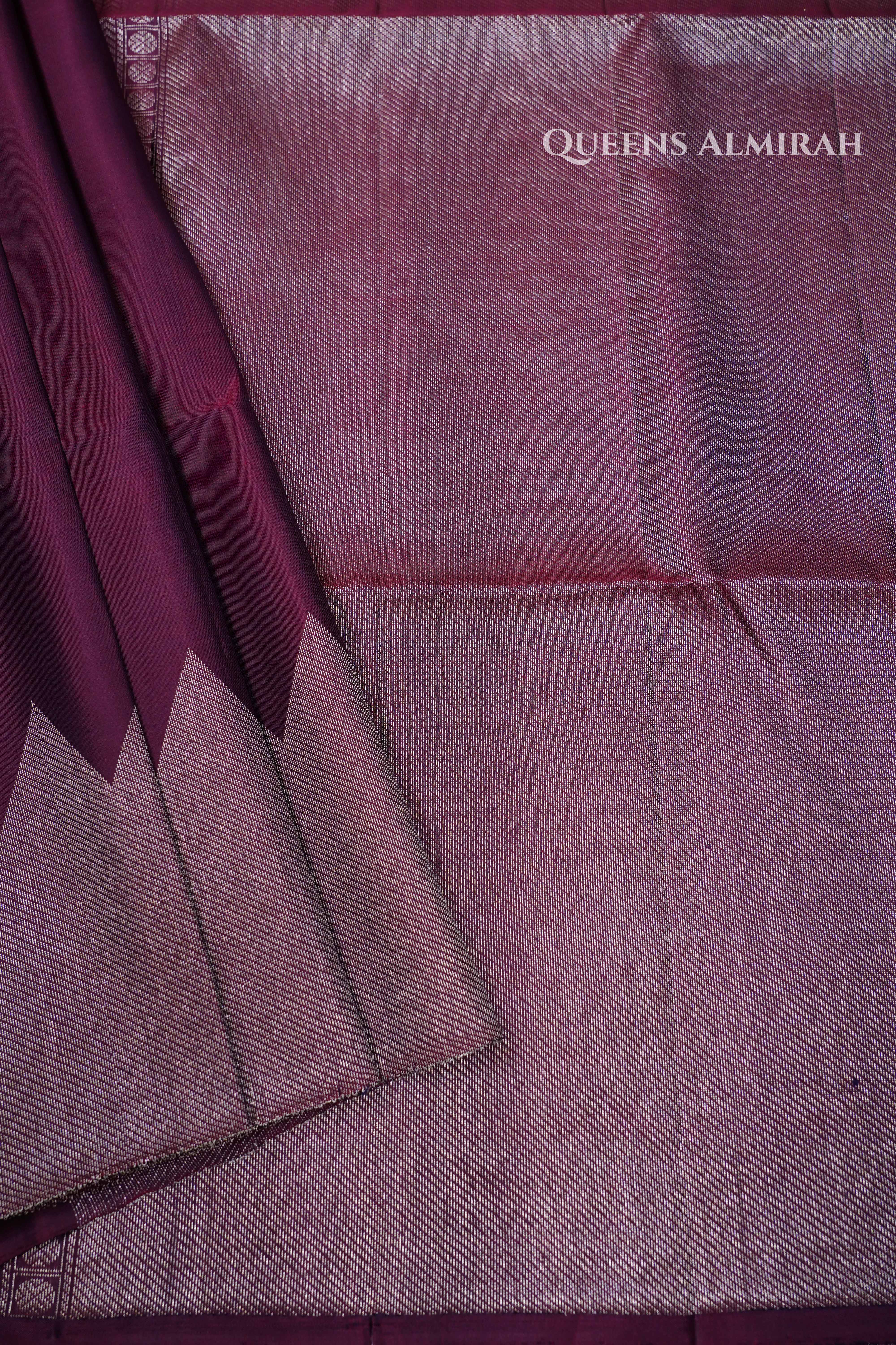 This Red Wine Soft Silk Saree exudes timeless charm with its rich body and striking silver zari temple border. The intricate weave enhances its traditional appeal, making it an elegant choice for festive occasions, weddings, and cultural celebrations. A perfect drape from Queens Almirah that blends heritage with sophistication.