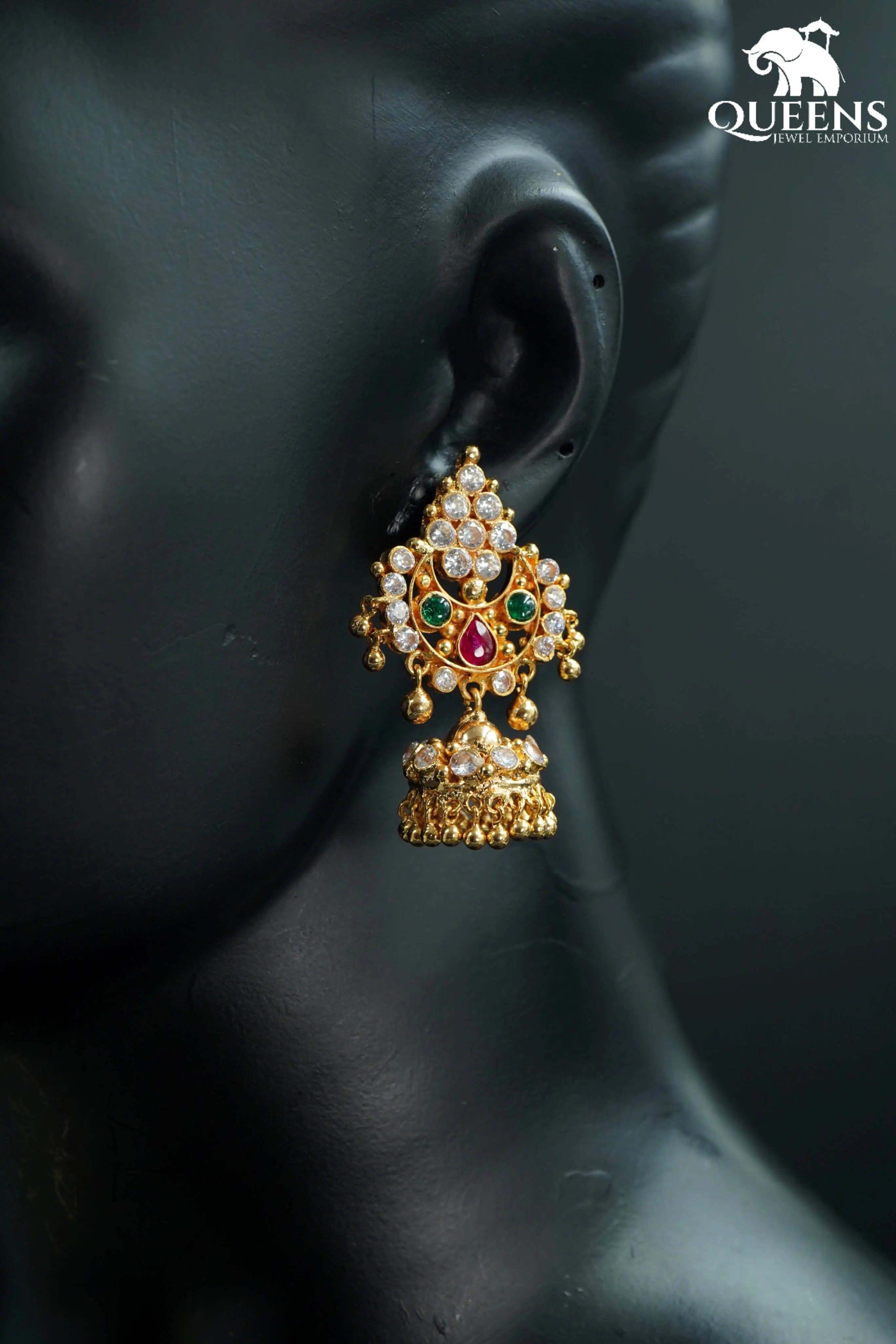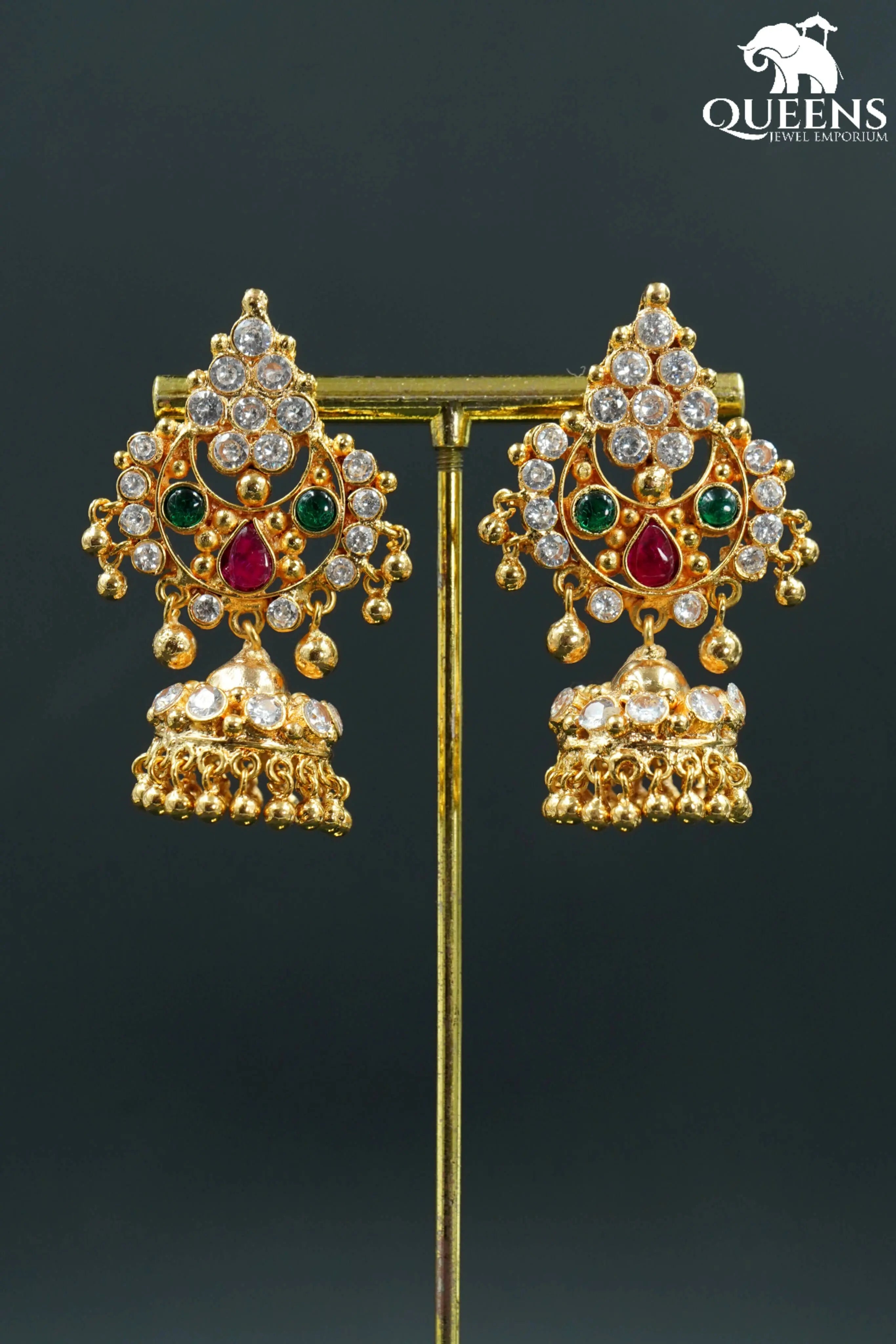 Immerse yourself in the captivating world of South Indian design with these exquisite zircon and Kemp jhumkas. Crafted in gleaming gold-plated silver alloy, these cascading earrings feature a captivating interplay of sparkling zircons and rich Kemp stones, creating a symphony of color and cultural significance.
