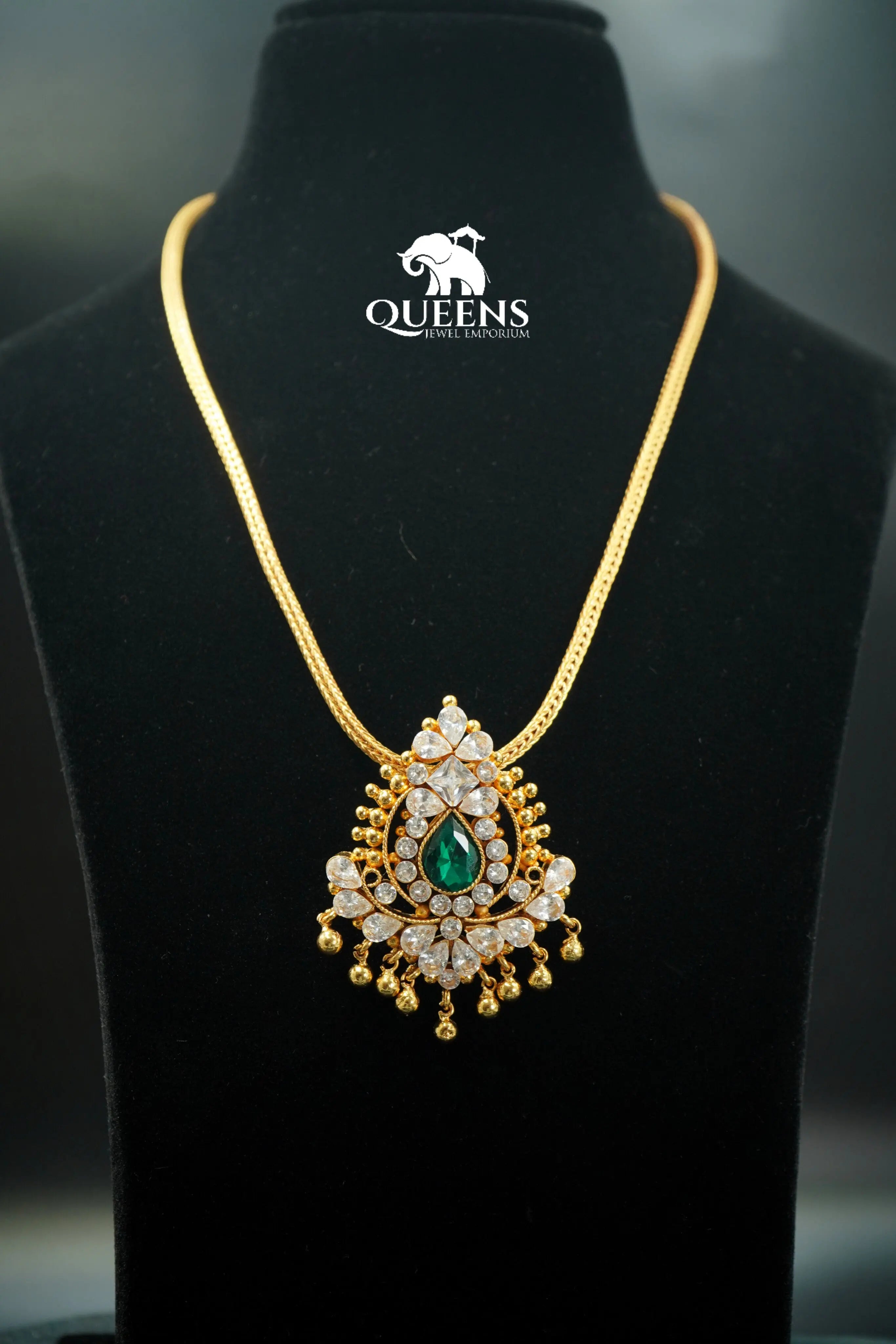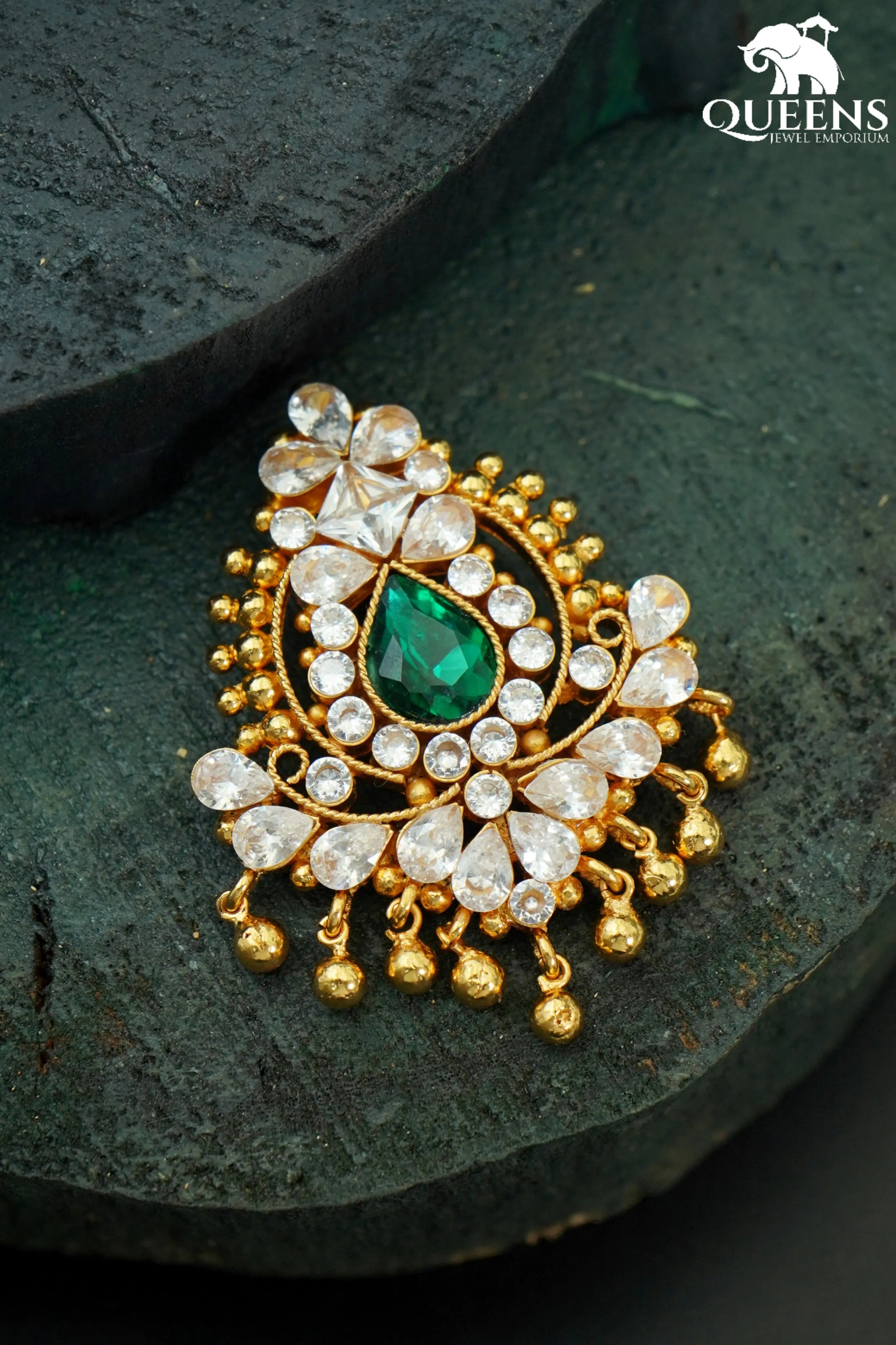 Introducing the ROOPITHA PENDANT, a stunning addition to any traditional South Indian jewelry collection. This pendant features sparkling zircon and green stones, highlighted by elegant gold balls and perfect for any wedding or special occasion. Elevate your Pattu Sarees with this beautiful pendant.