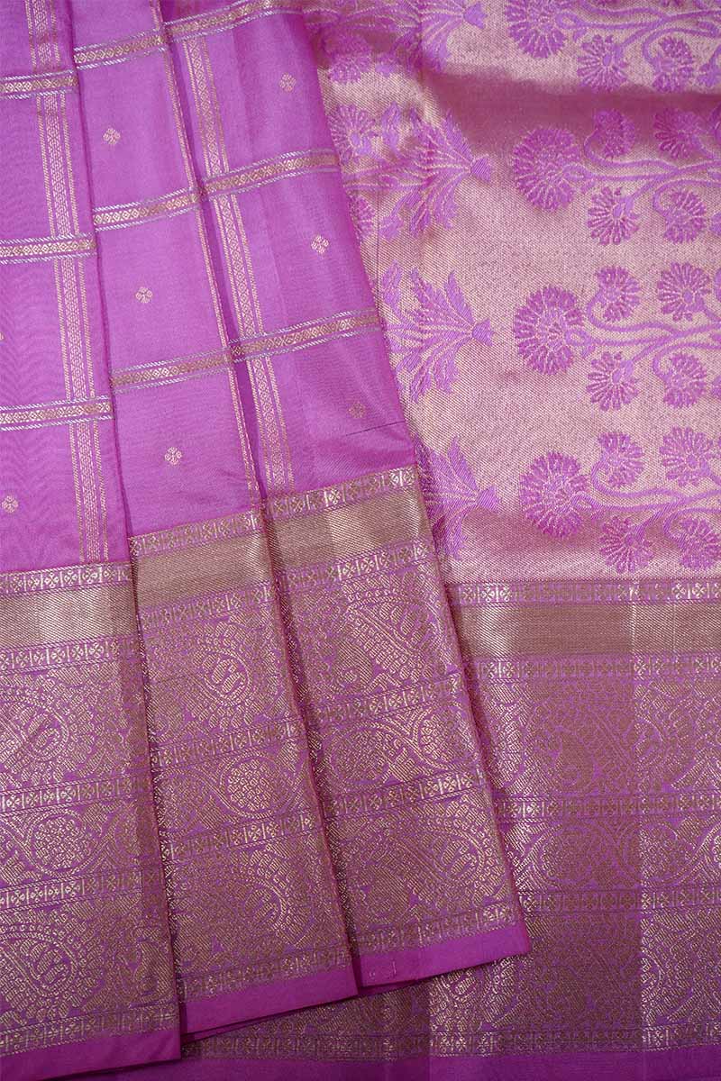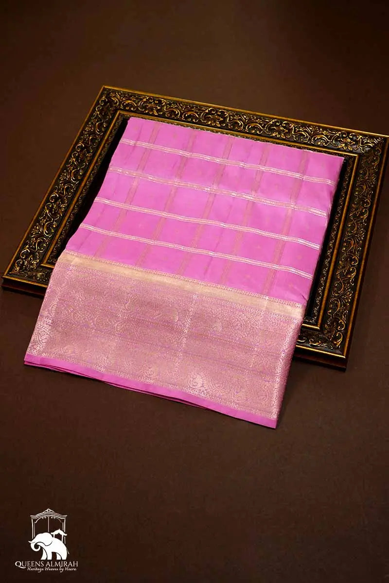 This Rose milk pink saree is crafted from the finest quality silk. Featuring a beautifully woven border and a striking big checked pattern, it adds elegance and visual appeal to your wardrobe, making it a must-have piece for any occasion.