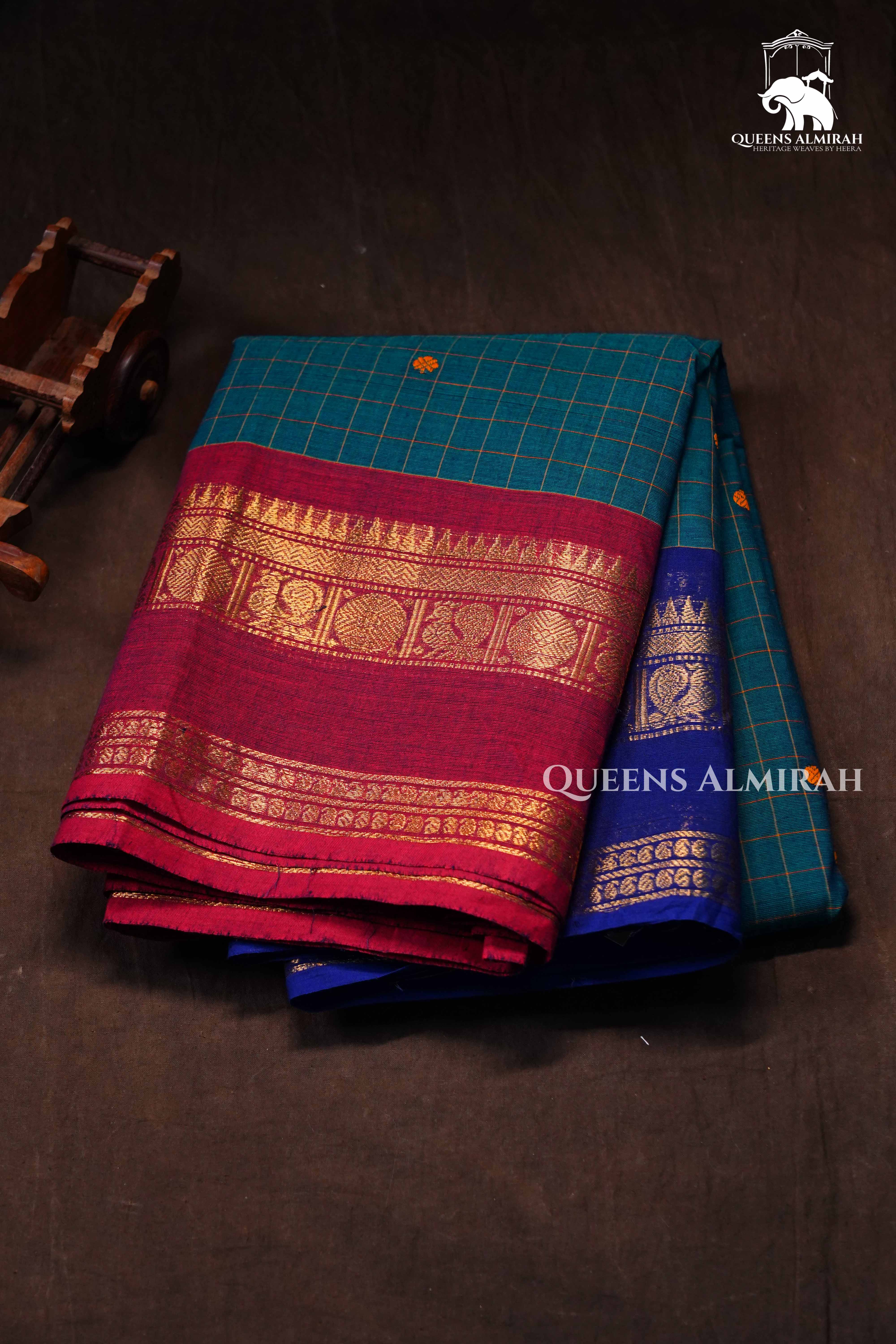 This exquisite Royal Blue Kanchi cotton saree is designed with delicate checks and adorned with small woven motifs across the body, adding a touch of subtle charm. The black border with intricate golden zari patterns enhances its elegance, making it perfect for traditional functions, festive occasions, and cultural celebrations. Crafted from premium quality cotton, this saree ensures both comfort and sophistication.