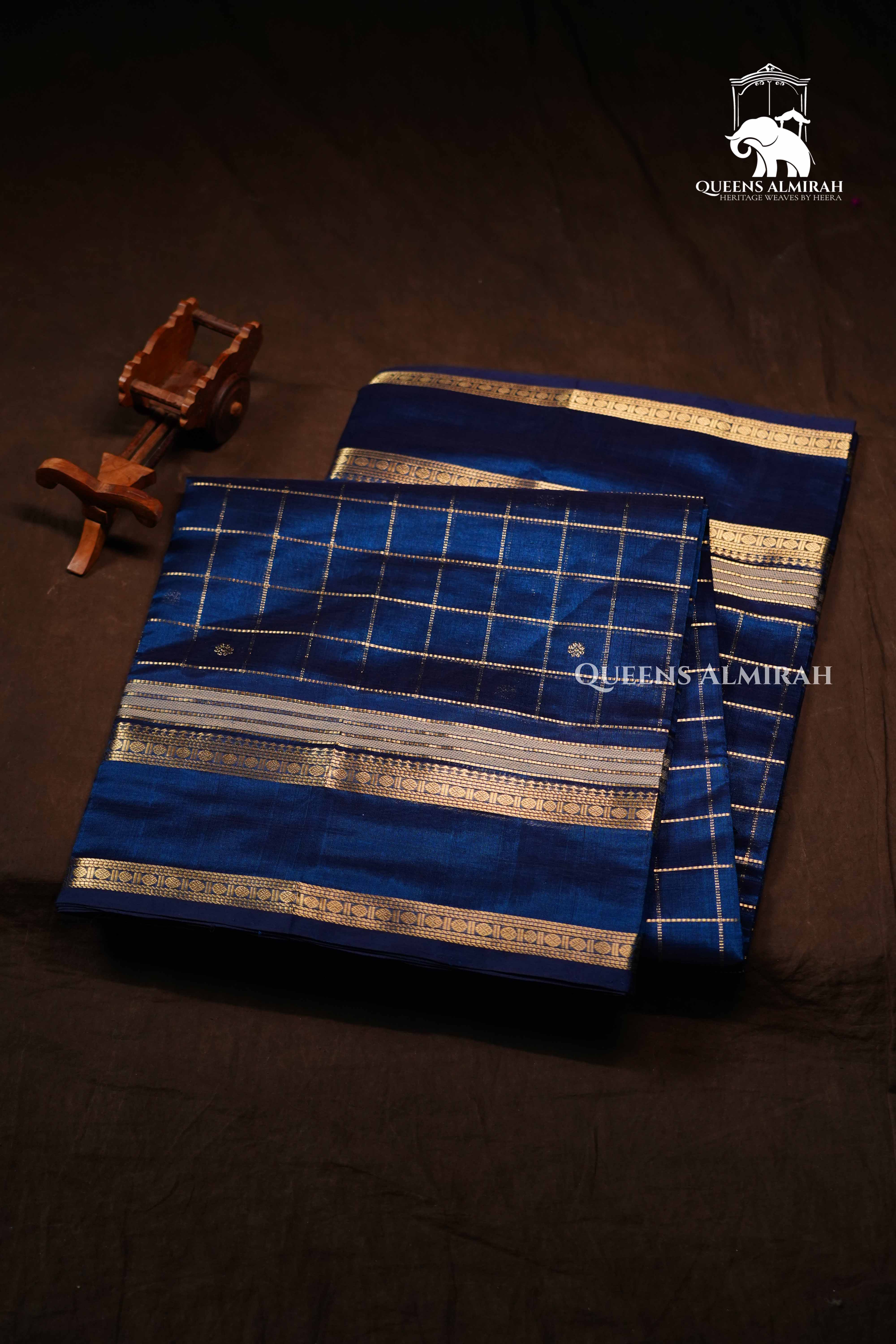 “An exquisite royal blue Chettinad silk cotton saree adorned with delicate golden zari checks and a traditional border, exuding elegance and grace for festive and formal occasions.”
