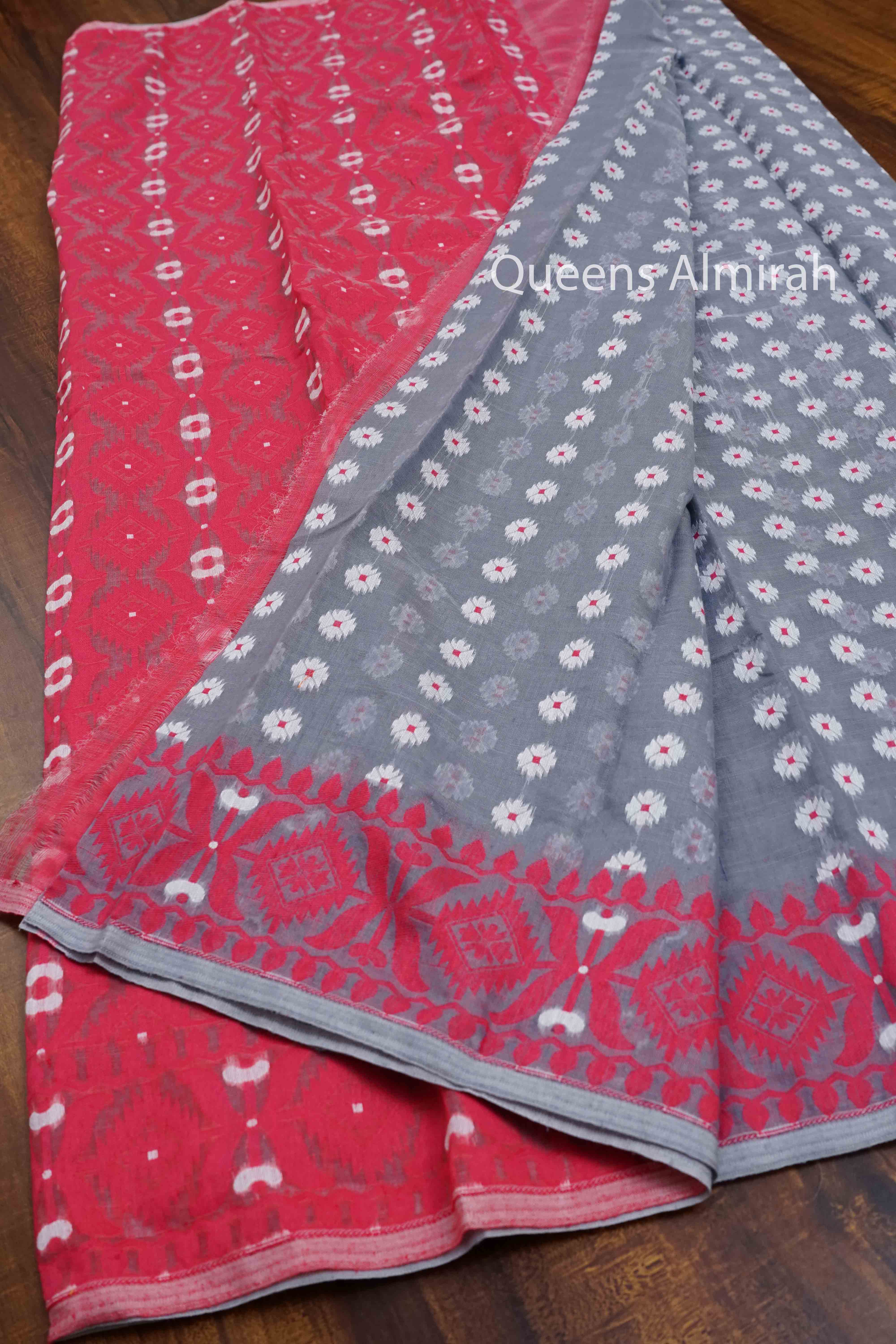 Elevate your wardrobe with the Ash Grey With Pink Cotton Saree. Made from soft and breathable fabric, it offers both luxury and comfort for any weather and occasion. Expertly crafted for a timeless and elegant look, this saree comes with an attached blouse for added convenience. Perfect for those seeking a touch of sophistication.