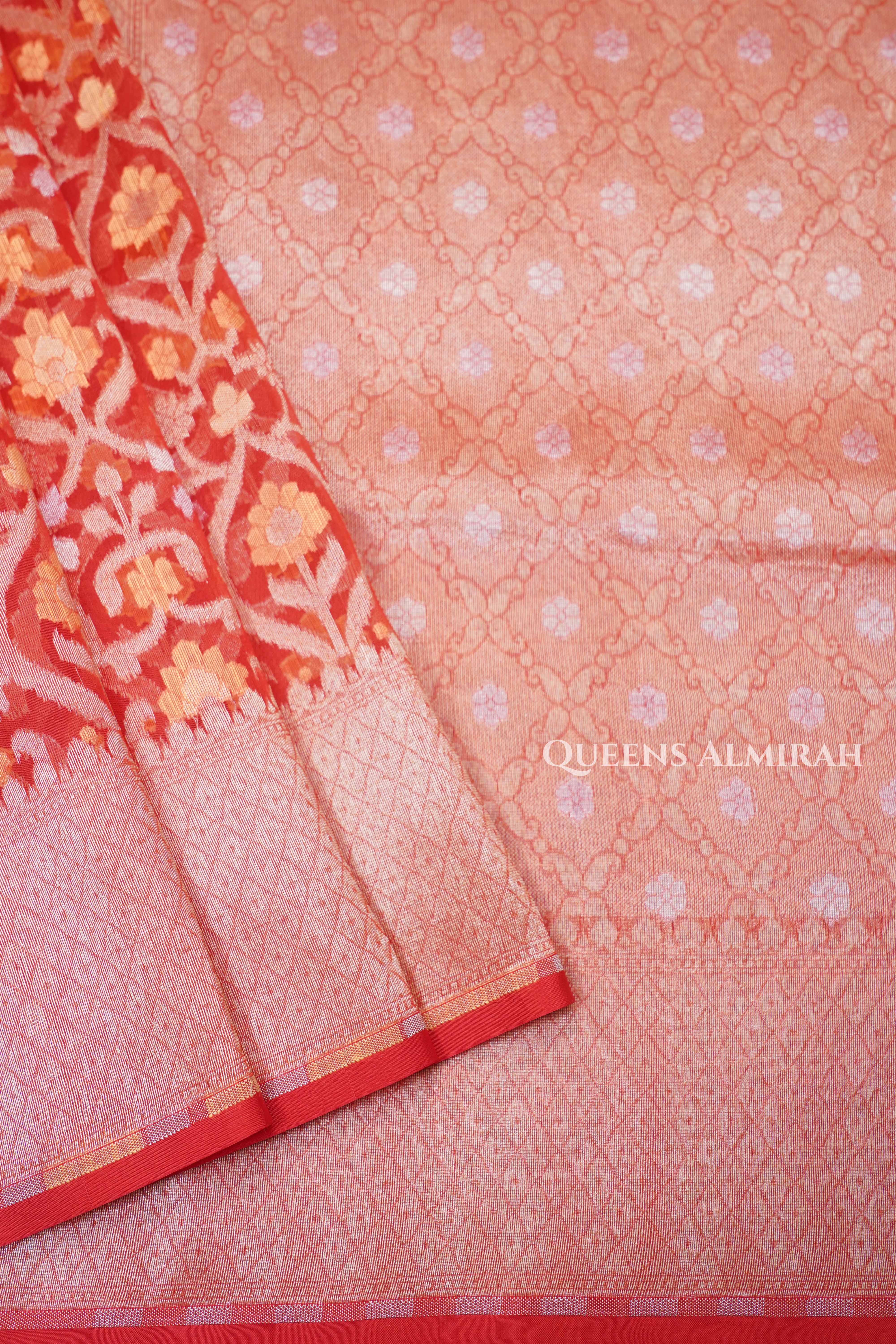 This stunning Banarasi Organza saree in rich rust orange features an exquisite Kodi pattern intricately woven with zari detailing. The soft organza texture adds a sheer elegance, making it perfect for Muhurtham moments or a graceful Reception look. A beautiful blend of tradition and sophistication.
