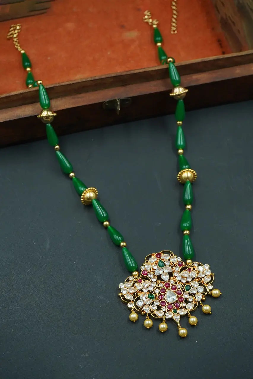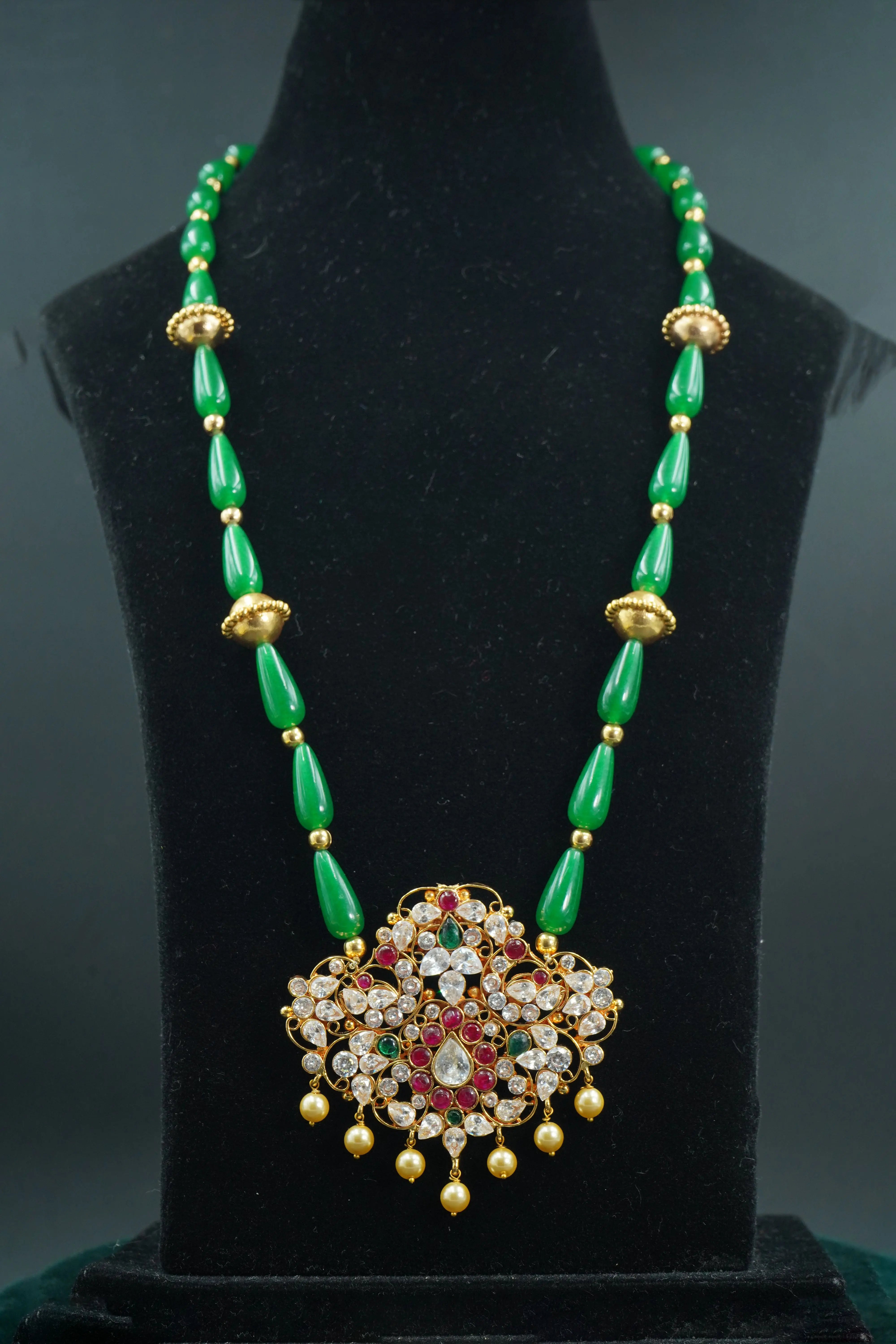 This captivating haram embodies South Indian heritage with modern flair. Crafted from high-quality, gold-plated silver alloy, it features captivating green onyx beads, sparkling zircons, and a delicate pearl. The rich green color and meticulous design exude sophistication, making this a versatile piece for everyday or festive wear.