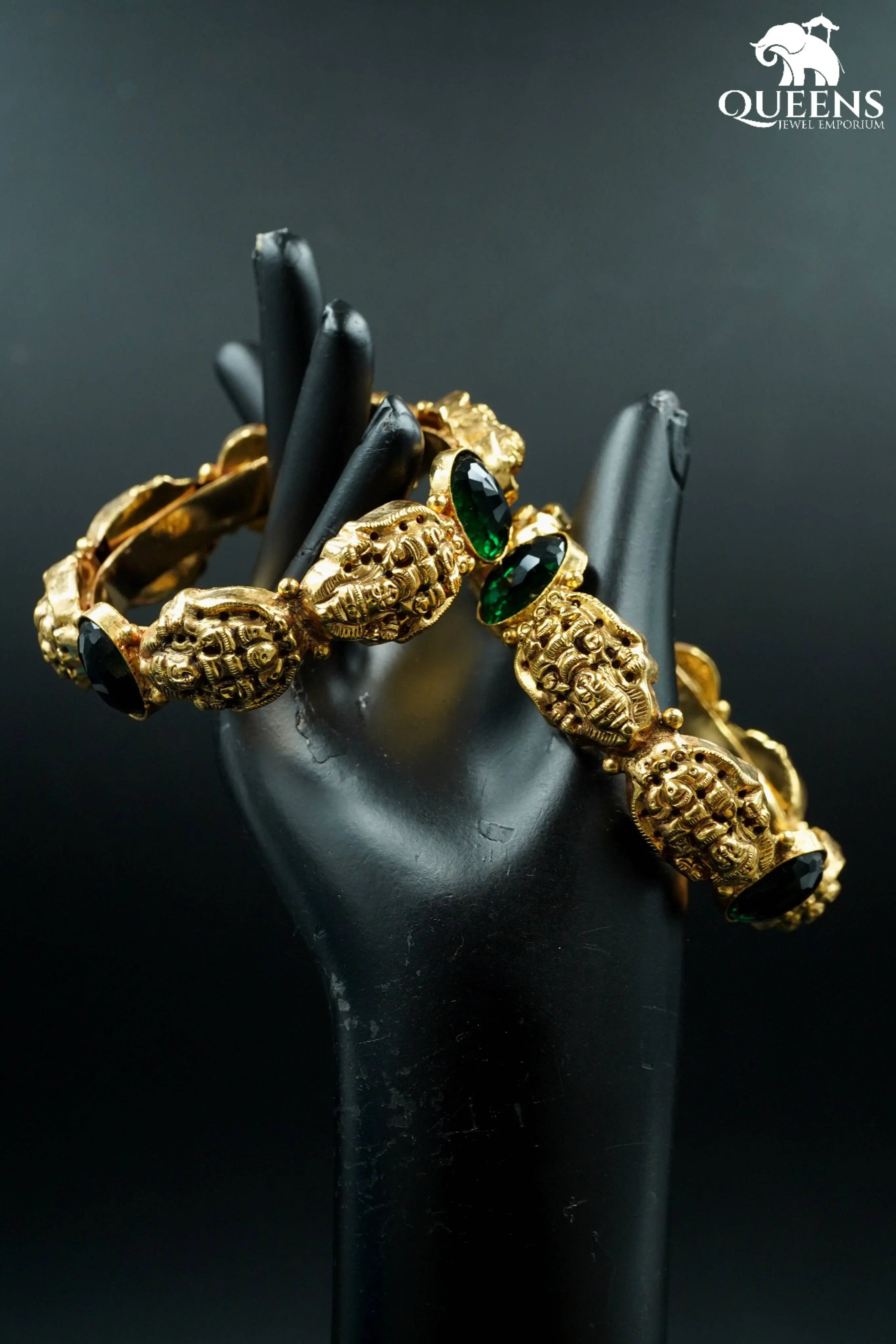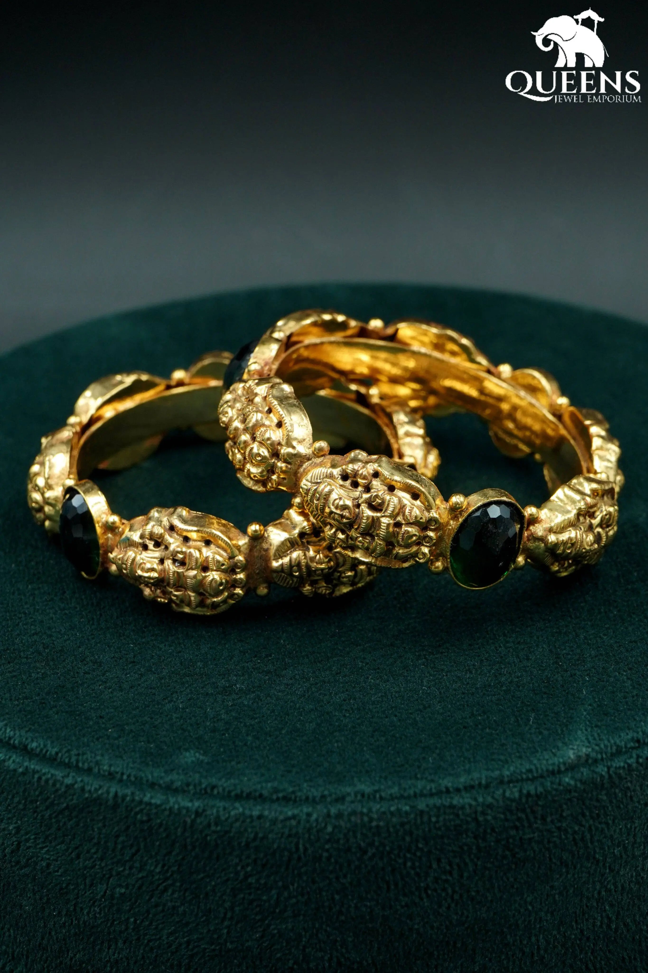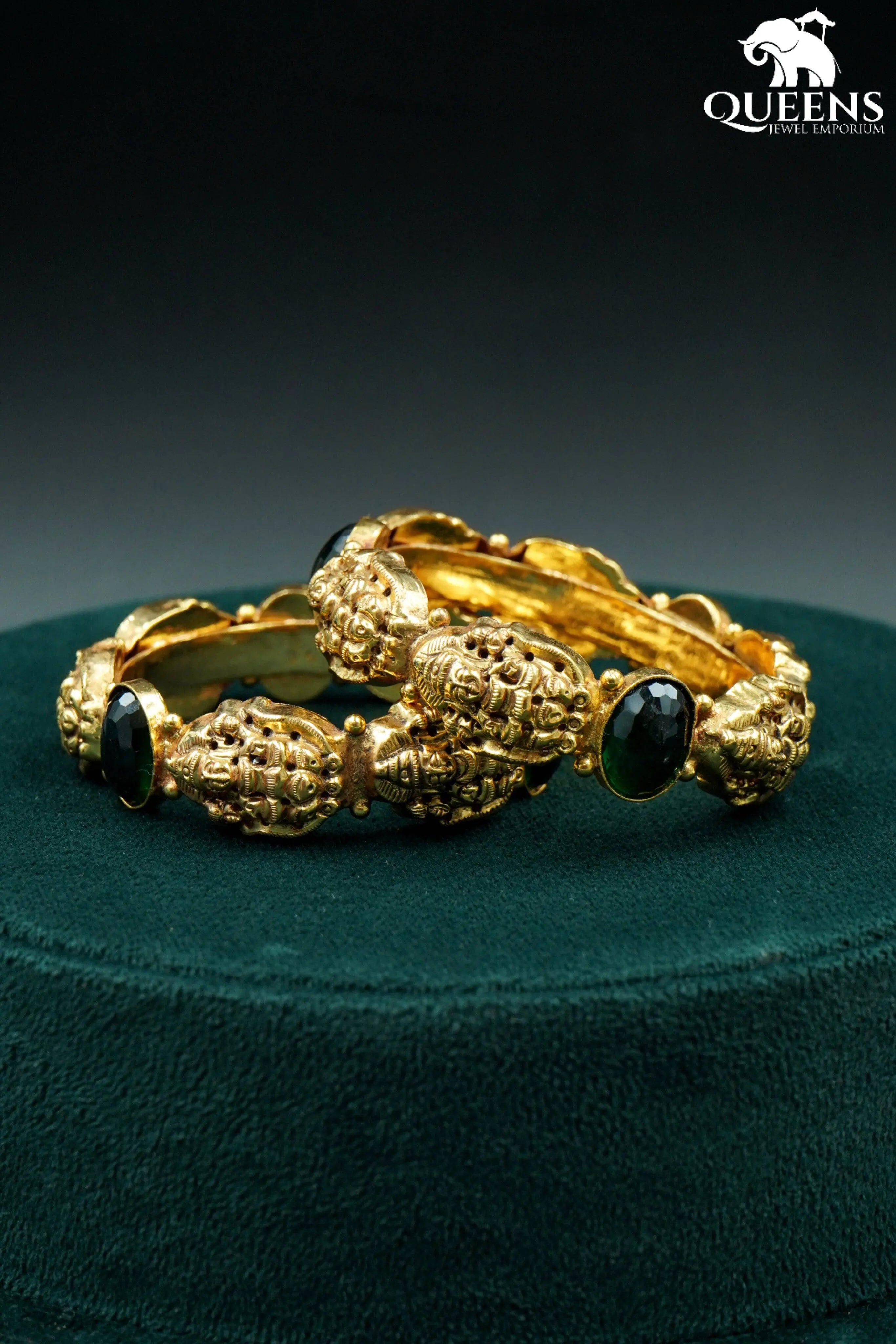 Embrace the timeless elegance of South Indian jewellery with the Green Kemp Nagas Bangles featuring the Lakshmi motif. These captivating bangles are a stunning fusion of vibrant color, cultural symbolism,Special occasion for onam.