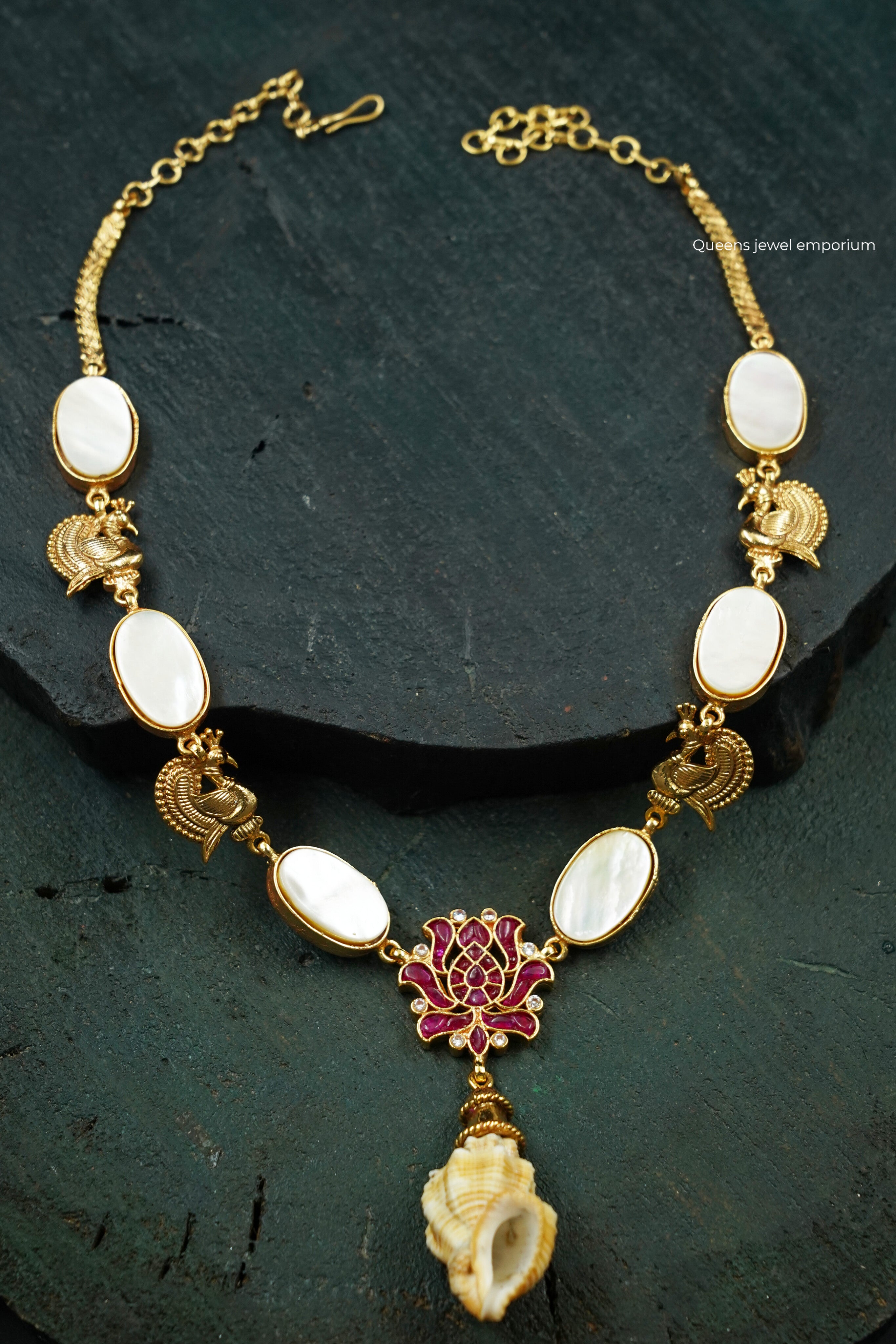 Elegant Necklace featuring lotus motifs with red kemp stones, paired with oval Mother of Pearl stones and nagas peacock designs arranged alternately in the chain. Finished with a cute sangu design hanging, adding a touch of divine charm. Handcrafted by Queens Jewel Emporium, where heritage meets timeless grace.