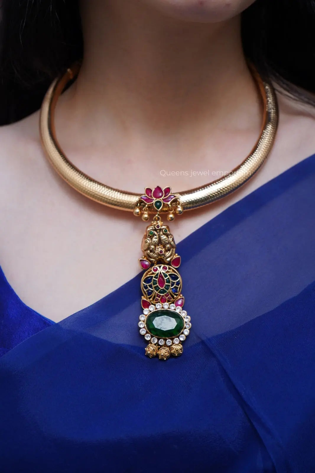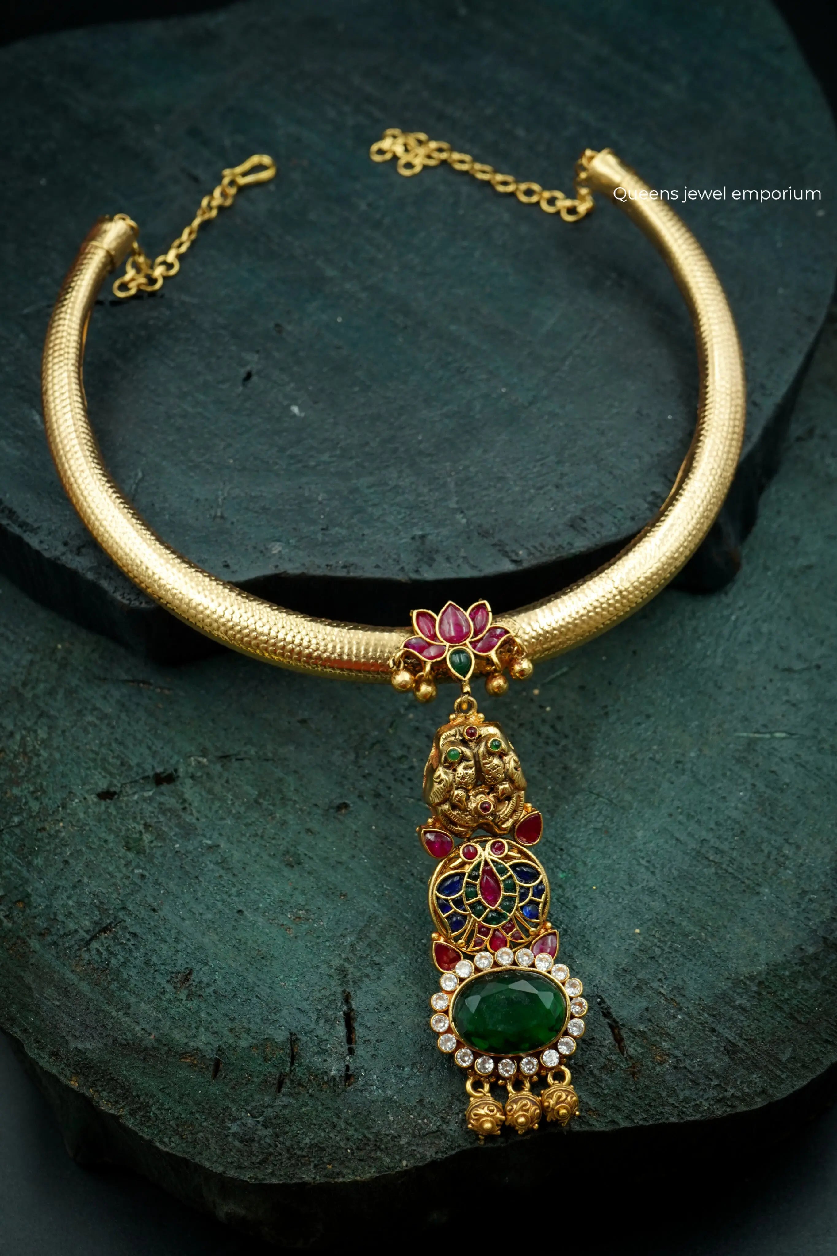 Elevate your South Indian look with SAMYUKTHA NECKLACE. Crafted from 24CT gold-plated silver alloy using multiple thick gold sheets, this hasli necklace features a lotus design with bold green kemp stones and gold ball hangings. The perfect blend of elegance and tradition.