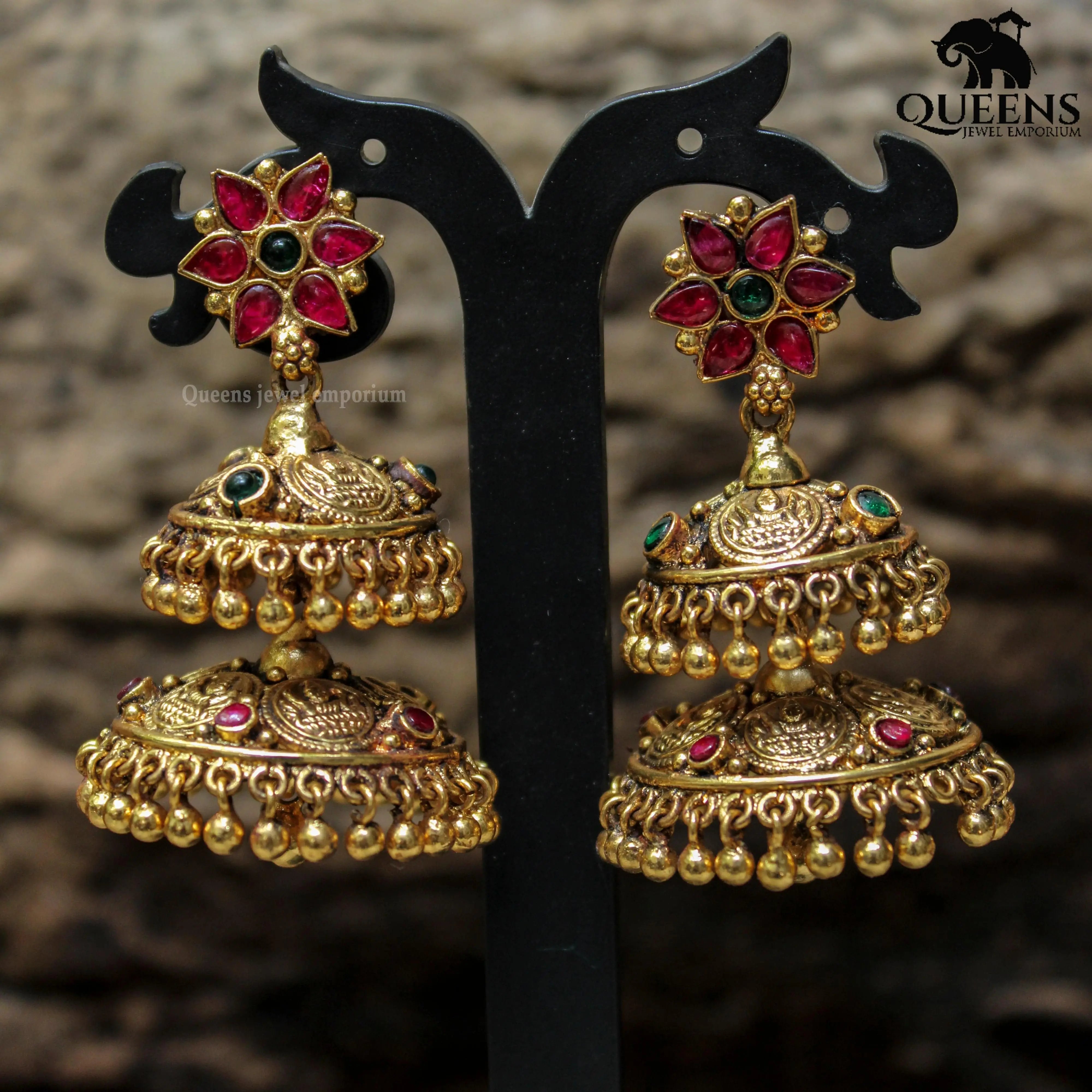 A TRADITIONAL JUMKA WITH TWO LAYERS ADORNED WITH RED KEMP STONES AND A CUTE STUD WITH SOUTH SCREW TO ENSURE SAFETY