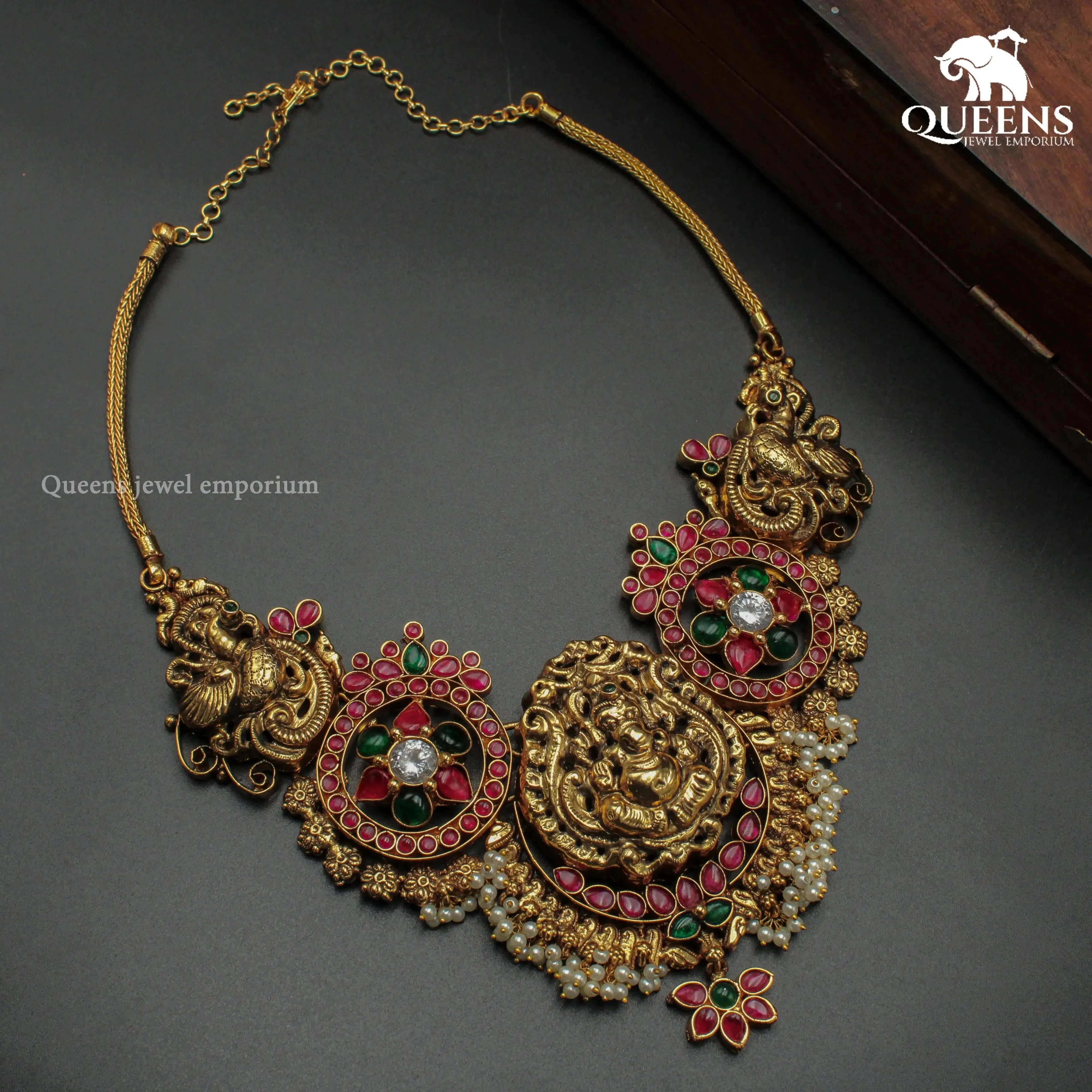 THIS KIND OF NECK SETS ARE PREFERABLE FOR WEDDINGS AND SPECIAL OCCASIONS. THIS STATEMENT PIECE ARE ELABORATE AND THE FINE WORK ON THEM IS BEAUTIFUL AND INTRICATE. IT GOES WELL WITH TRADITIONAL OUTFITS AND PROVIDES A CHIC AND GRACEFUL APPEARANCE AND MAKE YOU LOOK MORE ELEGANT AND ETERNAL. KEMP STONES, PEARLS ARE USED IN THIS SET