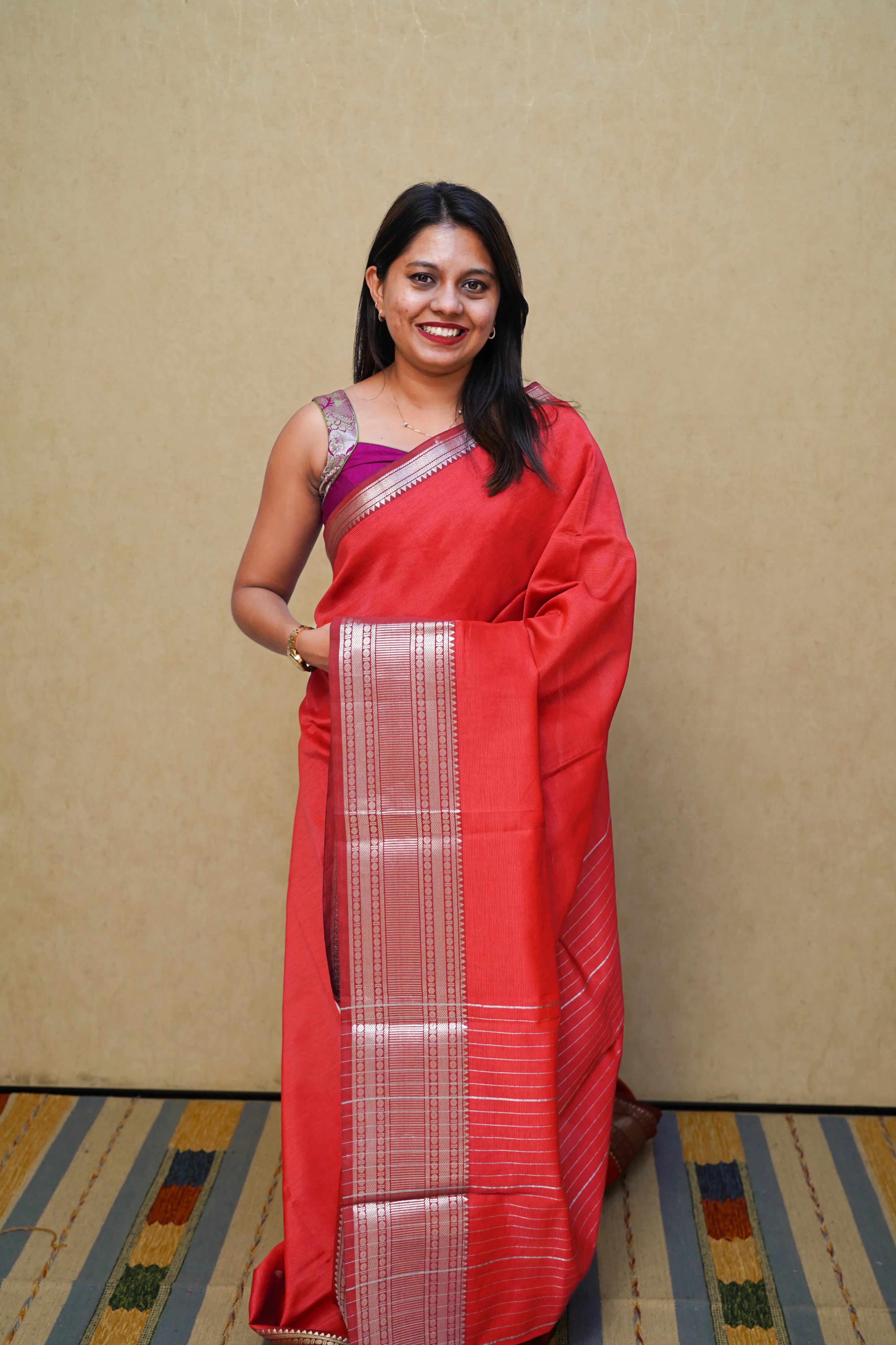 This SINDOOR RED saree with a beautiful woven border exudes elegance and luxury. Made from high-quality fabric, it offers comfort and style for any occasion. The exquisite color and intricate design will surely make you stand out.