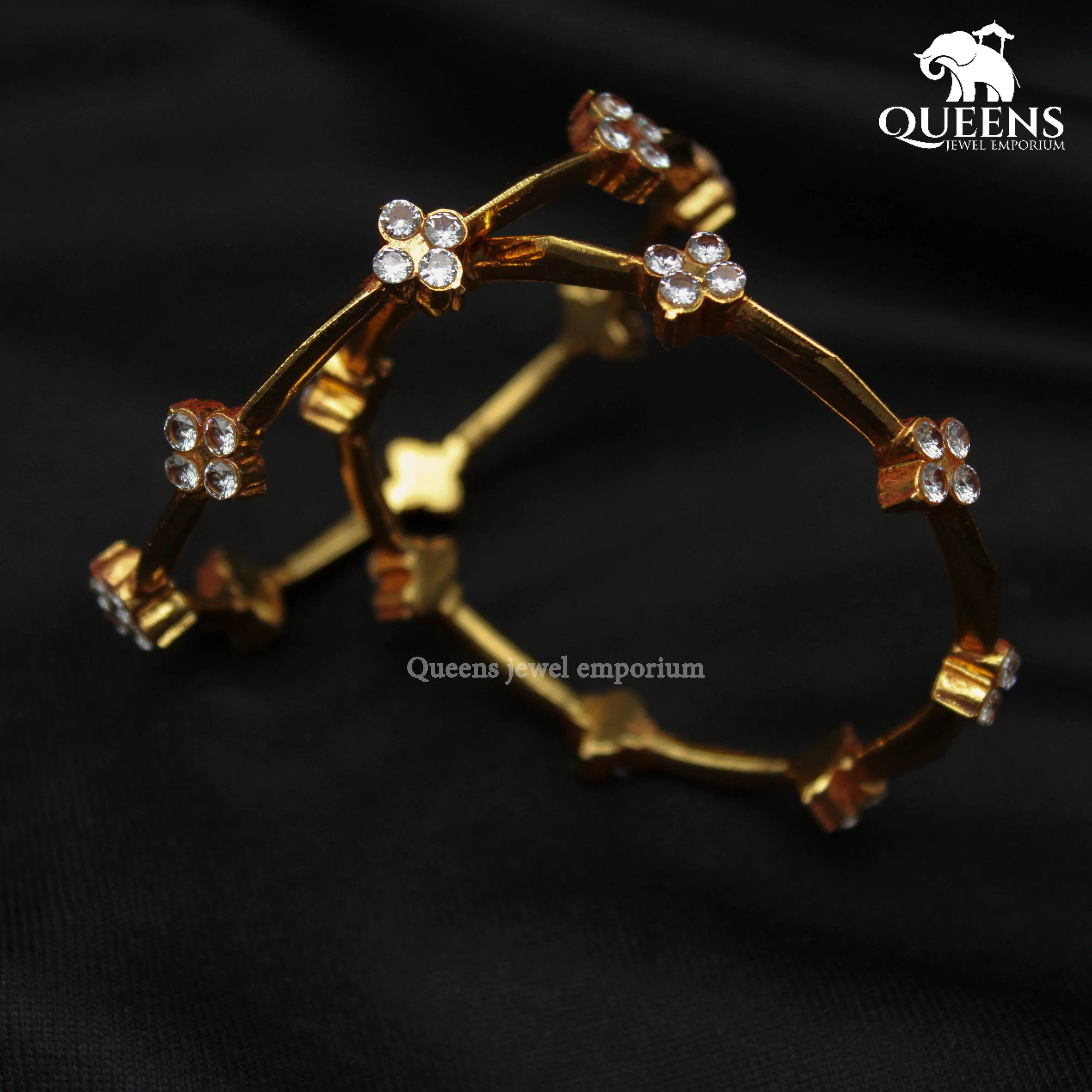 A beautiful pair of bangles from the exclusive bangle collection of Queens waiting to be selected by the queens out there. Frequent square designs with sparkling white zircons make it a simple one to wear for all occasions