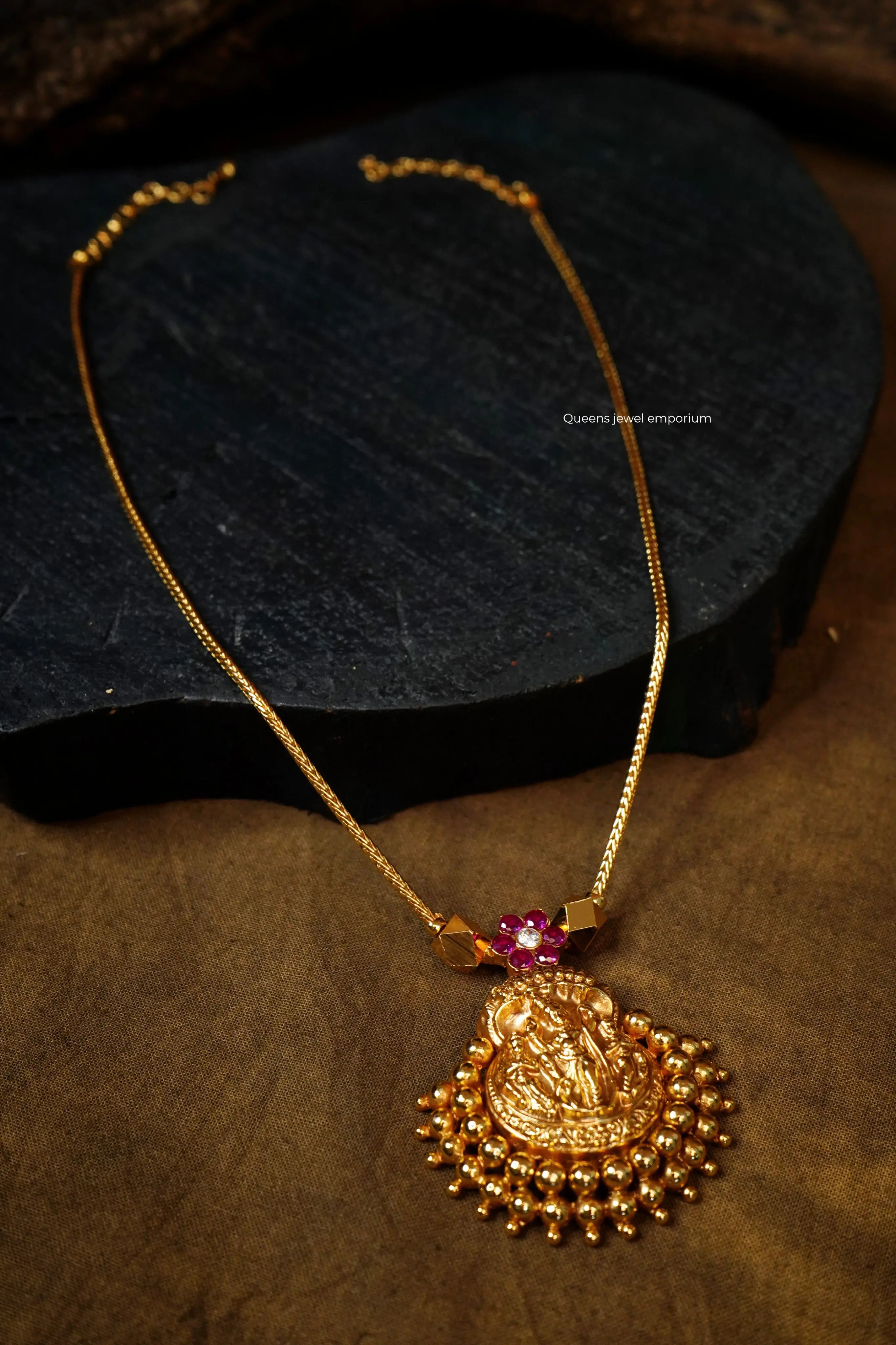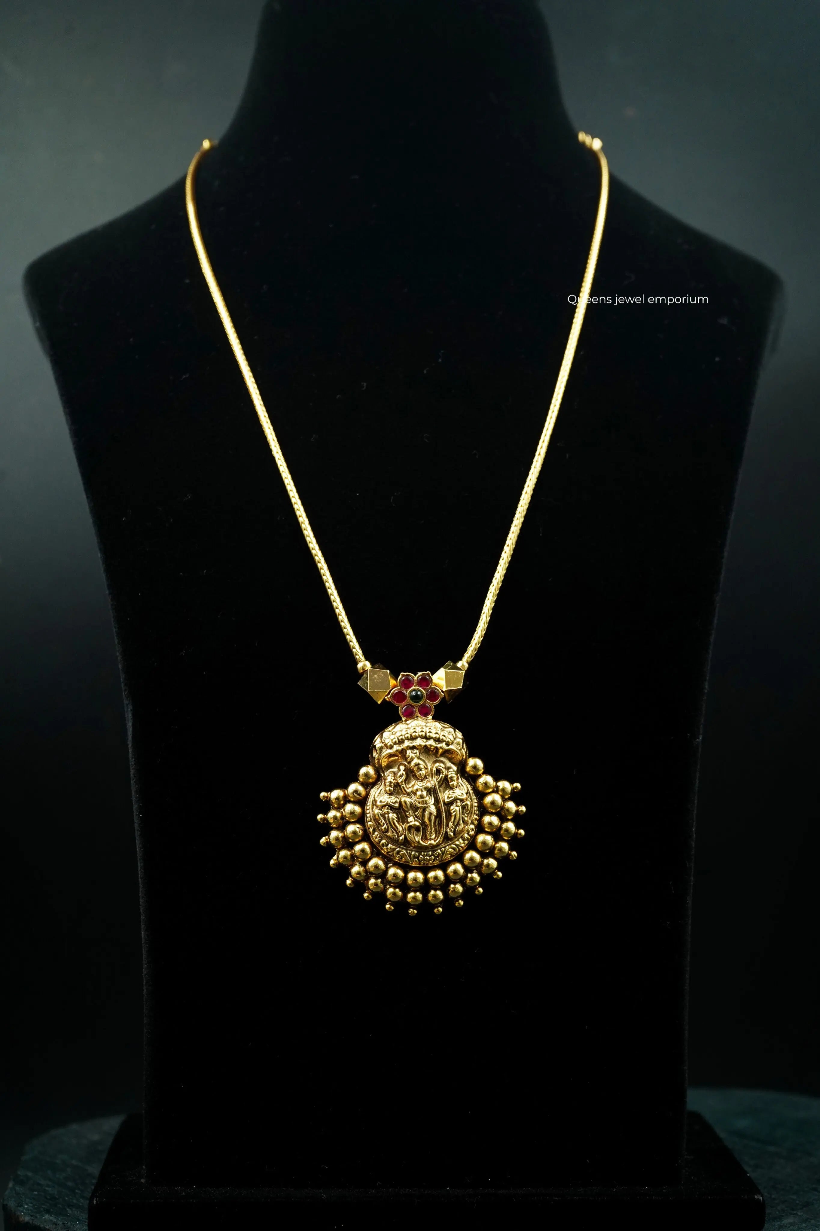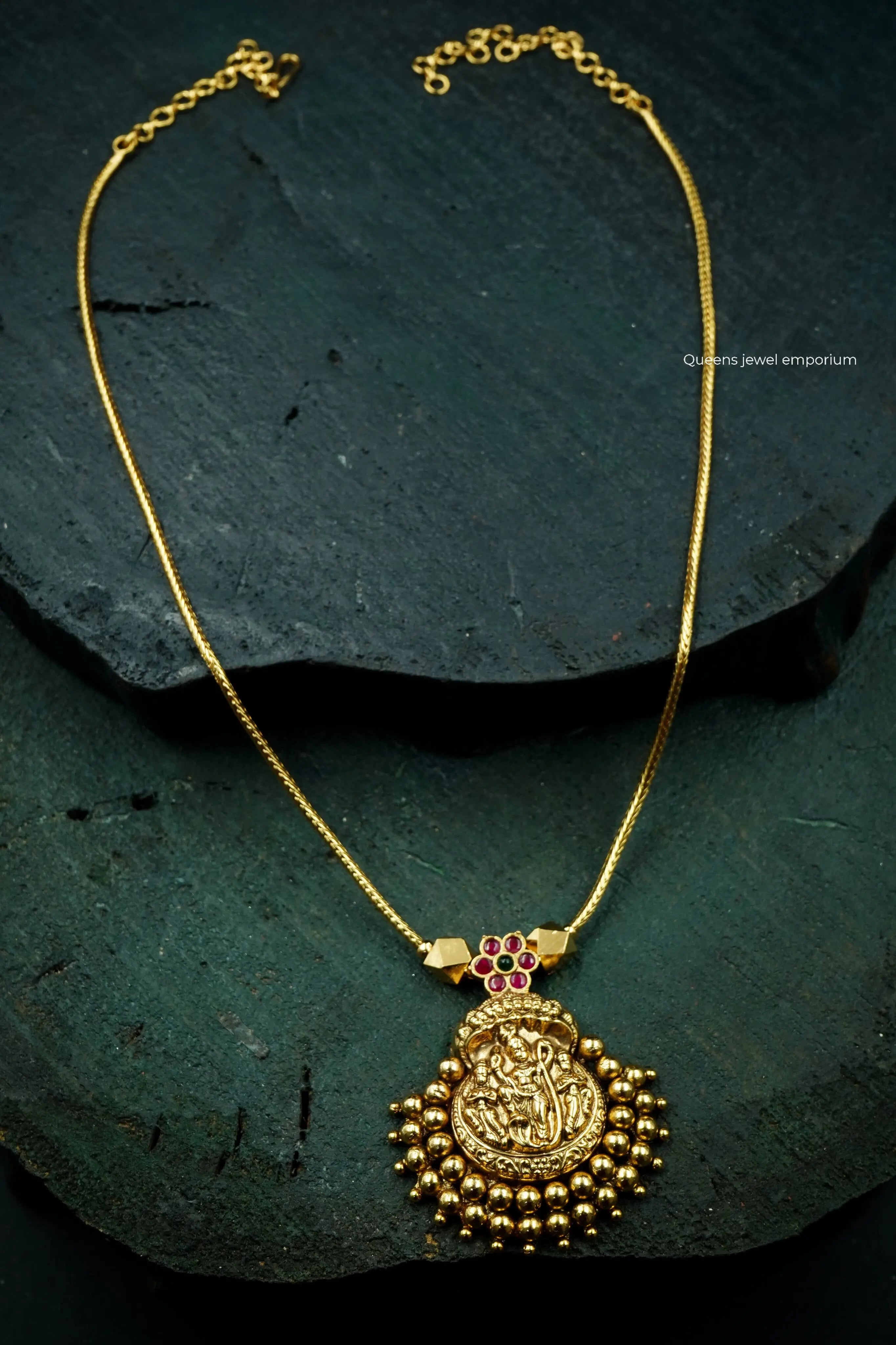 Introduce a touch of South Indian elegance to your ensemble with our SREE LEEL NECKLACE. Featuring two Nagas balls, a delicate floral design, and a Krishna pendant, this 24CT gold-plated silver alloy necklace adds a charming finish to any outfit. Perfect for traditional occasions and paired beautifully with sarees.