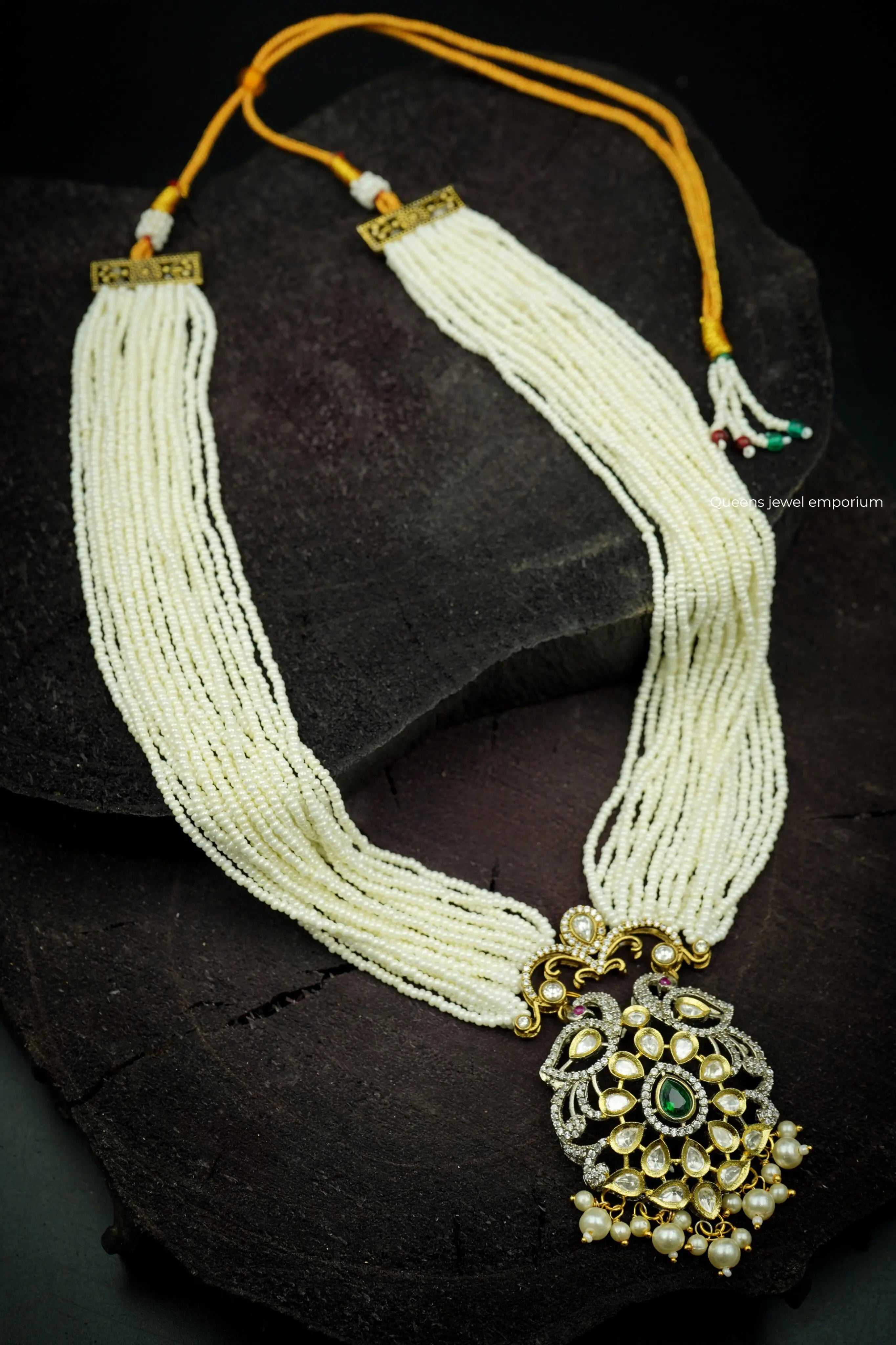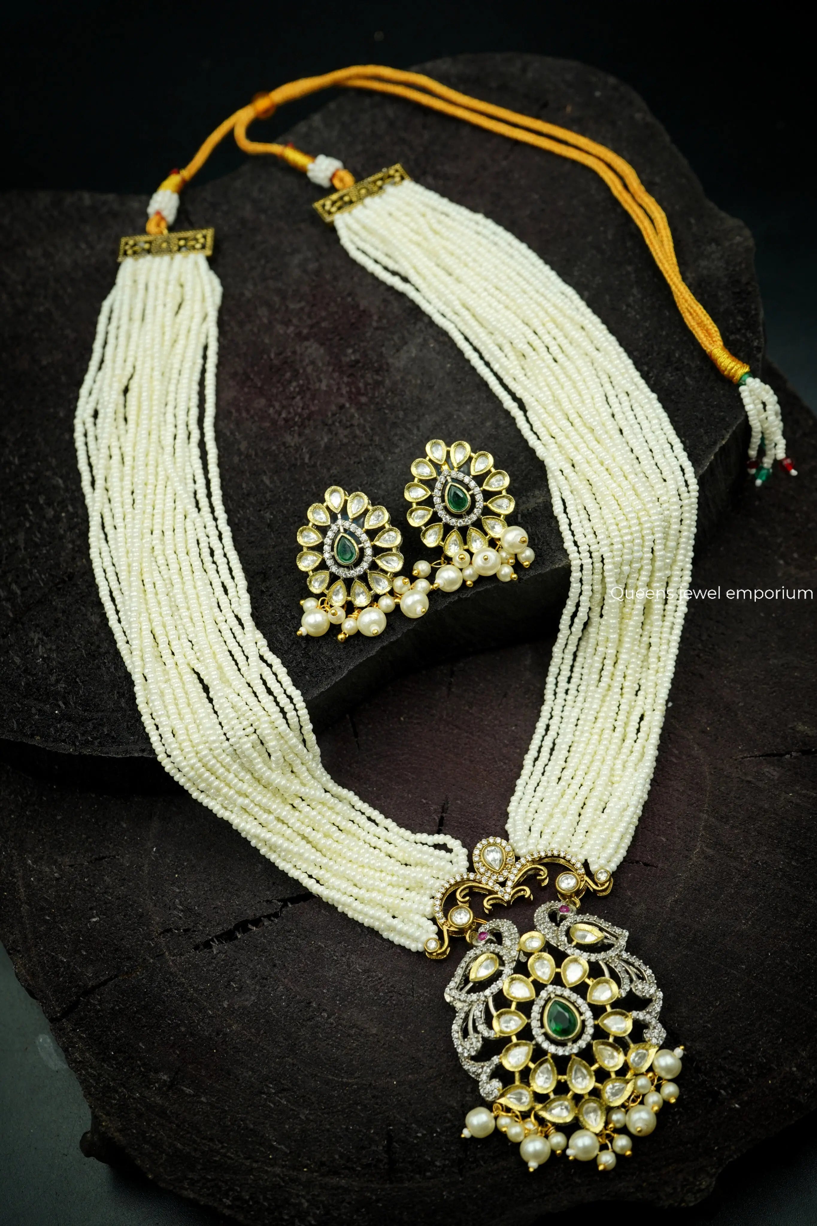 This SRINISHA HARAM is a stunning example of expert craftsmanship, featuring intricate Kundan stones and delicate pearl hangings. The matching earrings, attached with a tassel rope, add an elegant touch to this premium quality piece. Elevate your jewelry collection with this timeless and beautifully designed piece.