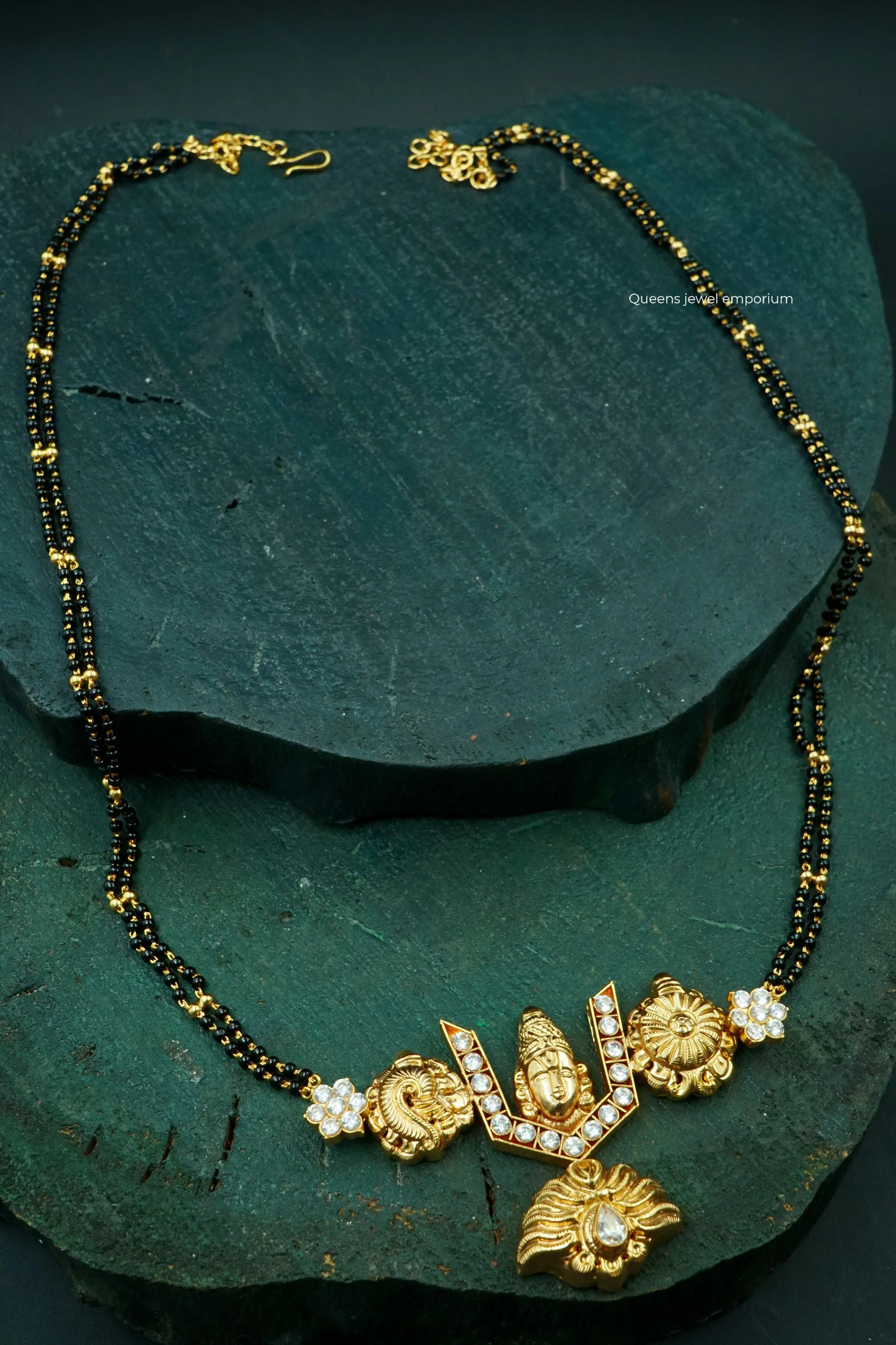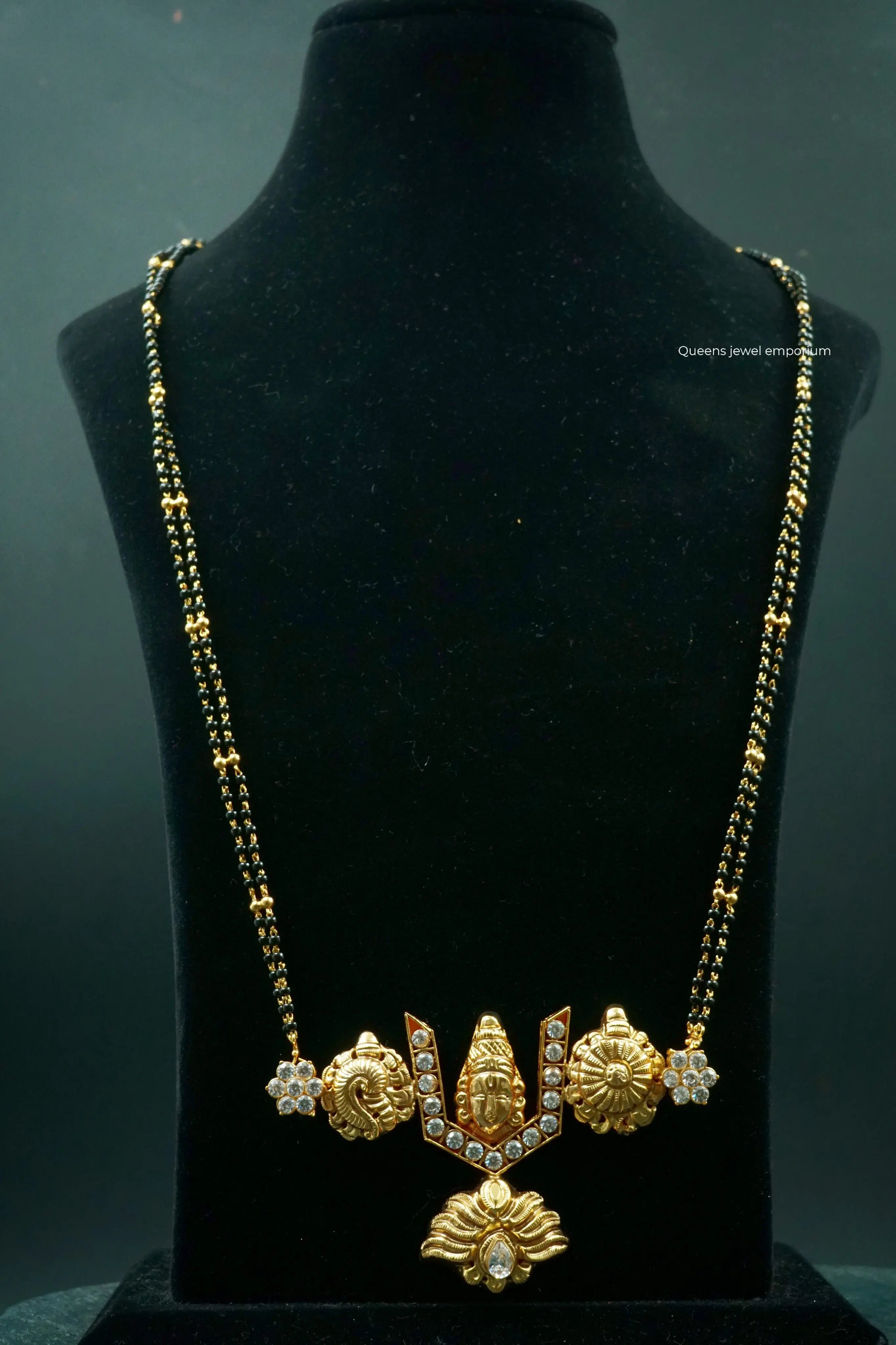 This graceful Mangalsutra Haram features a divine Balaji face motif paired with intricate floral designs, embellished with sparkling zircon stones. Handcrafted in 24CT gold-plated silver alloy, it exudes spiritual elegance and traditional South Indian charm