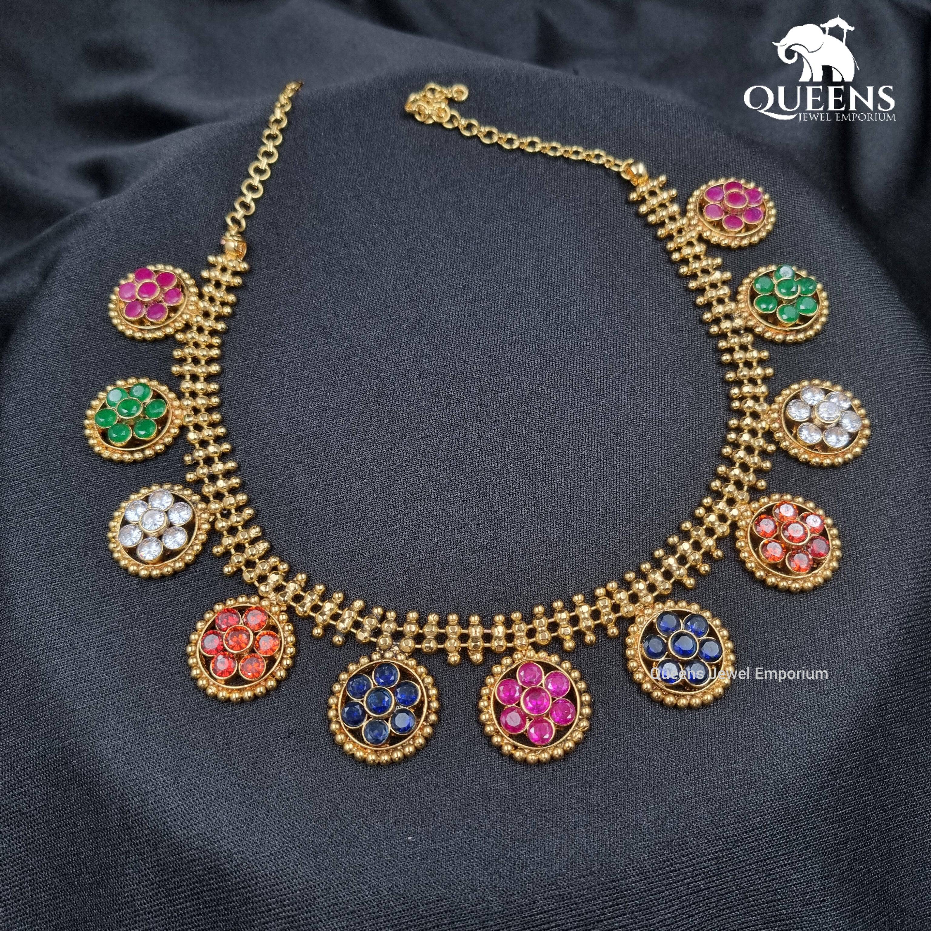 Played with colours ,this strikingly beautiful multi tone necklace is inspired from the historic temple ornaments. A mix of rare multi zircons studded necklaces in a flexible style designed to suit all the necks.