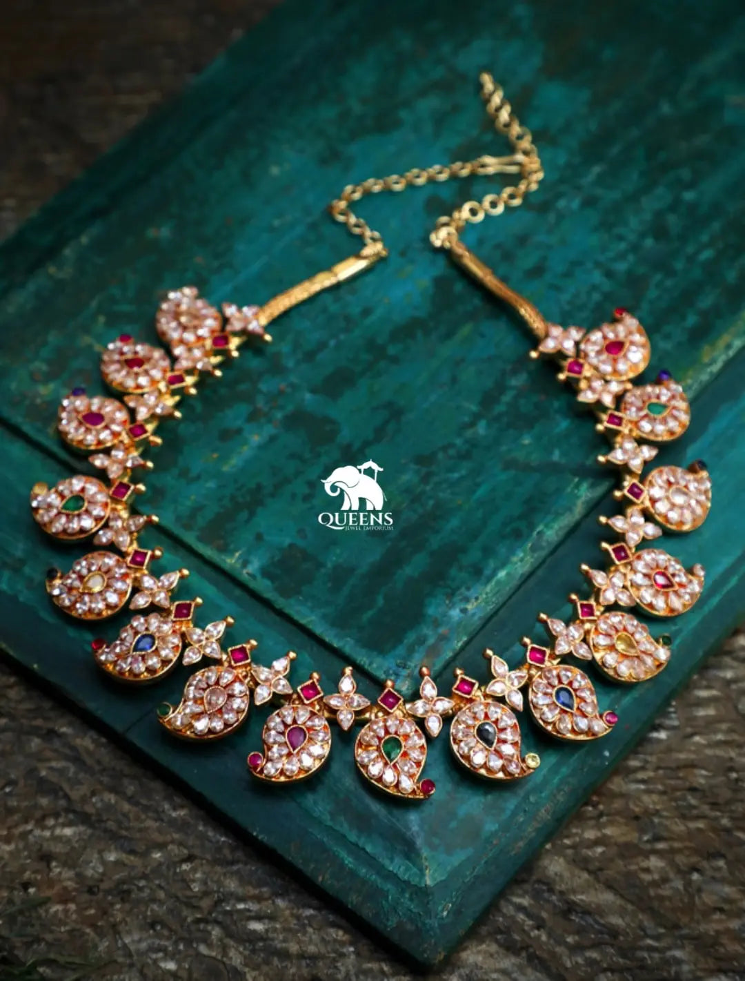 Tressure box of our grannies would have definitely had such aesthetic vintage beauties. One such replica is this heritage mango mala intricately crafted with zircon stones and highlighted with navarathna stones. Wear this sparkling beauty to make heads turn with awe!!