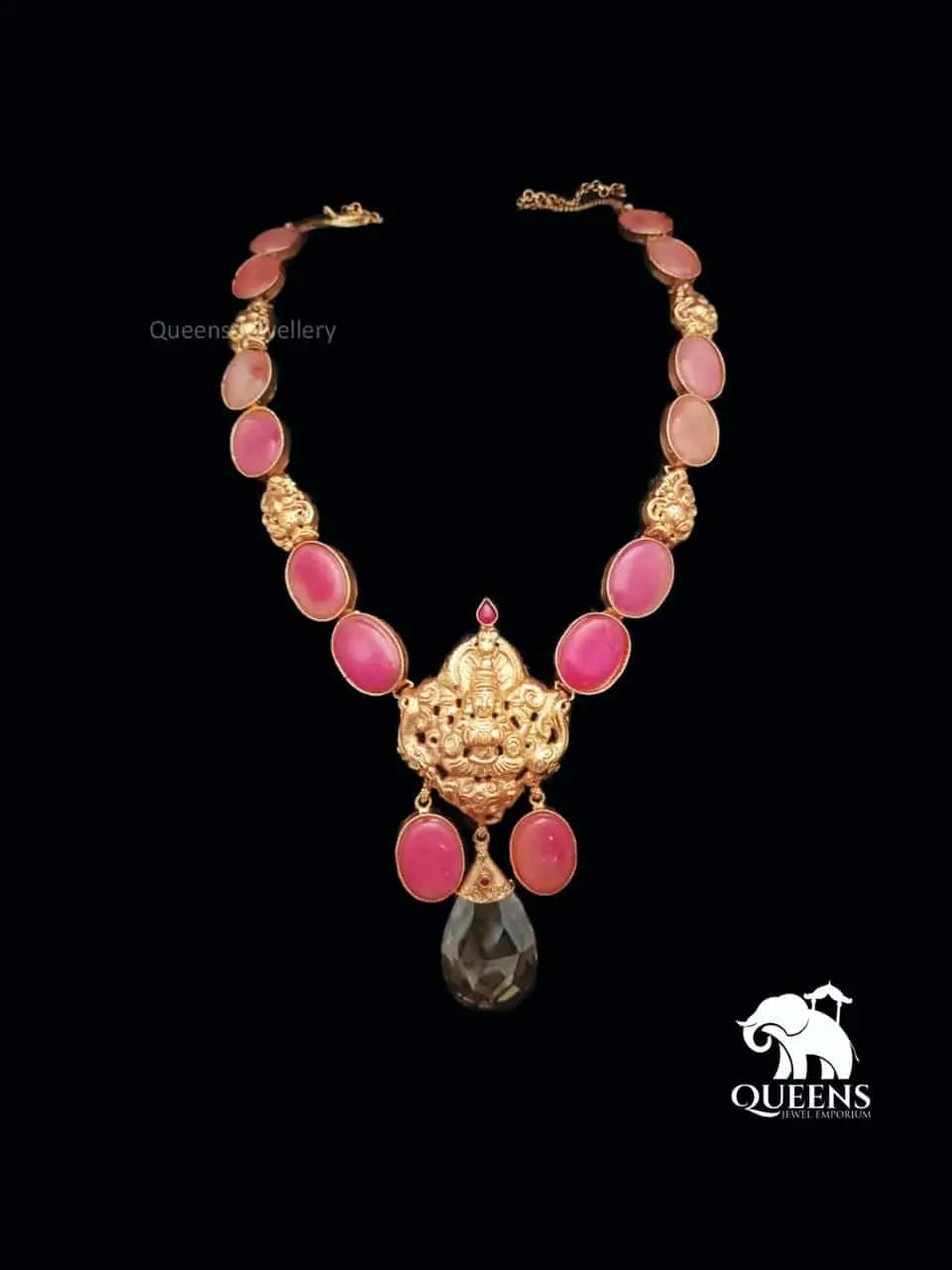 Vibrant and beautiful gemstone haram set with pink tourmaline stones embellished with nahaas pendent and swarovski crystal hanging