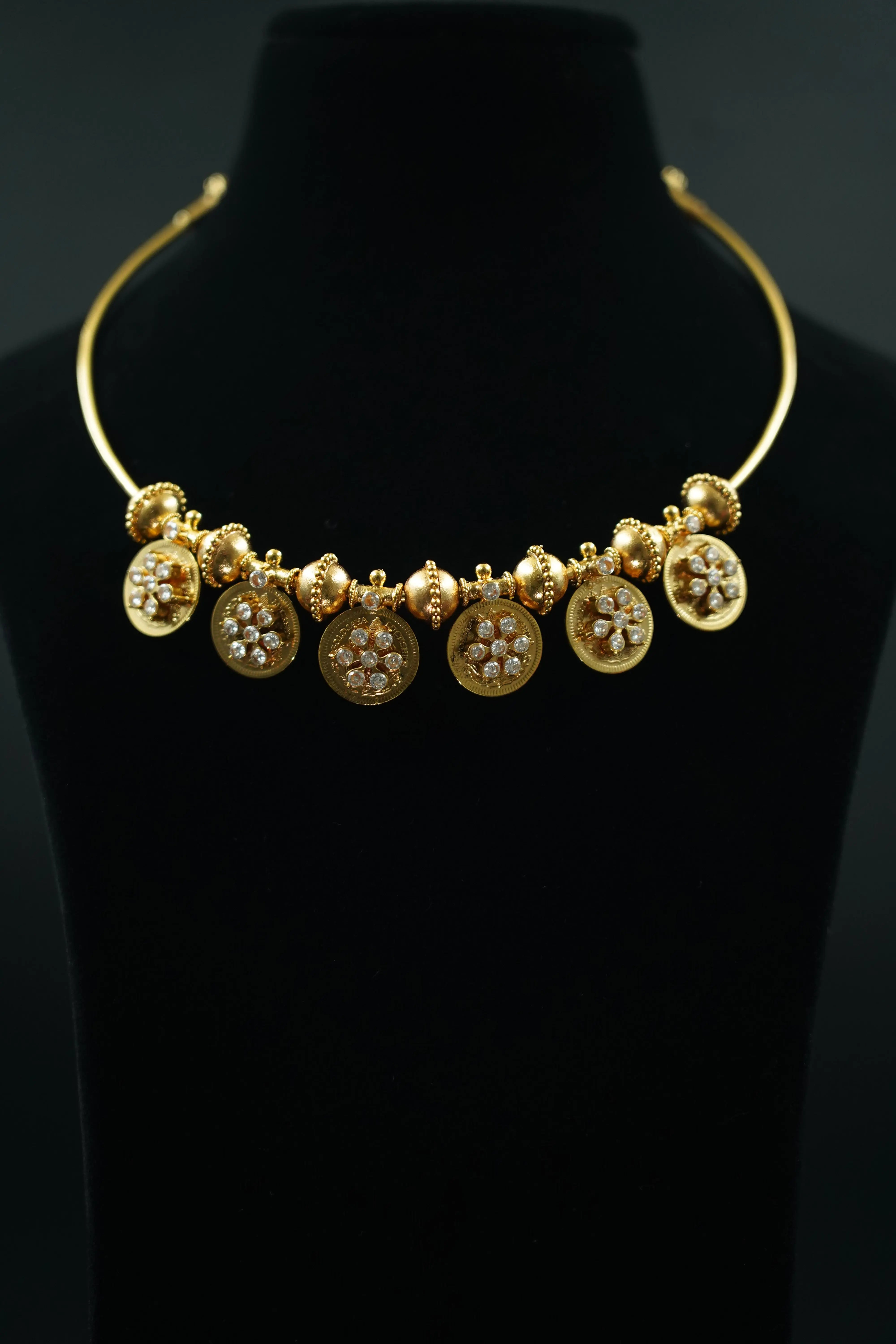This traditional hasli-style Nagas necklace features classic Lakshmi Nagas kasu motifs paired with elegant zircon-studded floral designs. Finished with timeless gold ball accents, it embodies regal South Indian craftsmanship.Rich tradition with refined elegance,Our no-fade, no-tarnish jewels come with a lifetime exchange value.