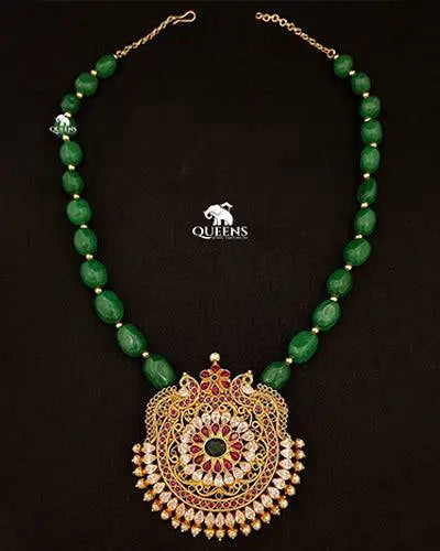 A vibrant and classic onyx beads haramembracing an intricately worked wide pendant with peacocks and embellished with an array of pearls lining the gorgeous pendant. Wear it on beautiful kanjeevarams or bridal sarees to break the monotony and shine in style.