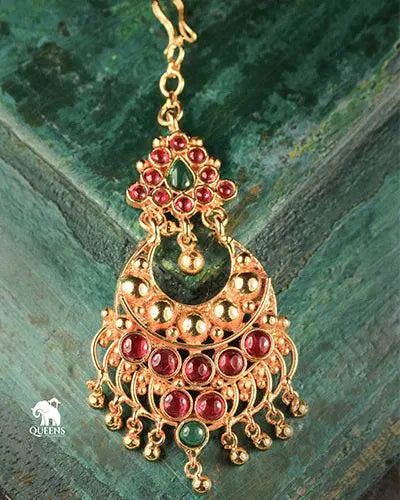 An ornate tammana maang tikka in chandhballi style for a contemporary look to match with your traditional jewellery for the grandeur look.