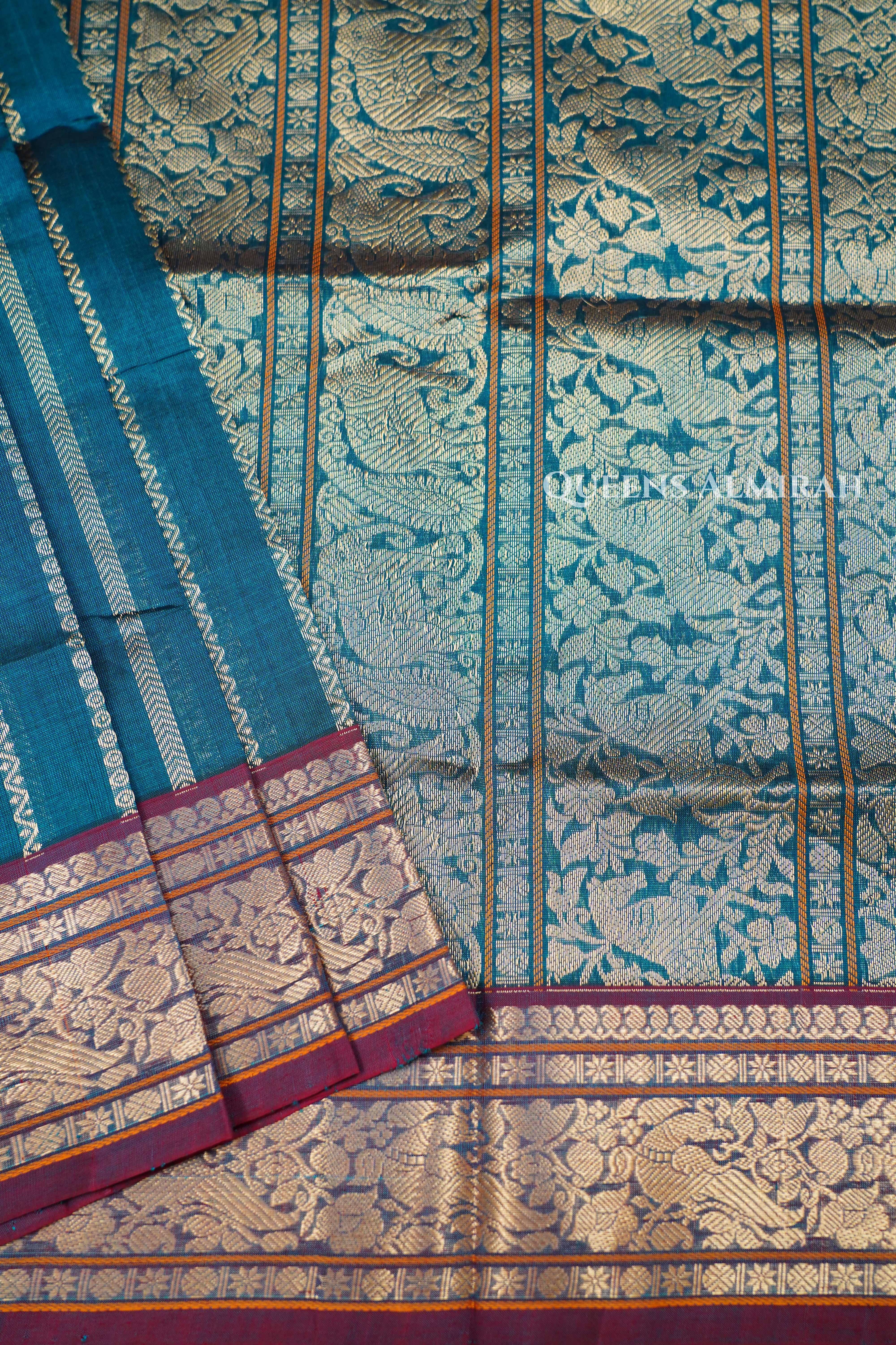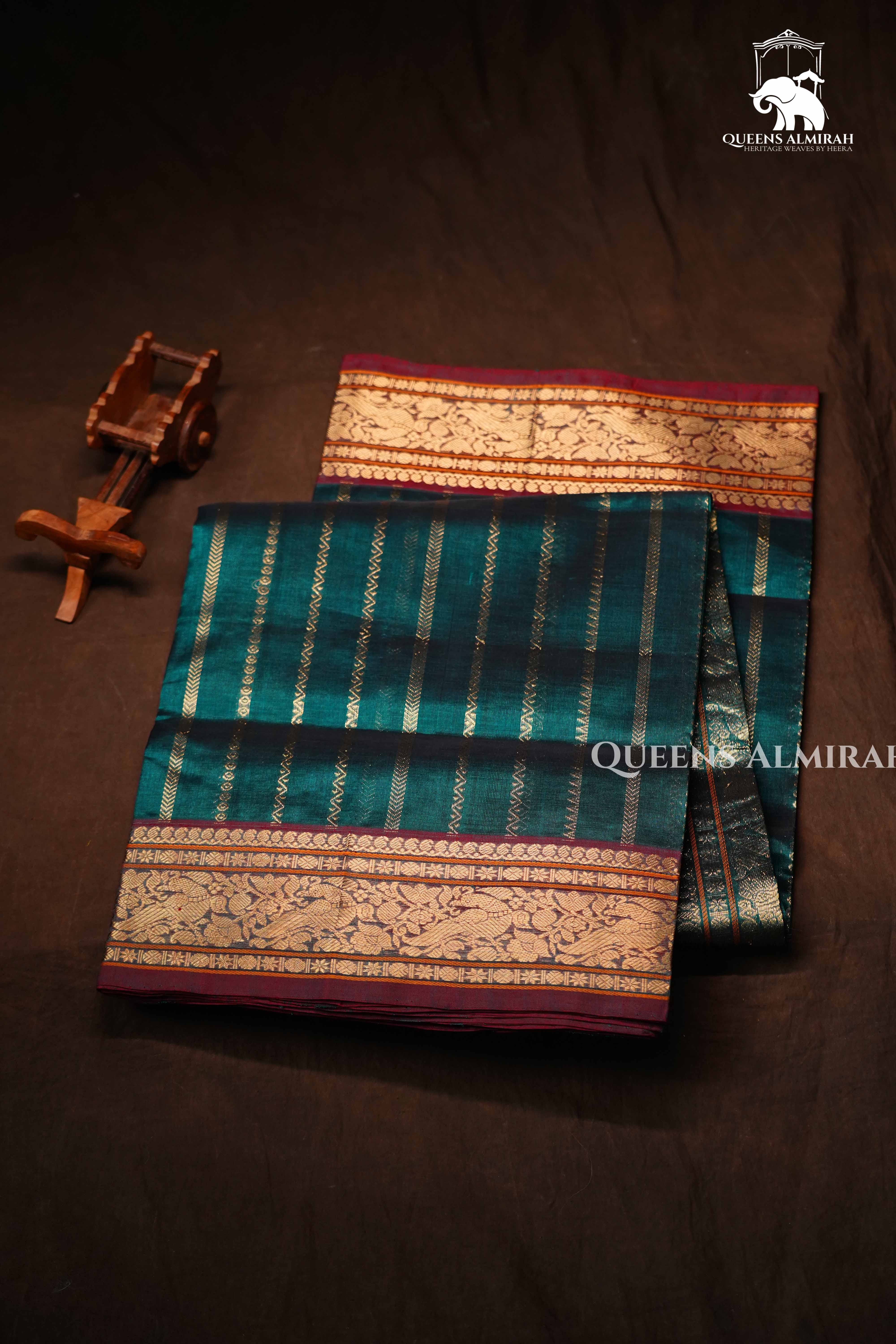 Drape yourself in elegance with this Teal Green Silk cotton Saree featuring Majestic Golden Zari Work. The body is adorned with vertical golden stripes and intricate motifs, complemented by a rich maroon border and pallu with grand floral zari patterns. This timeless masterpiece is perfect for weddings, festive occasions, and cultural celebrations, adding a regal touch to your wardrobe.