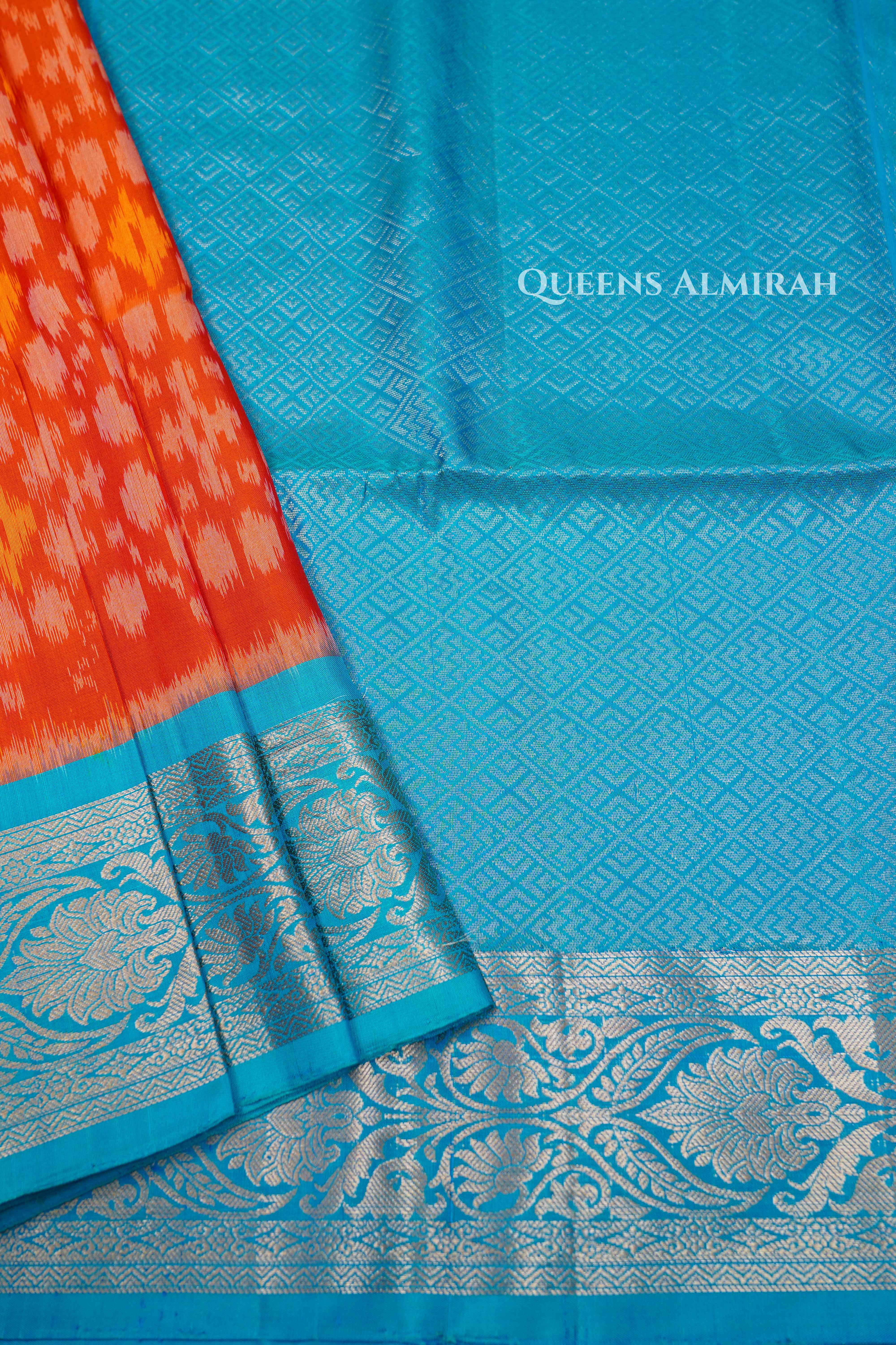 A radiant blend of tradition and artistry, this soft silk saree features a Tomato Red body with striking Ikat-inspired geometric patterns. The Blue and pallu are woven with intricate gold zari paisley and floral motifs, adding timeless grandeur. Perfect for weddings, festive celebrations, and special occasions.