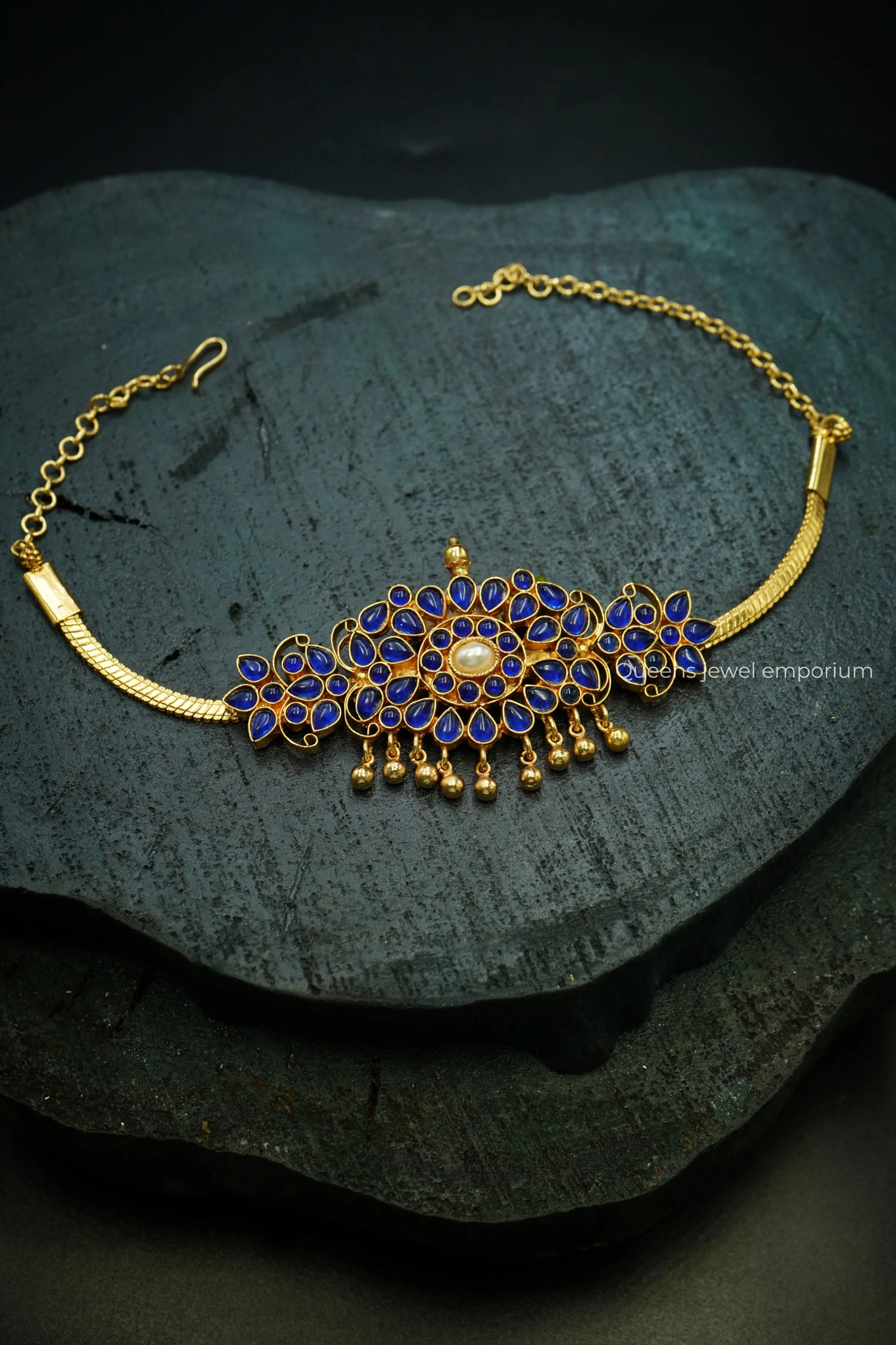 Elevate your style with the UPASANA CHOKER - NAVY BLUE. Handmade with traditional South Indian techniques, this choker is adorned with kemp stones and a pearl center, complemented by gold balls. The perfect blend of sophistication and cultural heritage, all in one exquisite piece of gold-plated and silver jewelry.