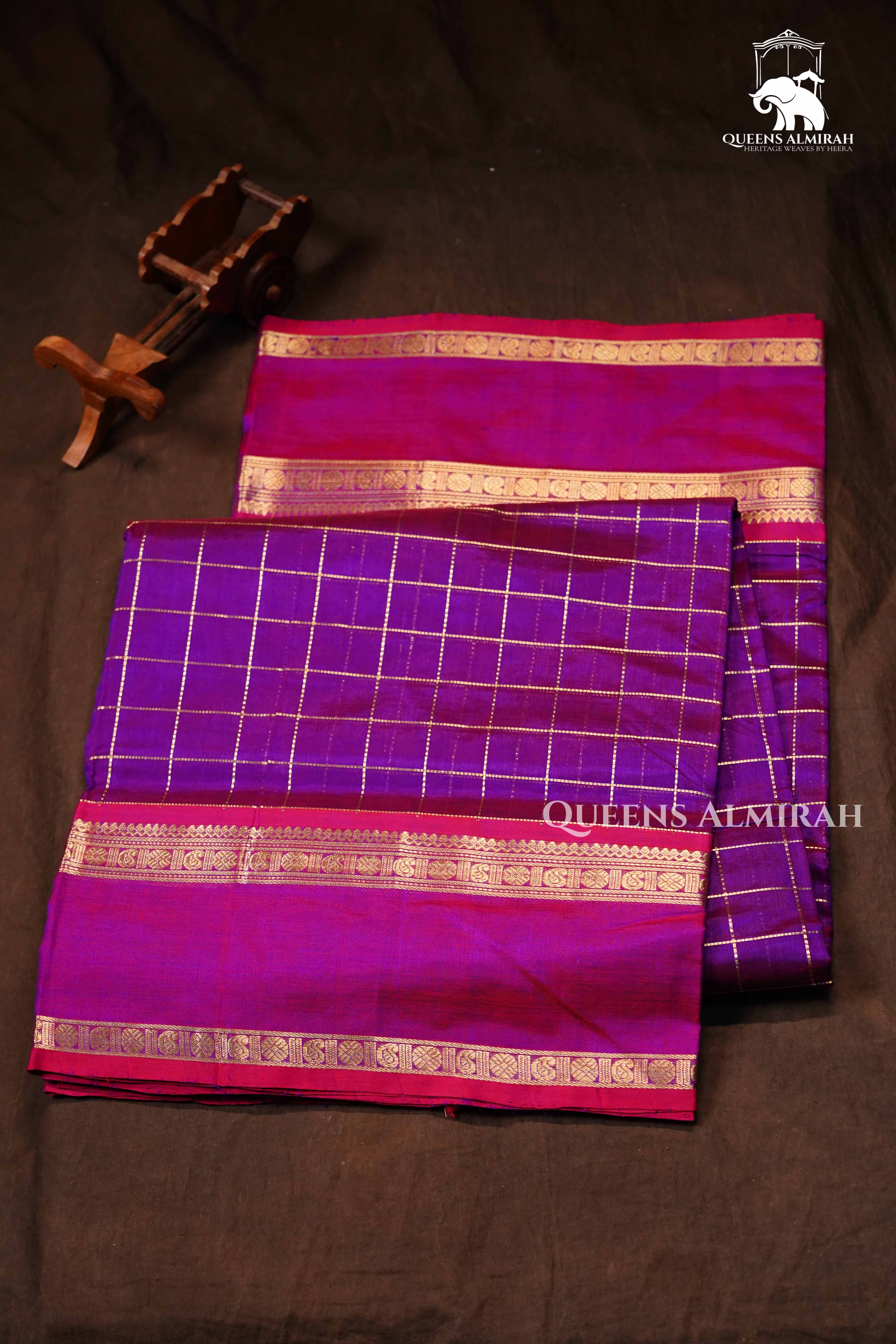 “An elegant Vadamalli Purple Chettinad silk cotton saree featuring classic golden checks and a rich zari border, blending traditional charm with timeless grace.”