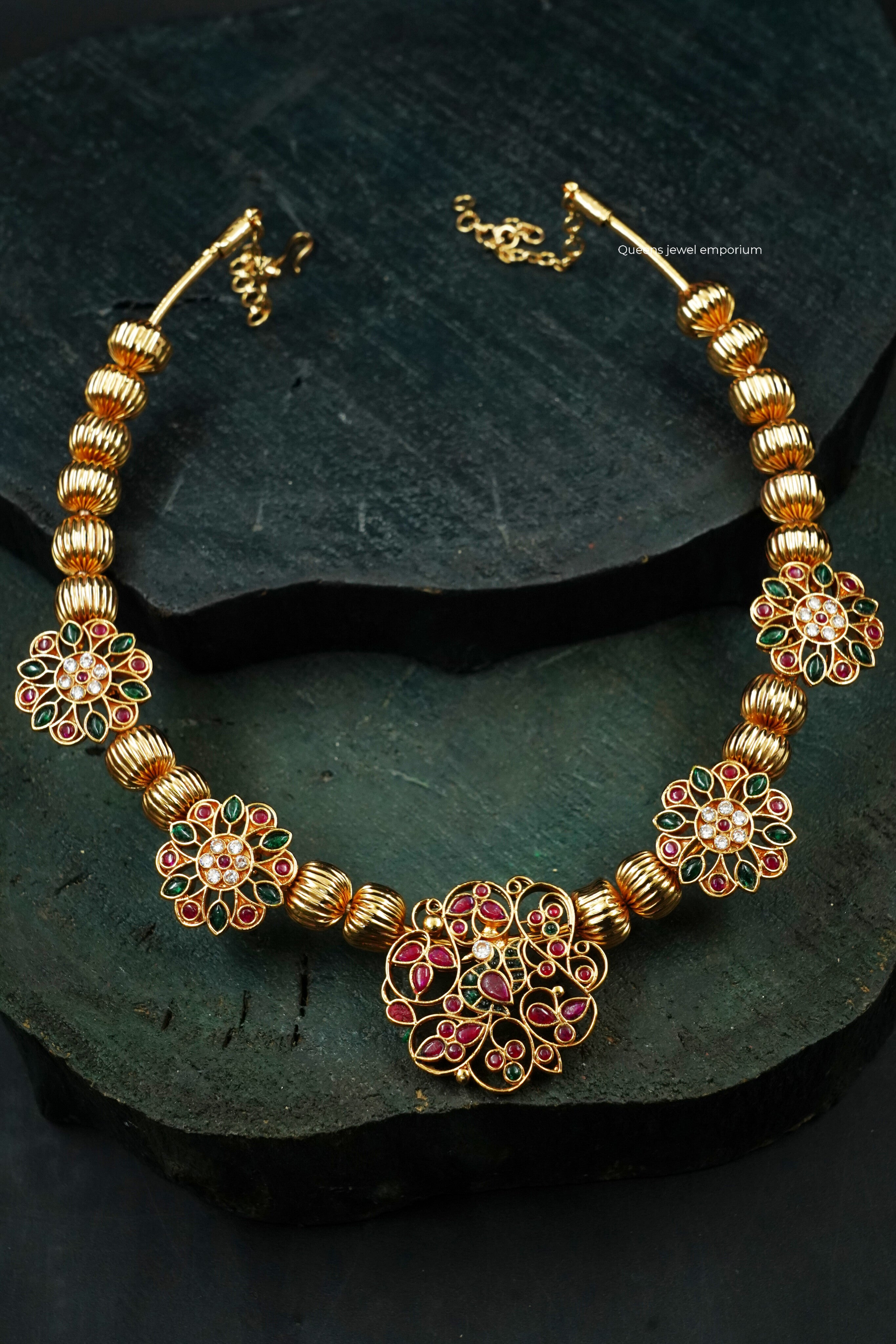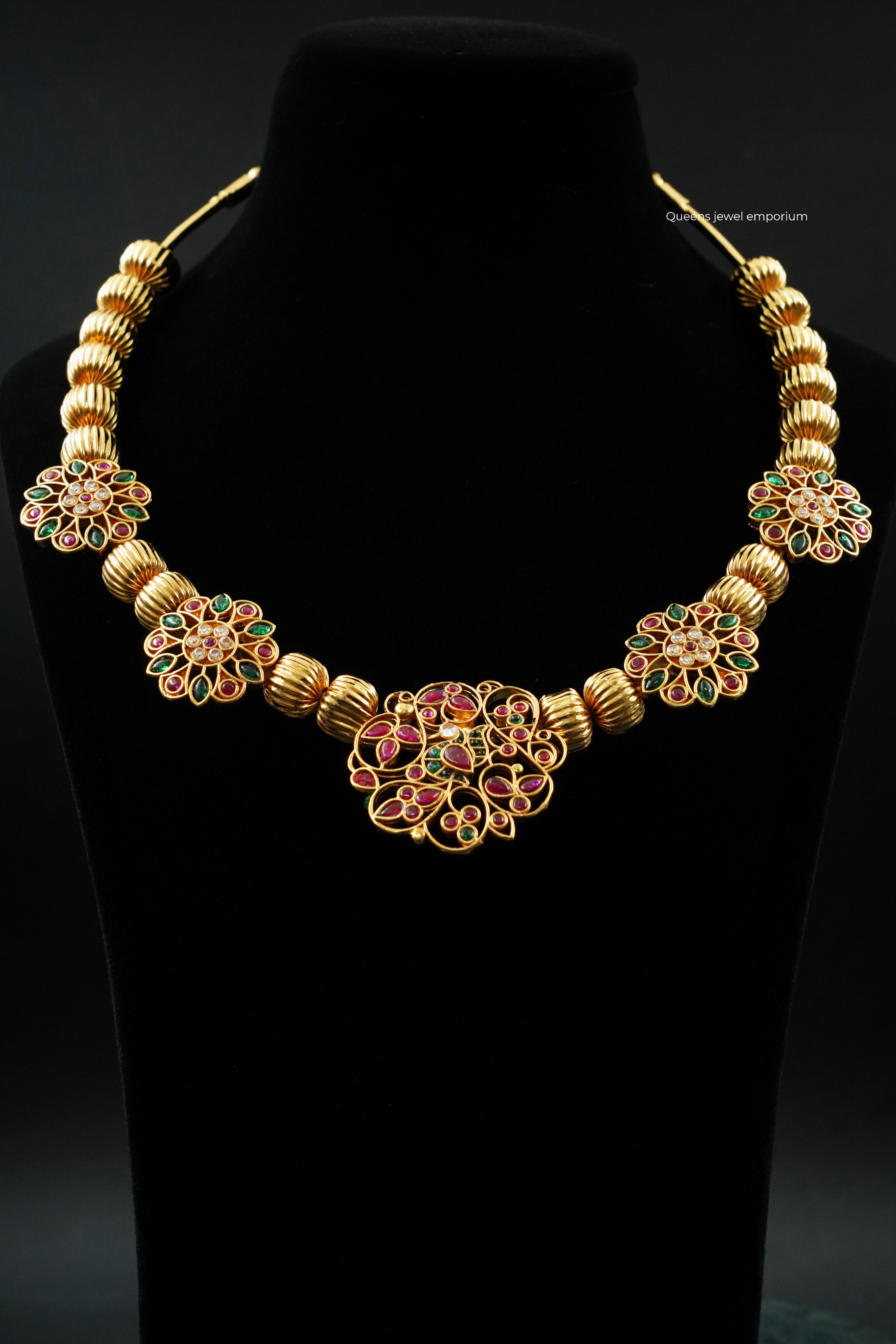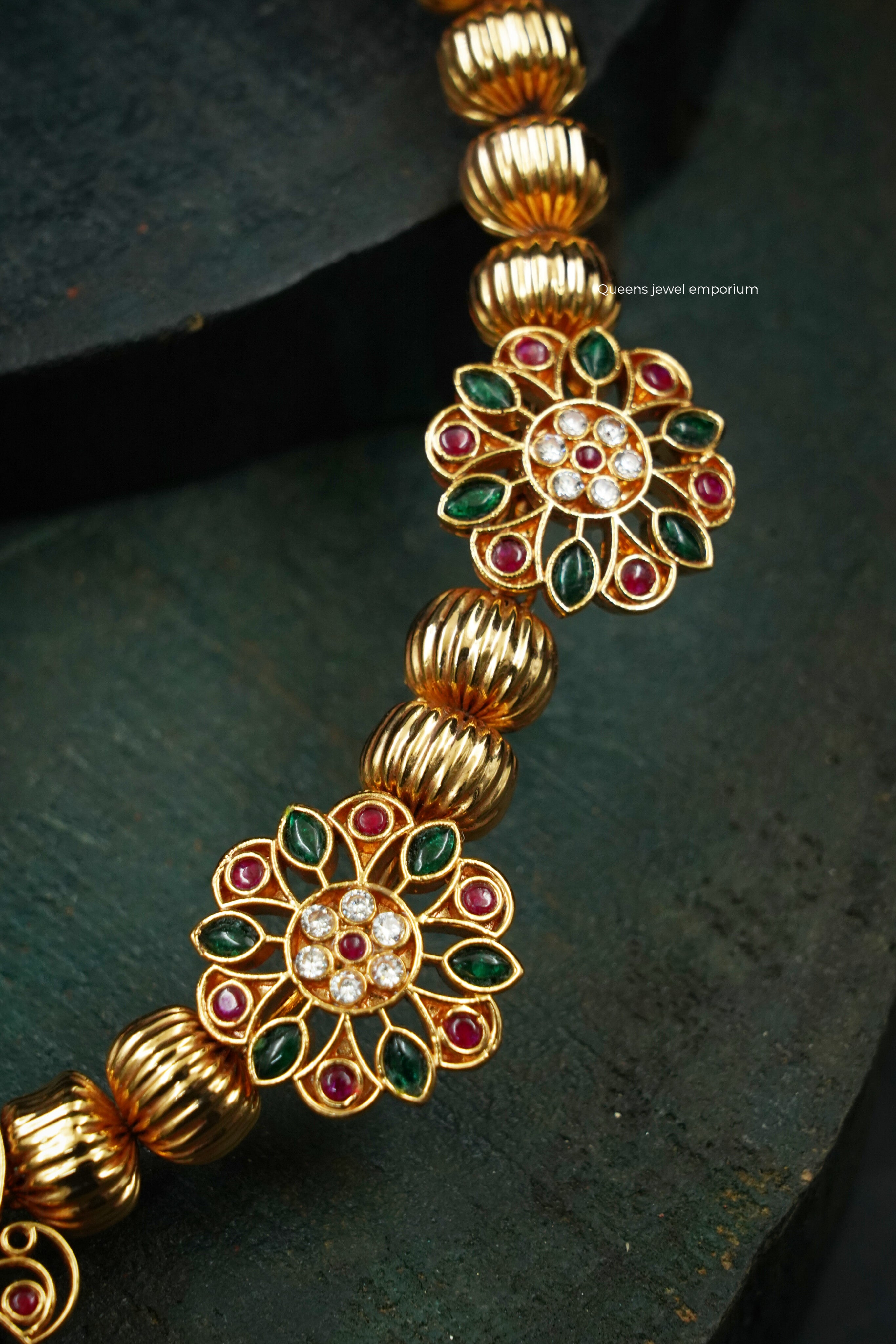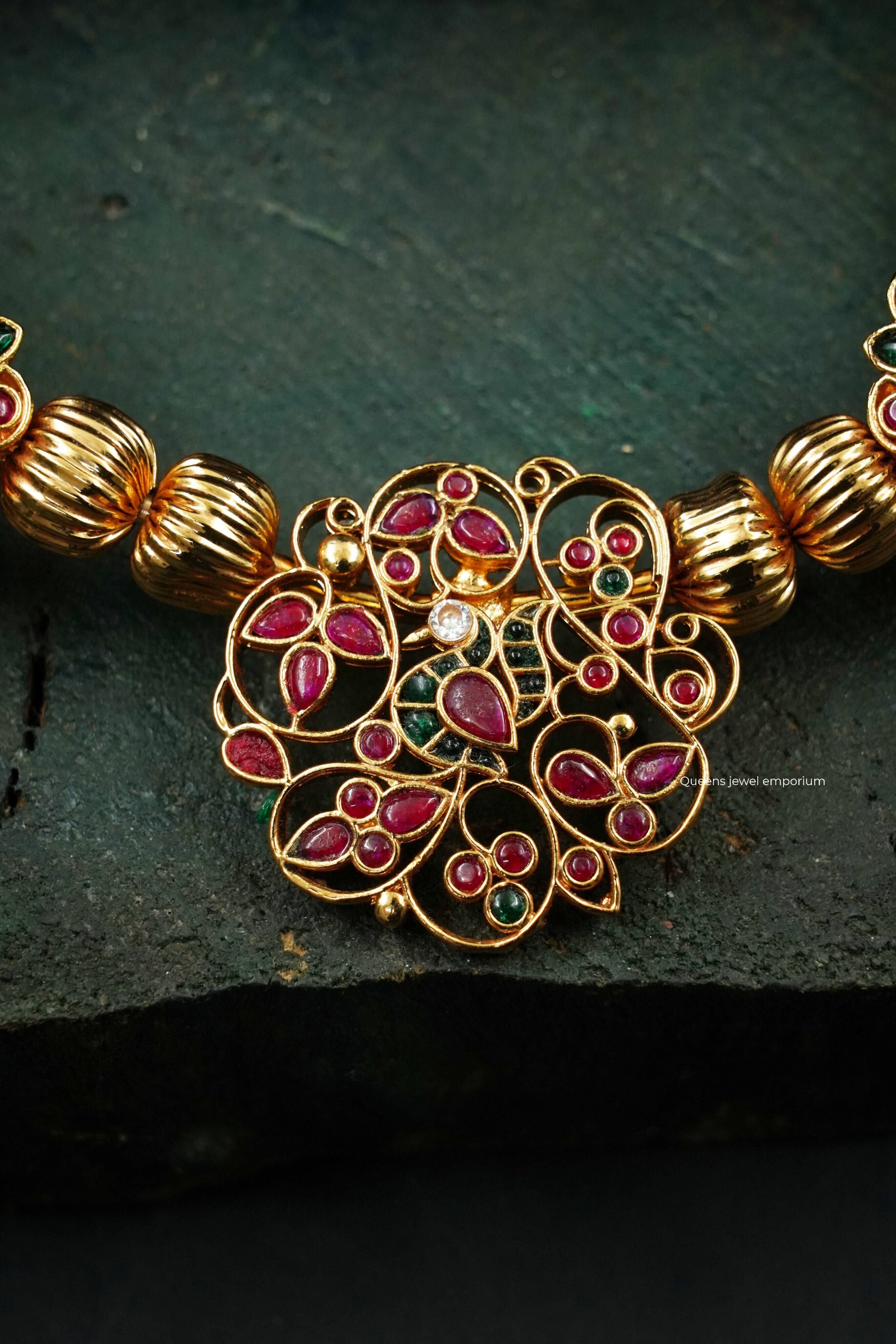 Designed in a round silhouette, this pendant features shimmering zircons with Balaji pink stones, a striking green stone at the center, and four flower motifs around the frame. Finished with traditional karai balls, it offers a perfect balance of heritage detail and versatile elegance—handcrafted by Queens Jewel Emporium.